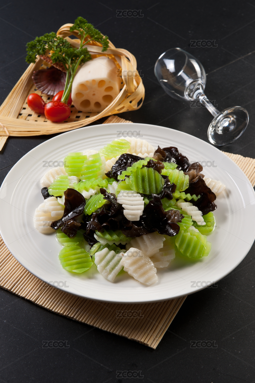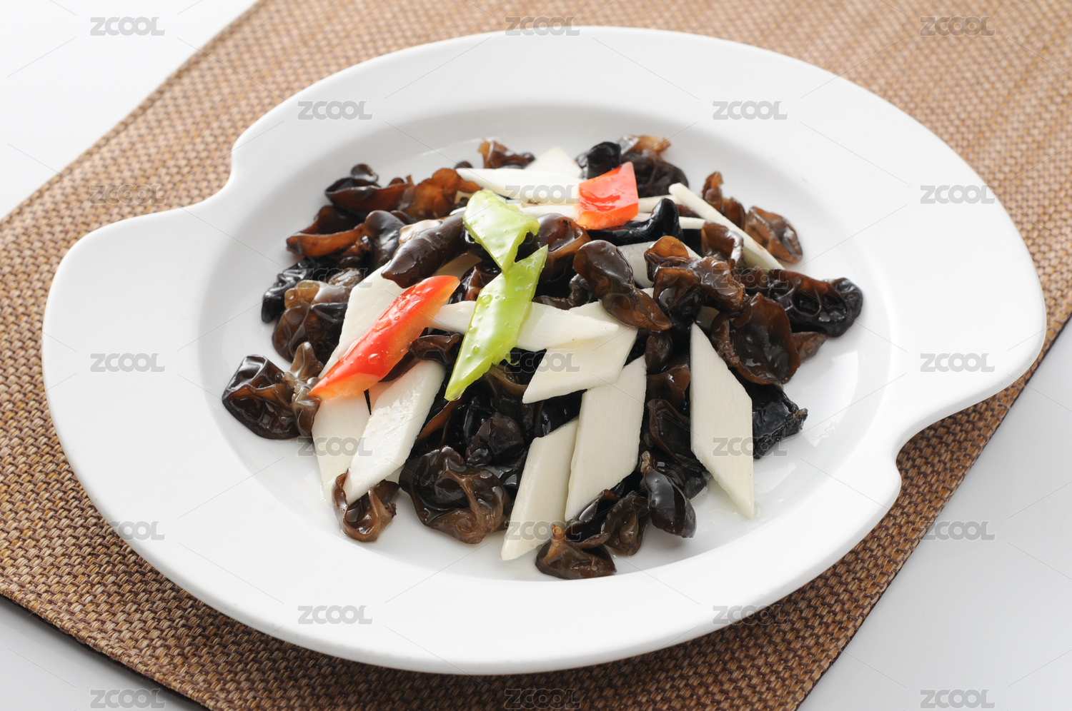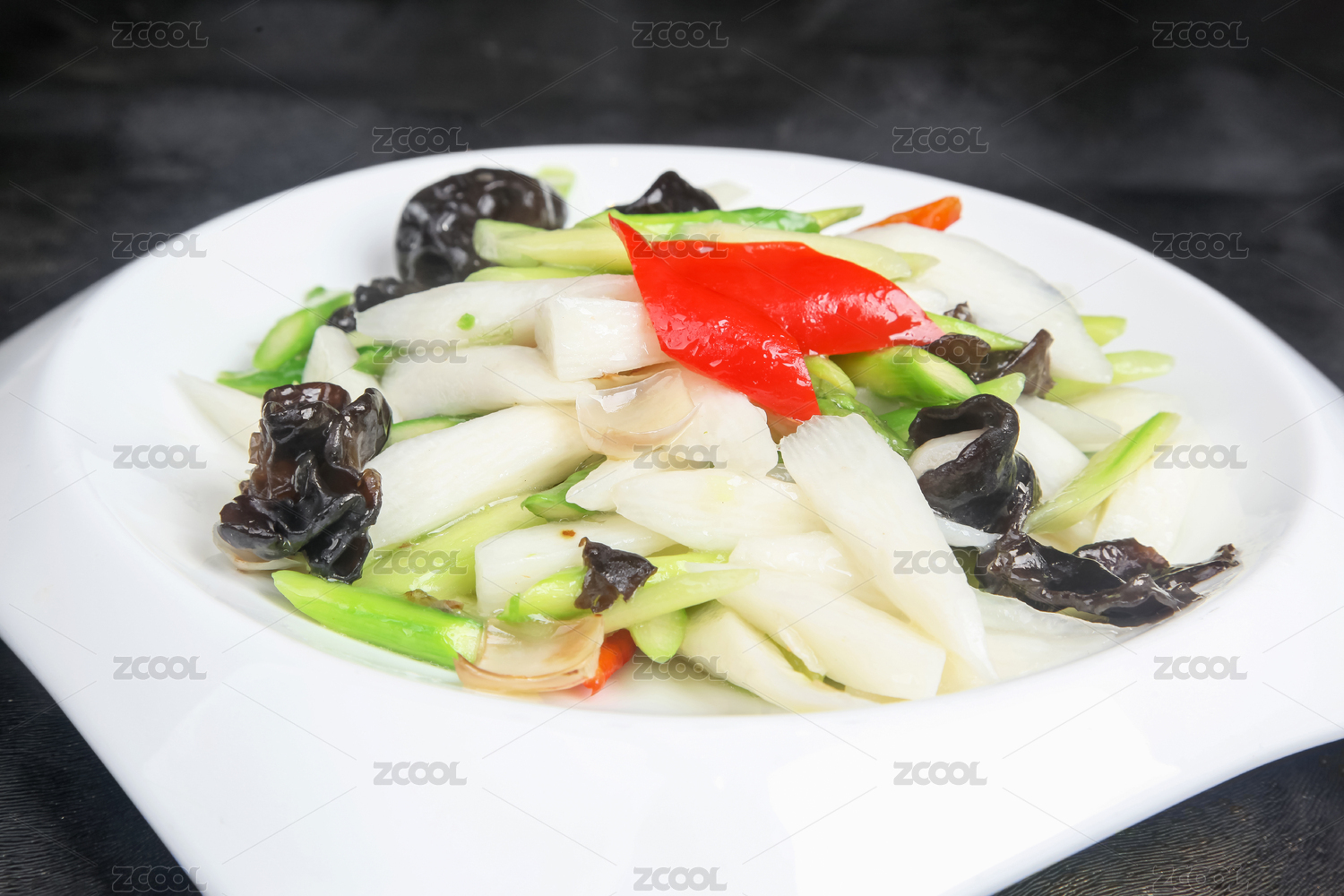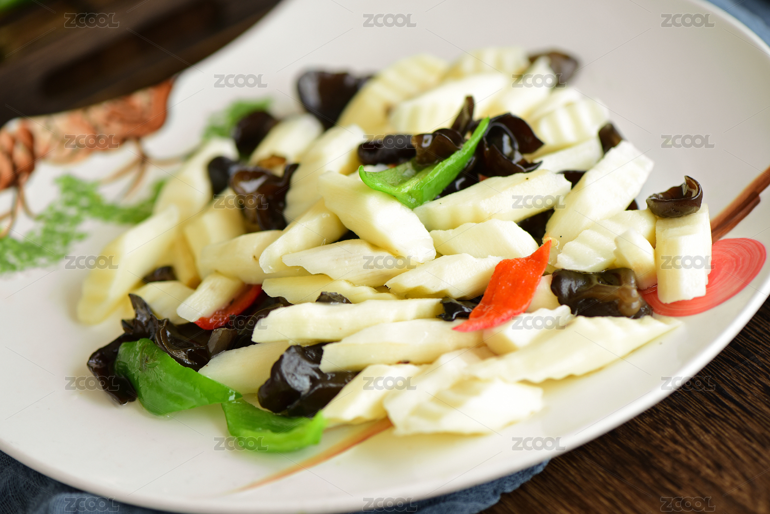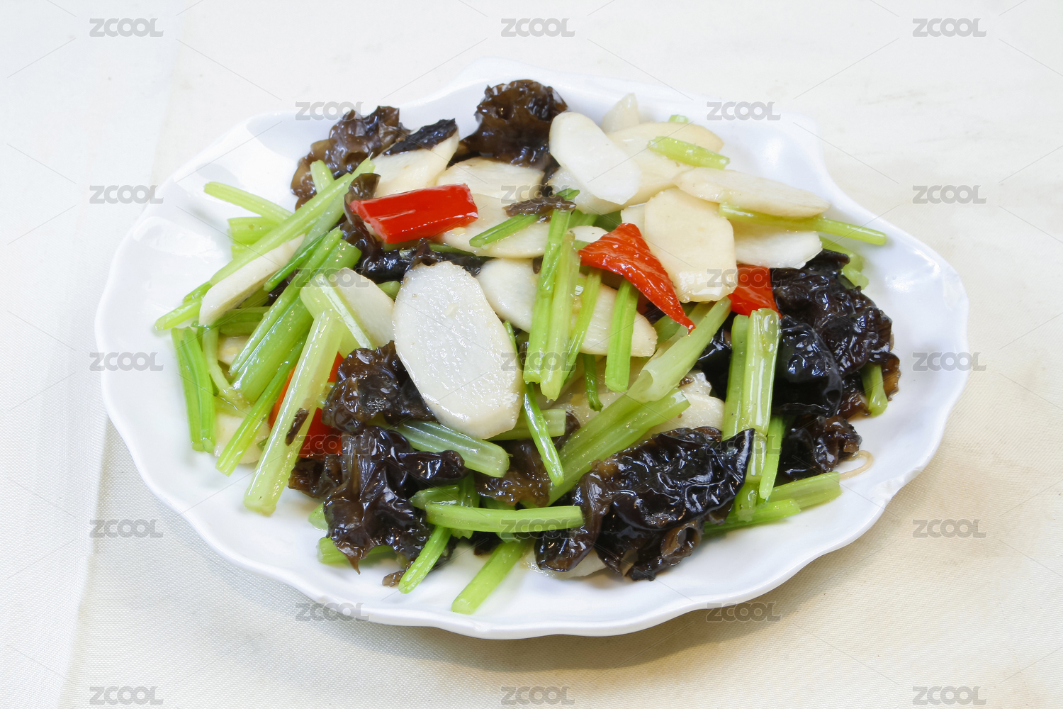 高腳白盤里的山藥炒木耳