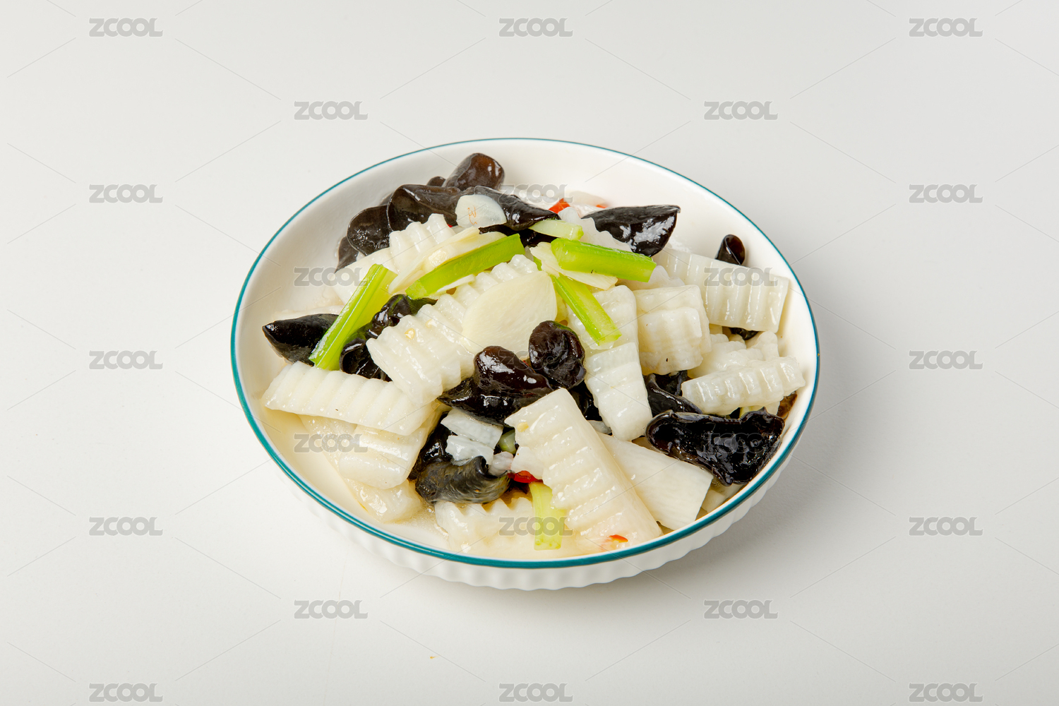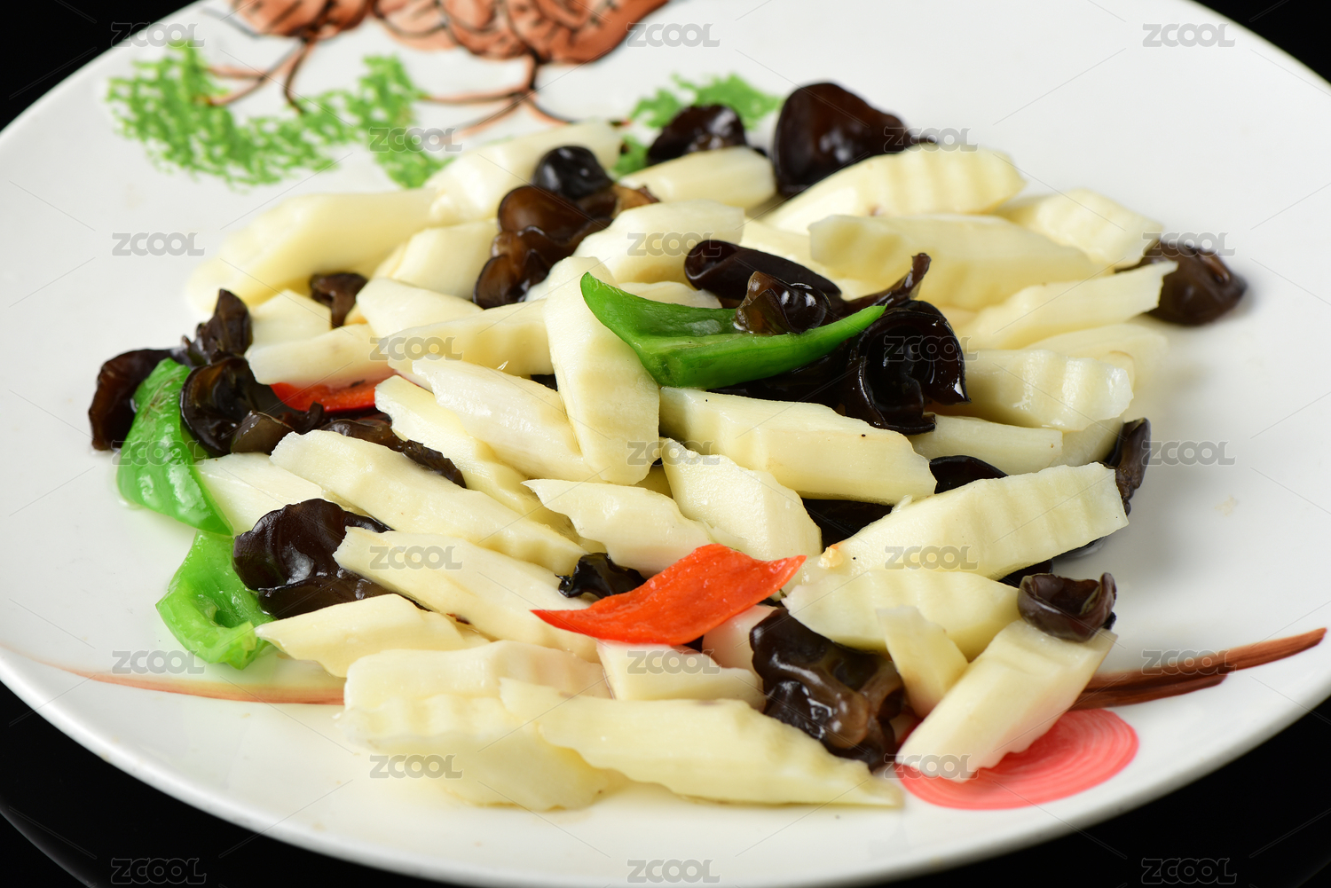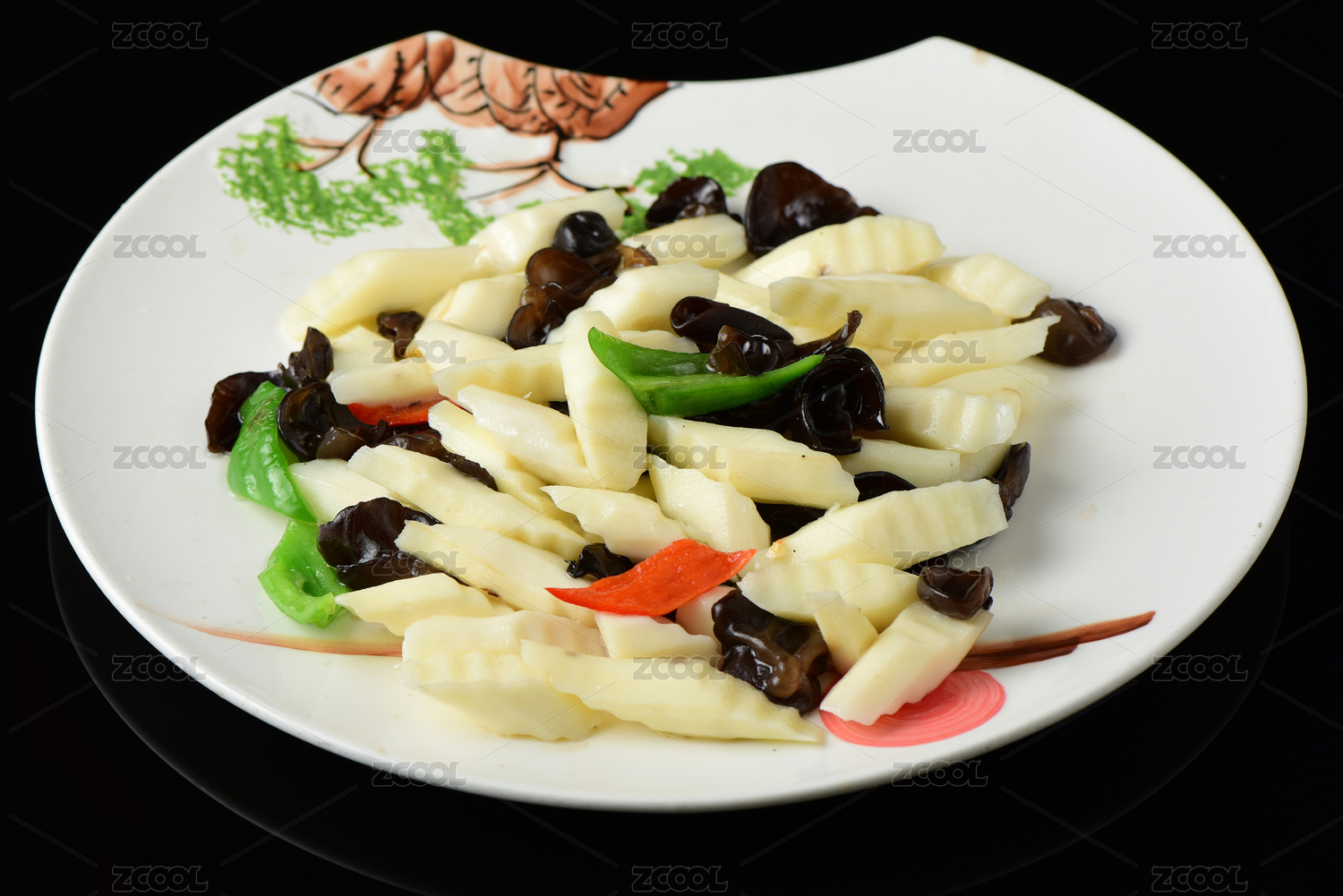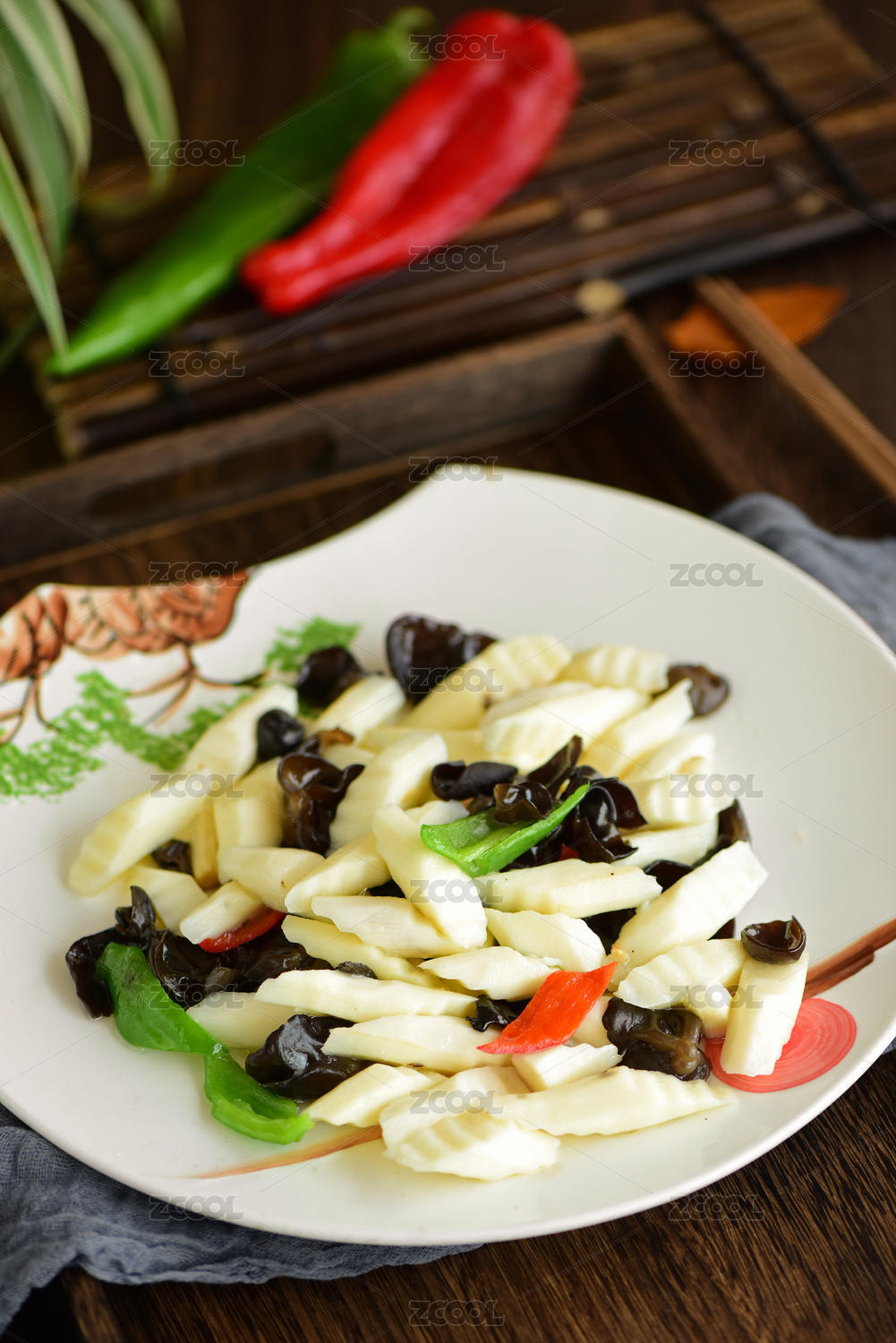 高腳白盤里的山藥炒木耳