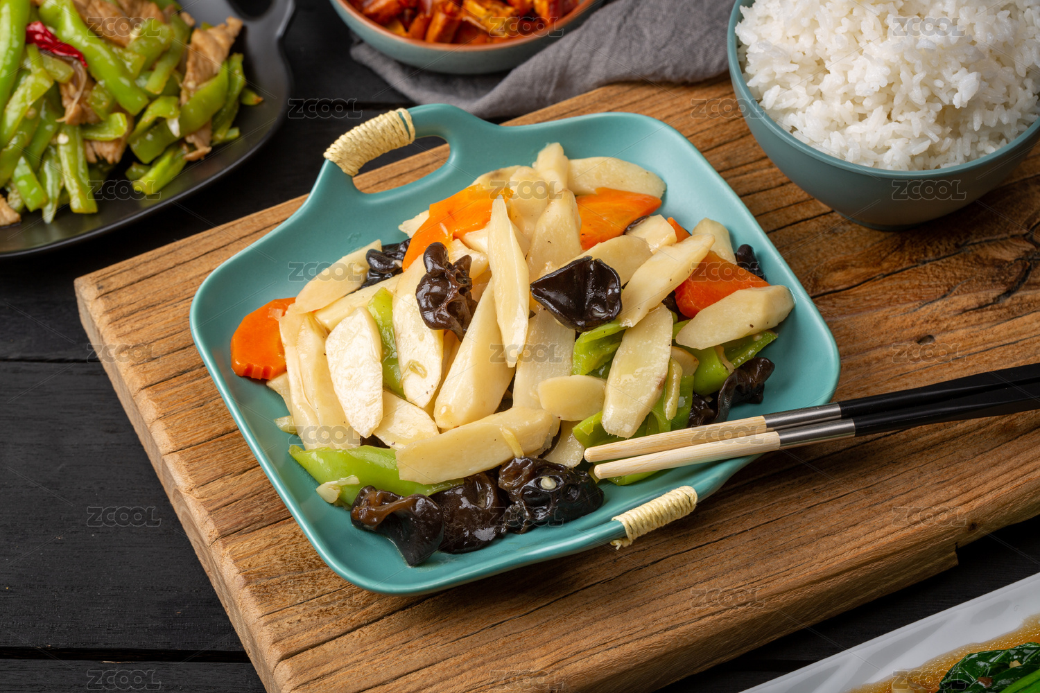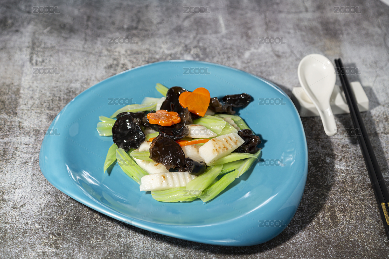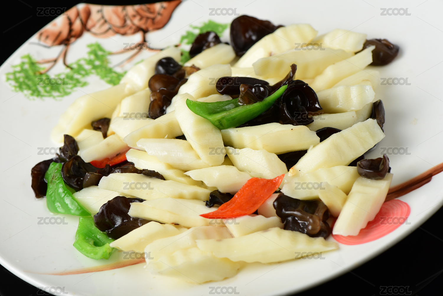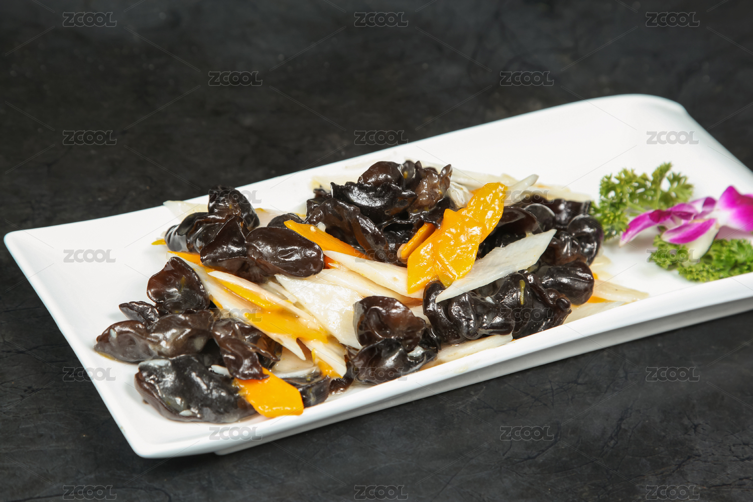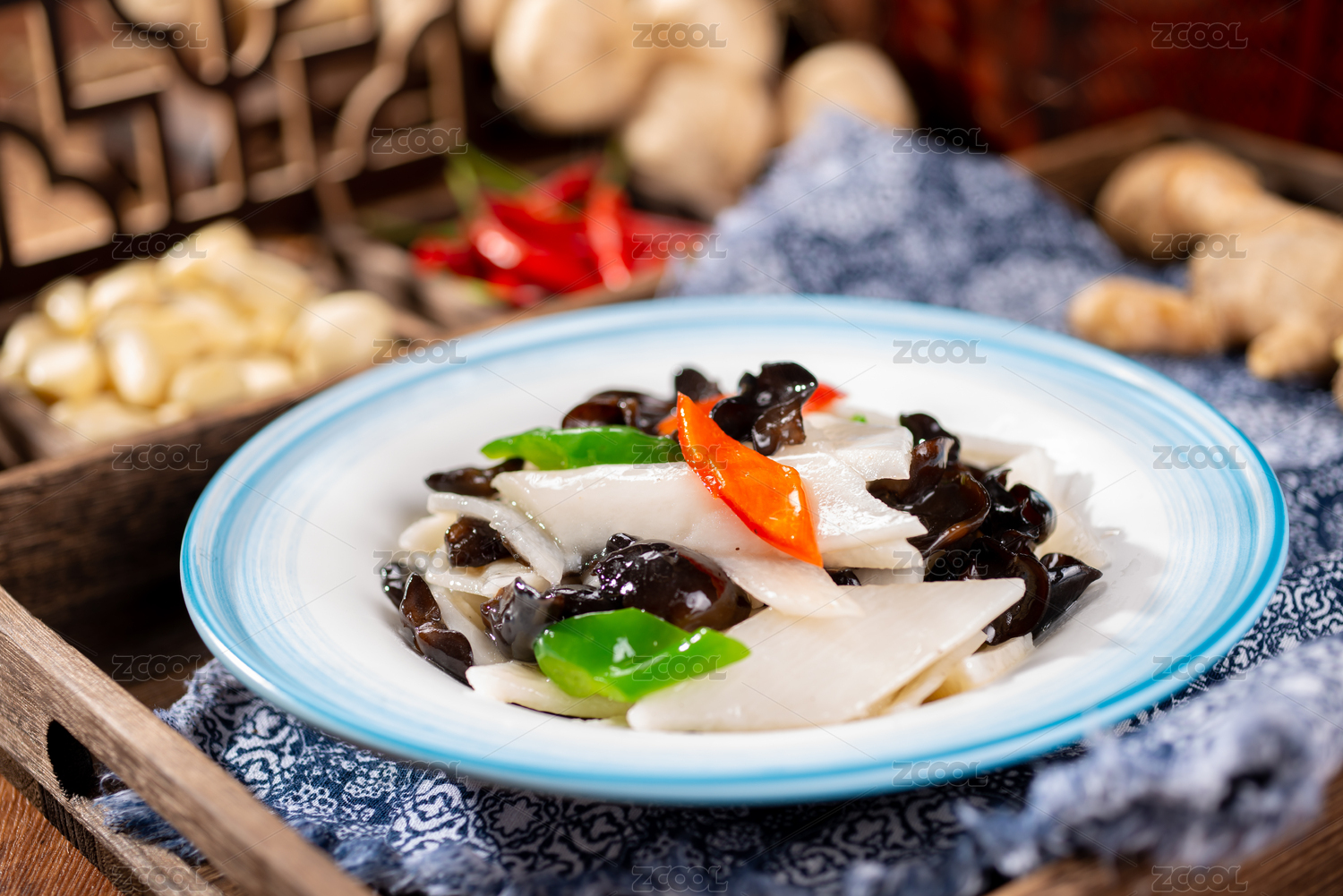 高腳白盤里的山藥炒木耳