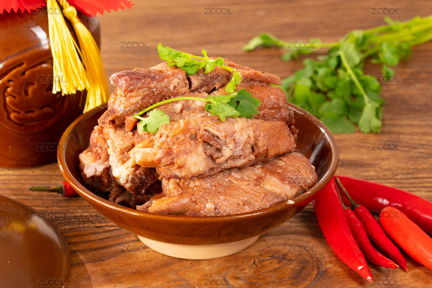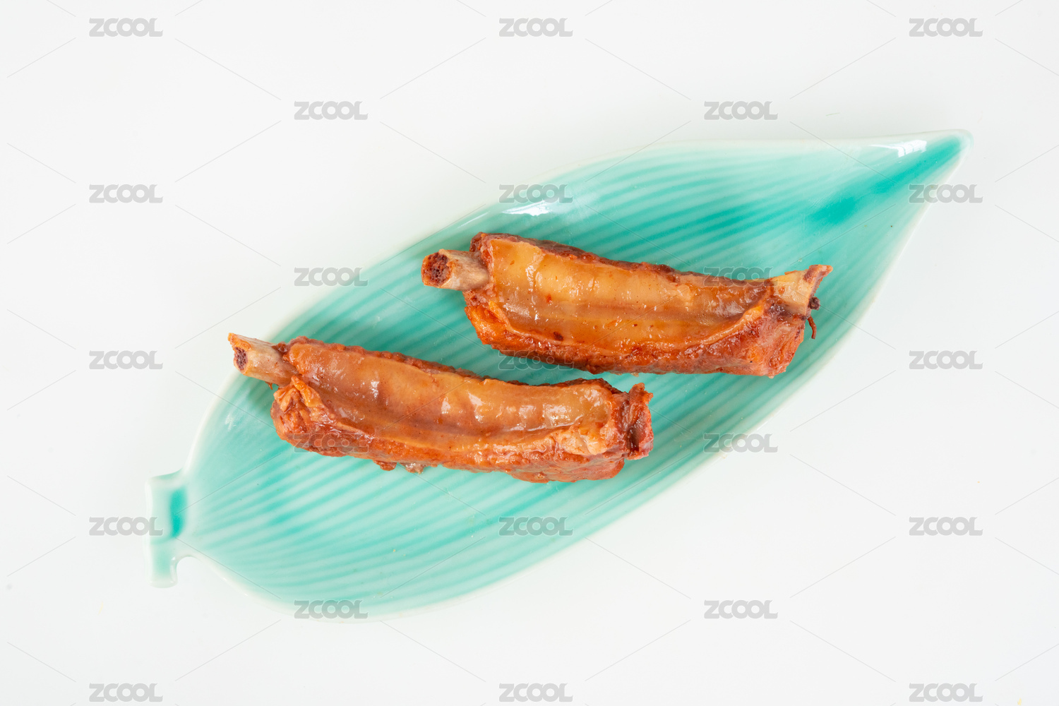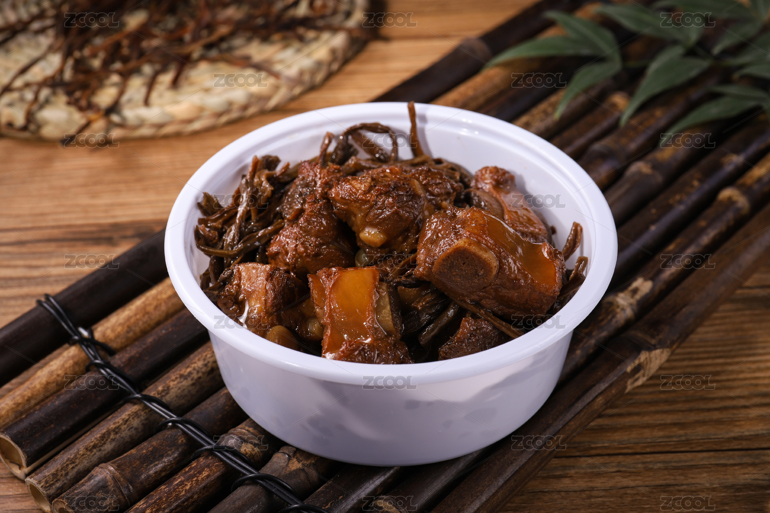 木托盤(pán)上白色瓷盤(pán)中的干燒排骨