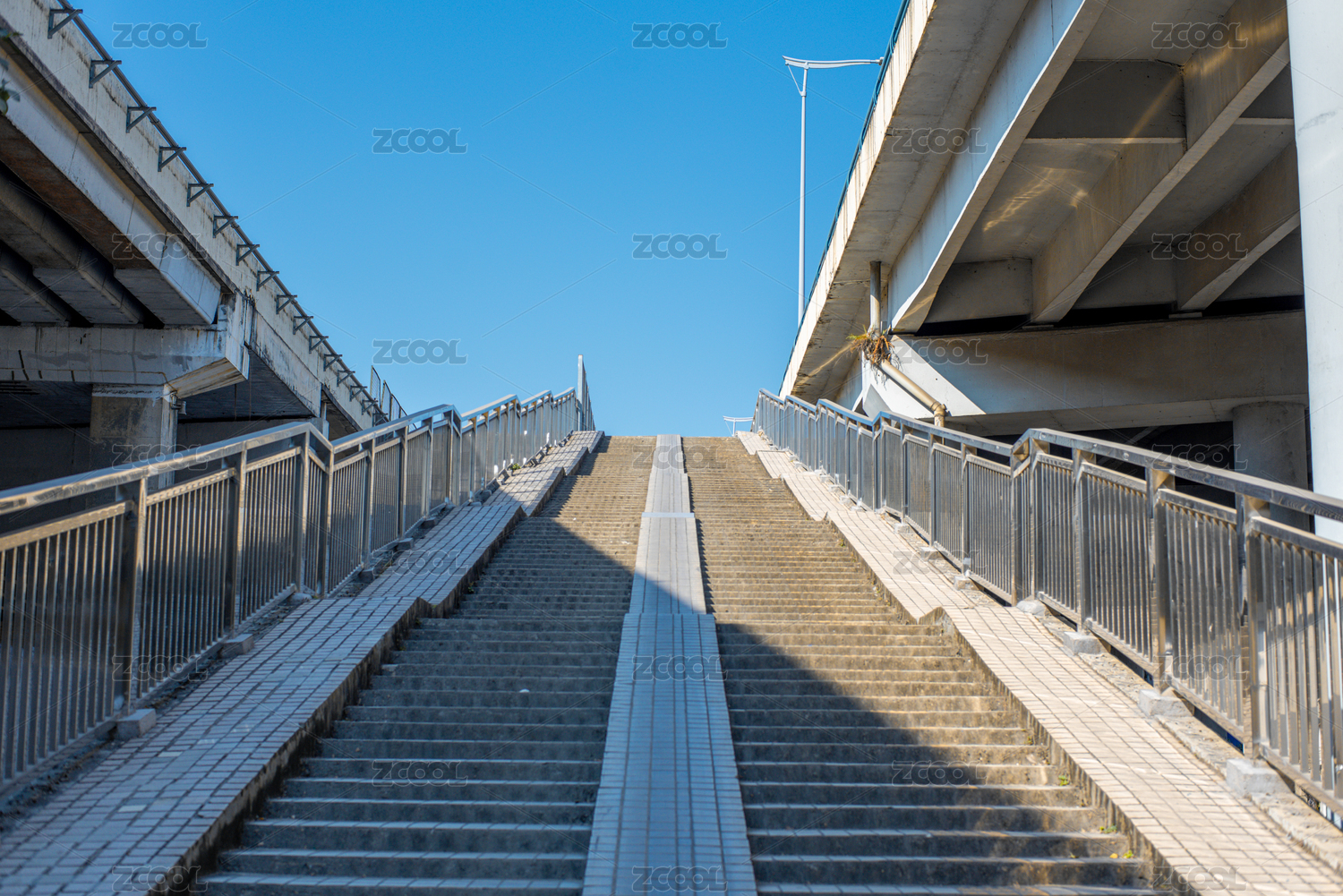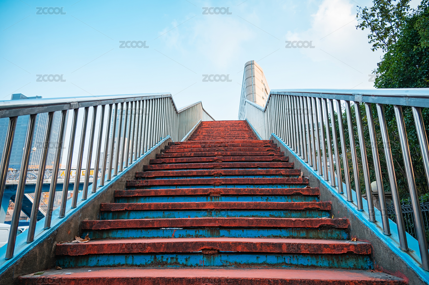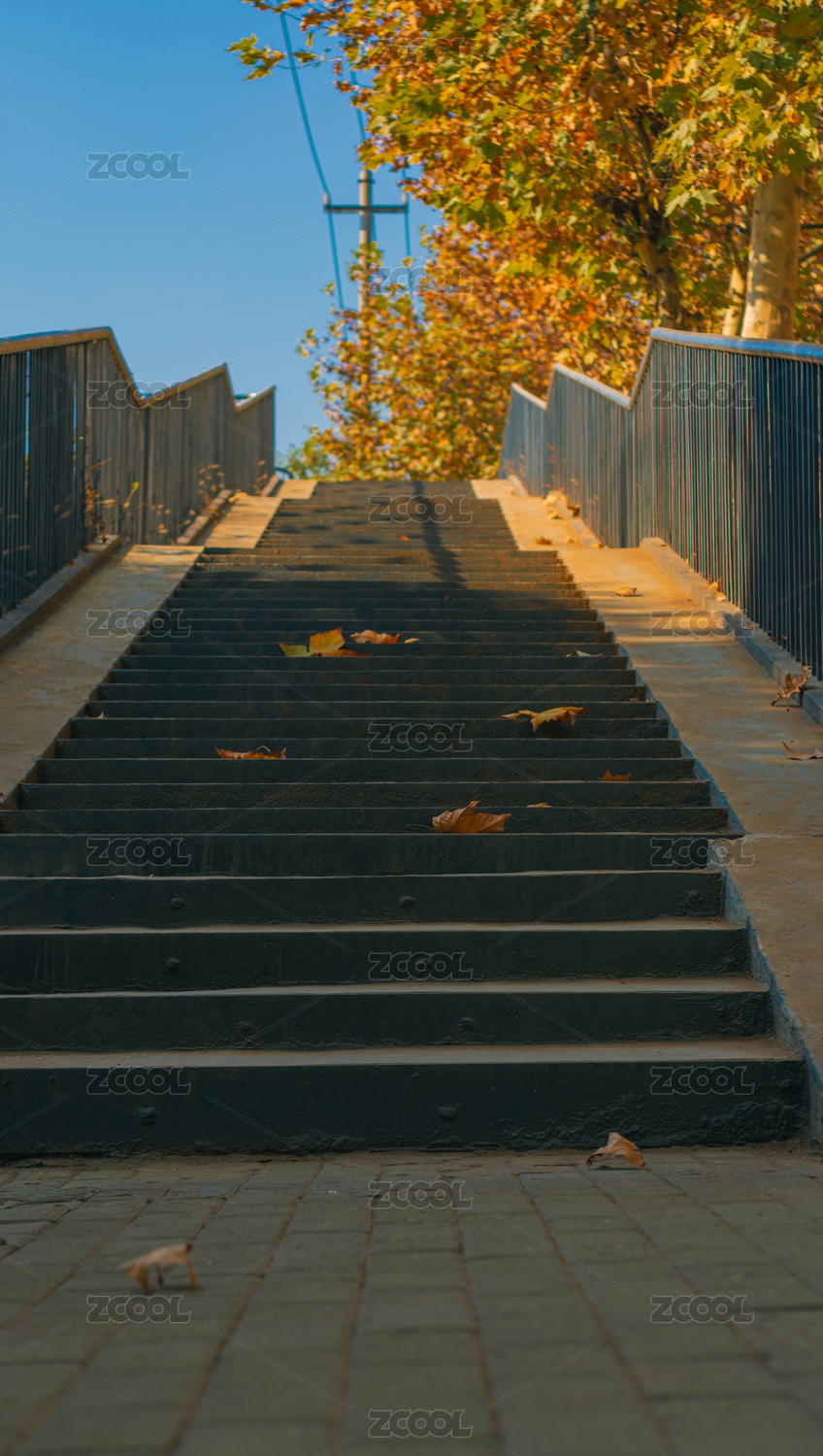 秋天周末陽光下仰拍空無一人的人行天橋樓梯黃