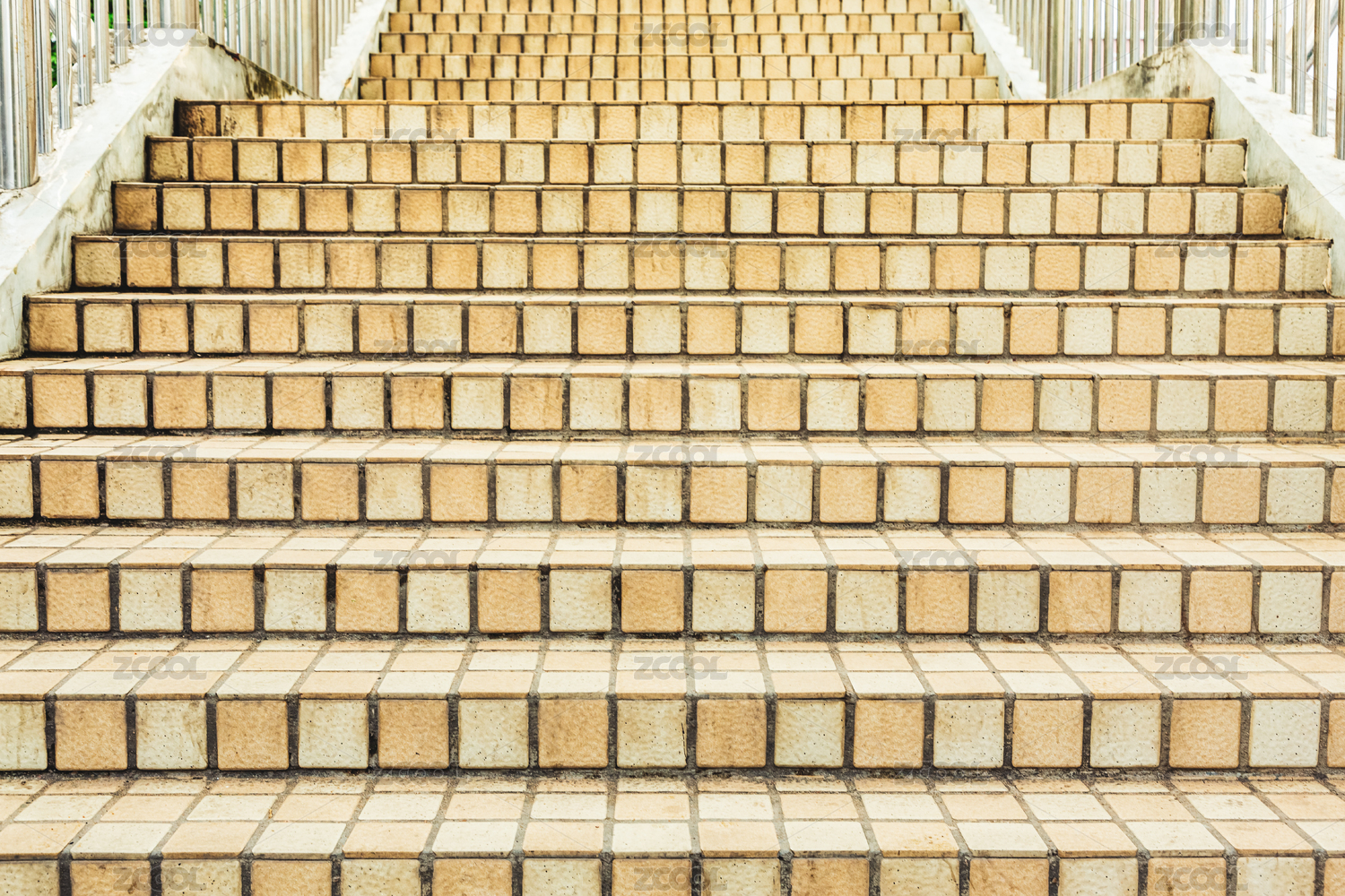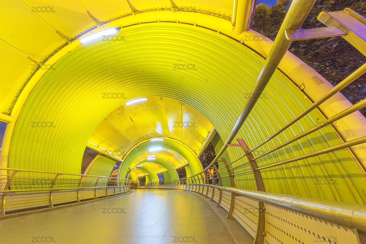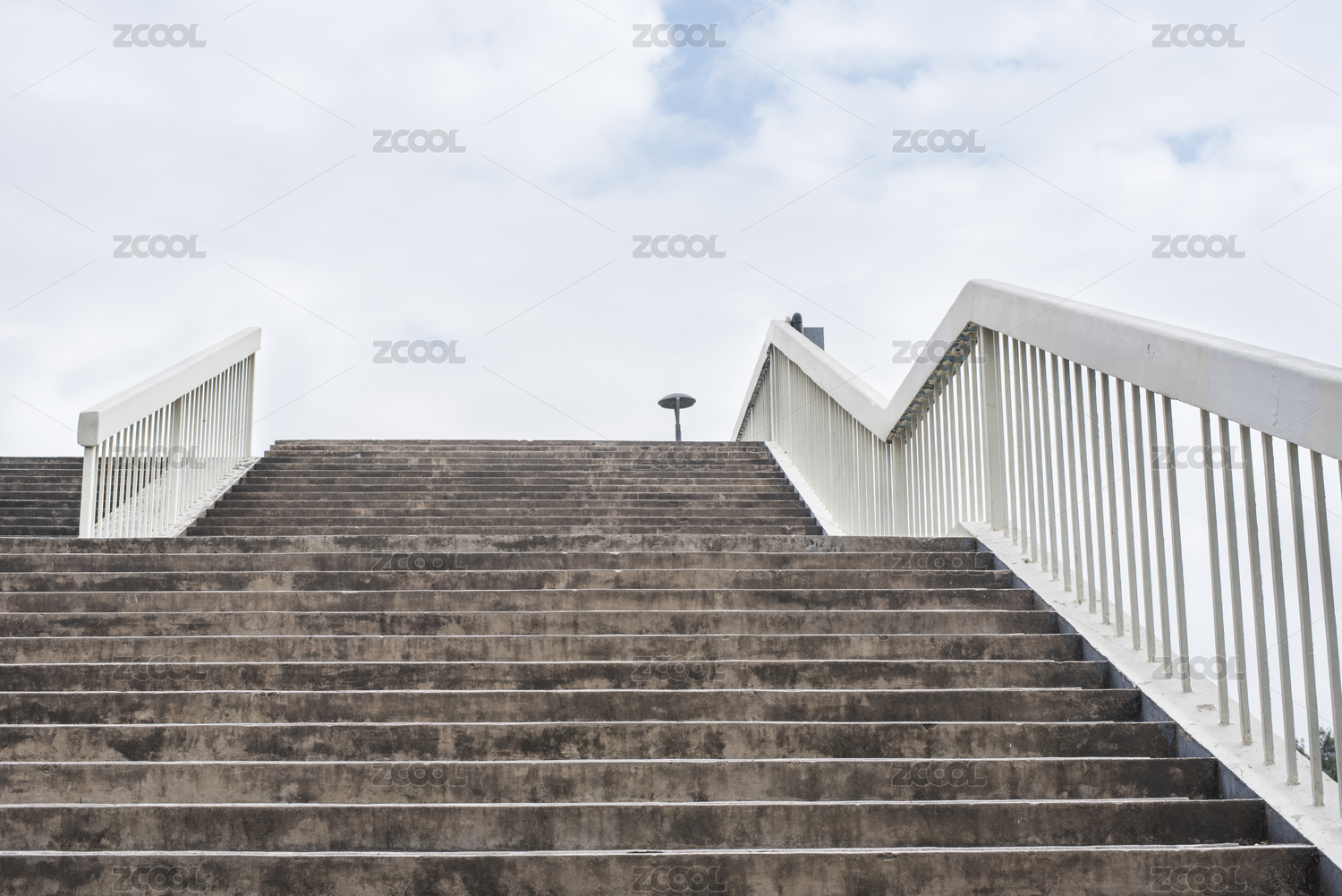 秋天周末陽光下仰拍空無一人的人行天橋樓梯黃