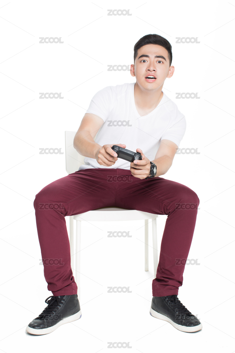 白色背景,青年男子使用游戲手柄玩電子游戲