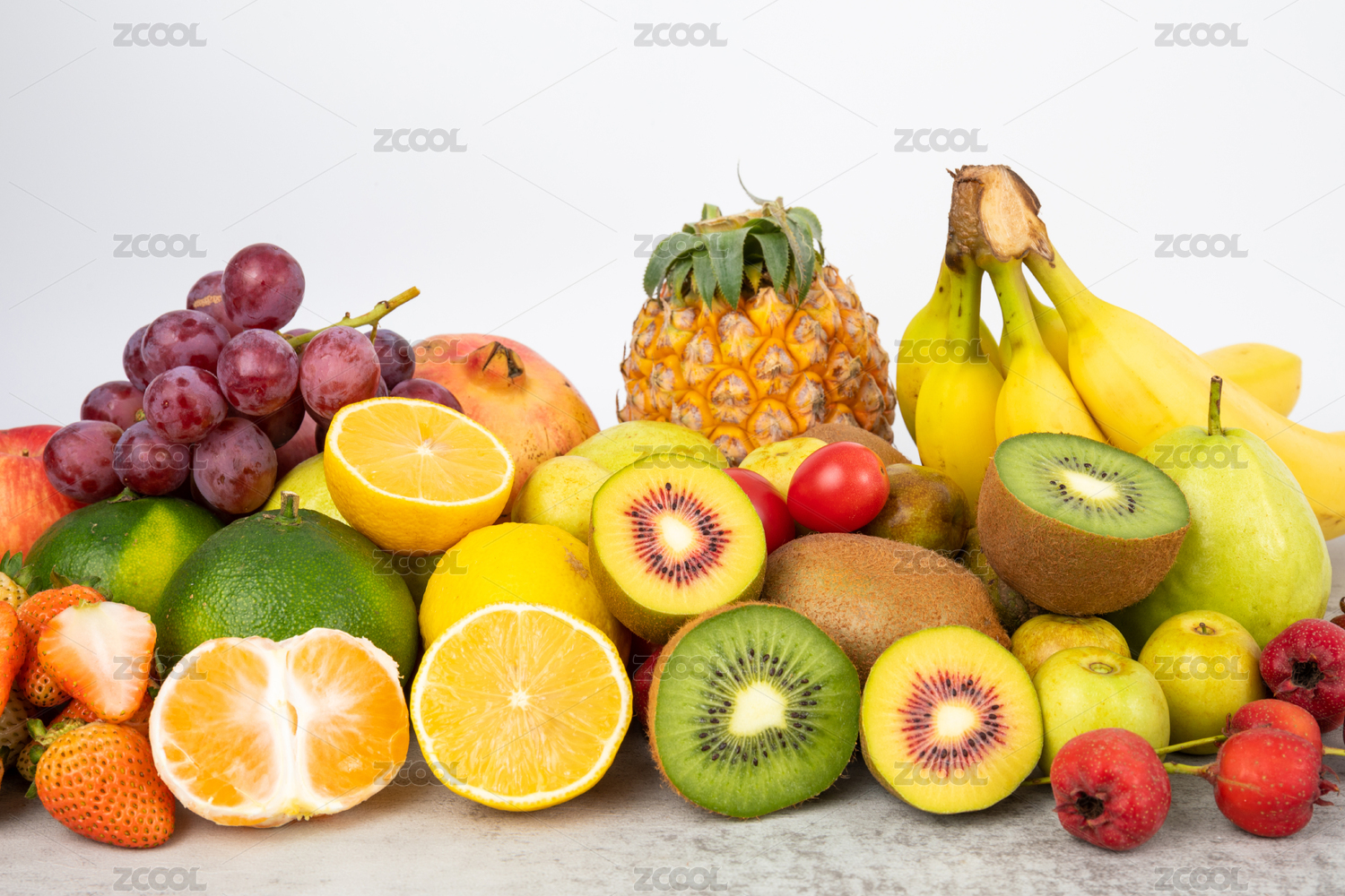 水泥面背景上豐富多樣的新鮮水果