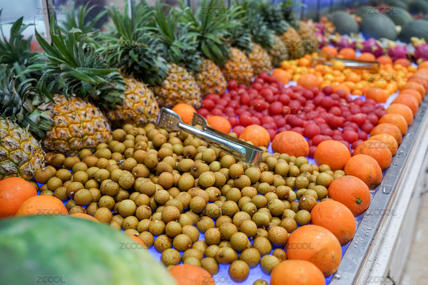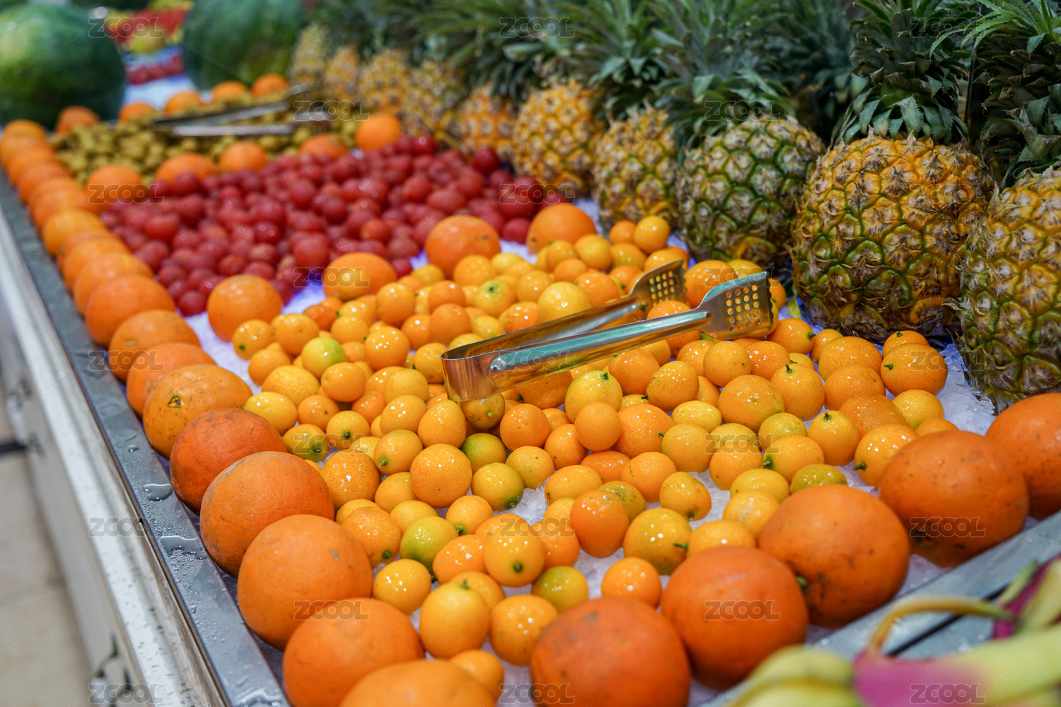 自助餐廳里豐富多樣的水果放在碎冰塊上保鮮