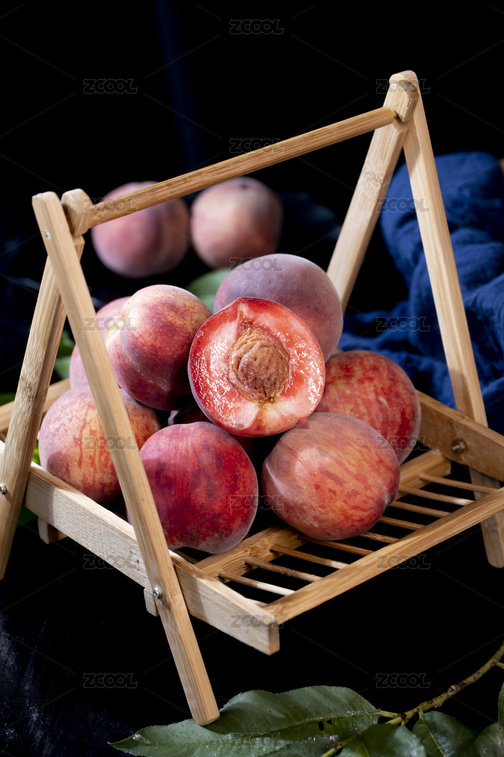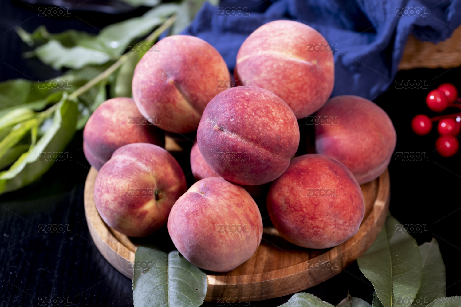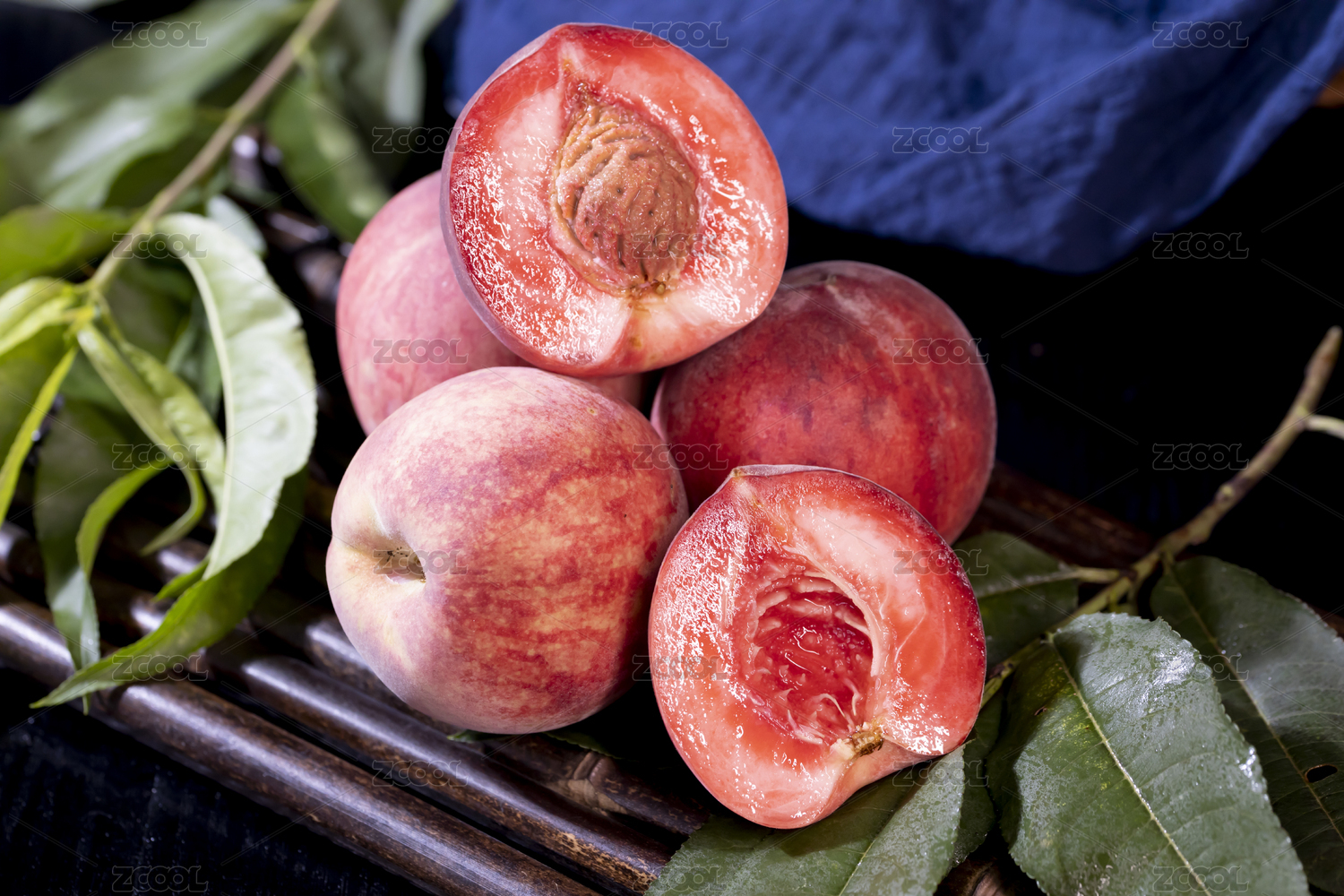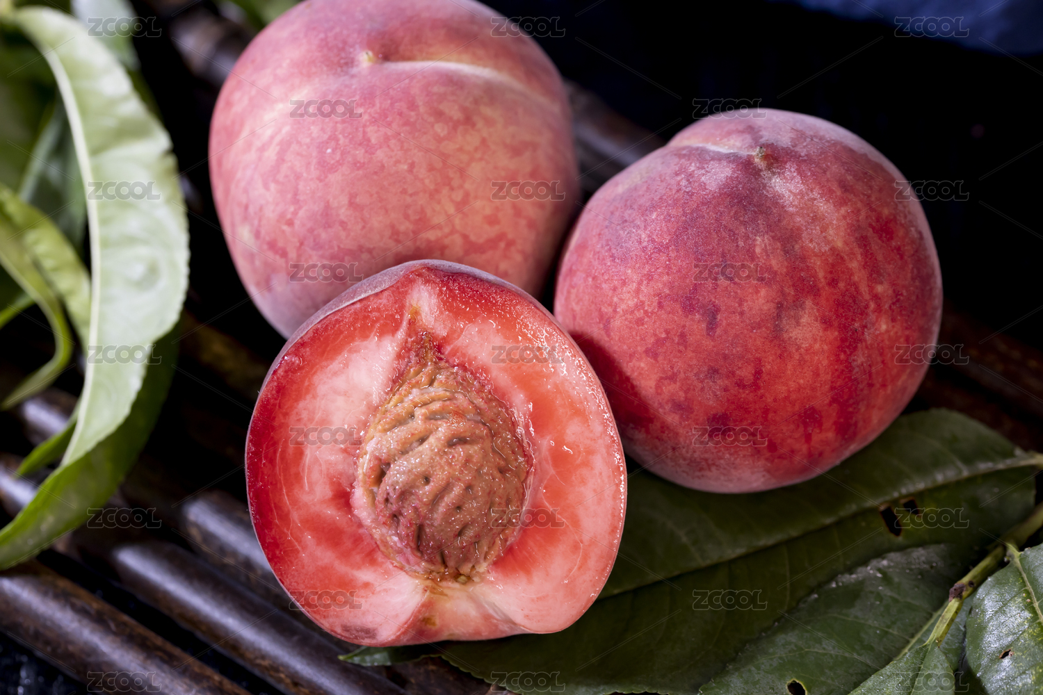 白底上放著三個(gè)完整的血桃和半邊紅肉桃子
