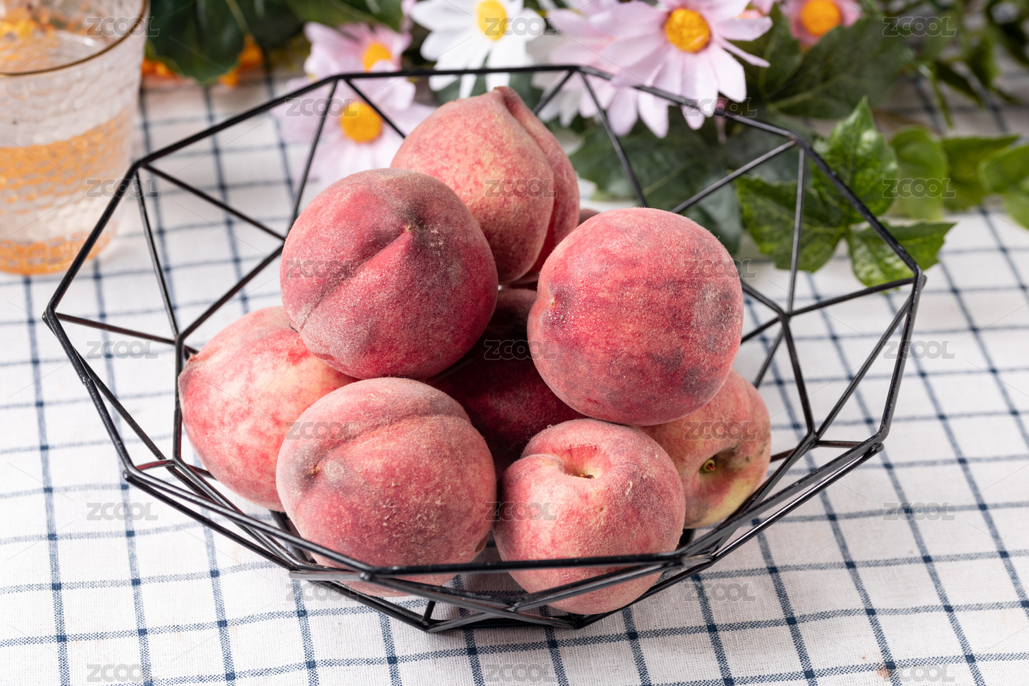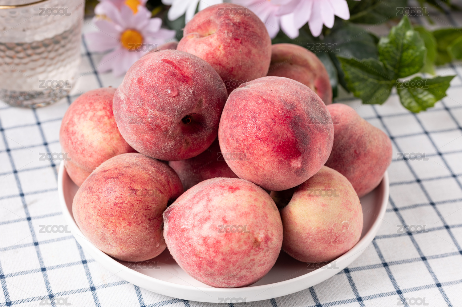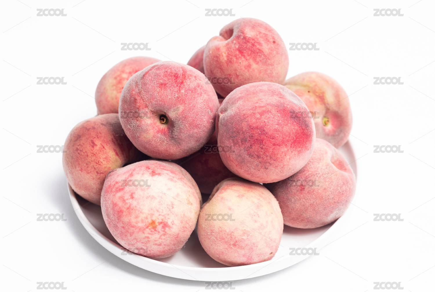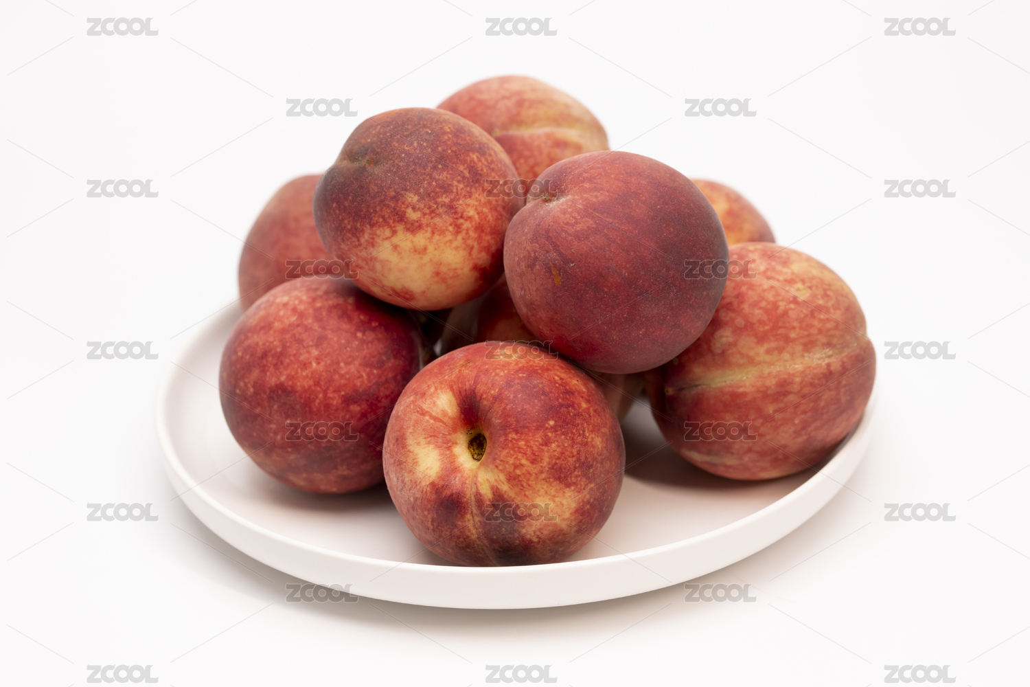 白底上放著三個(gè)完整的血桃和半邊紅肉桃子