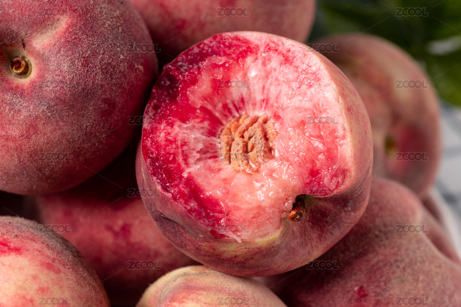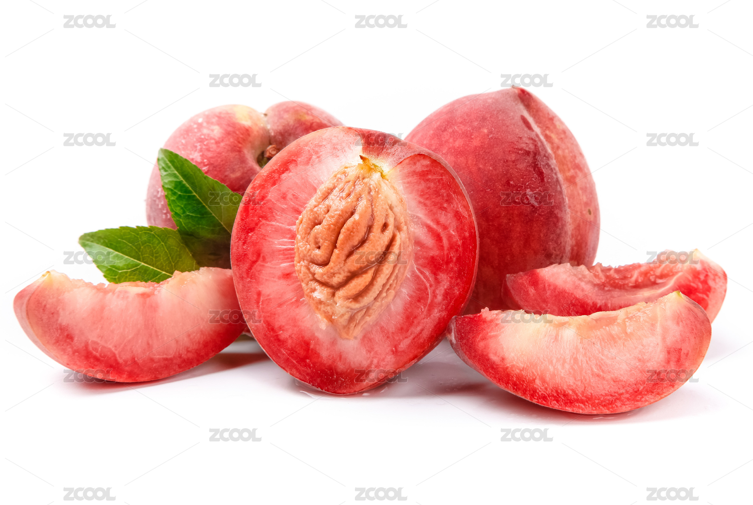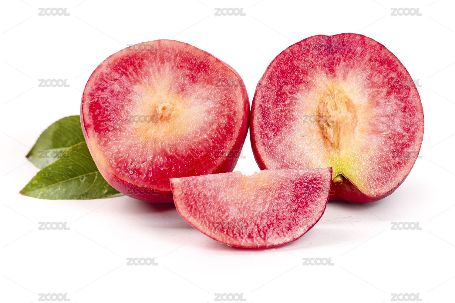 白底上放著切開(kāi)的紅肉桃子