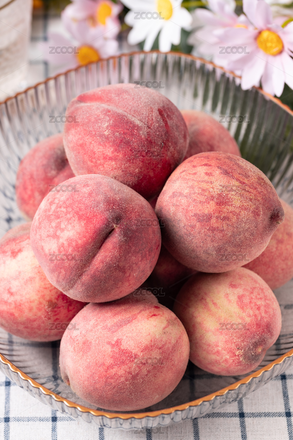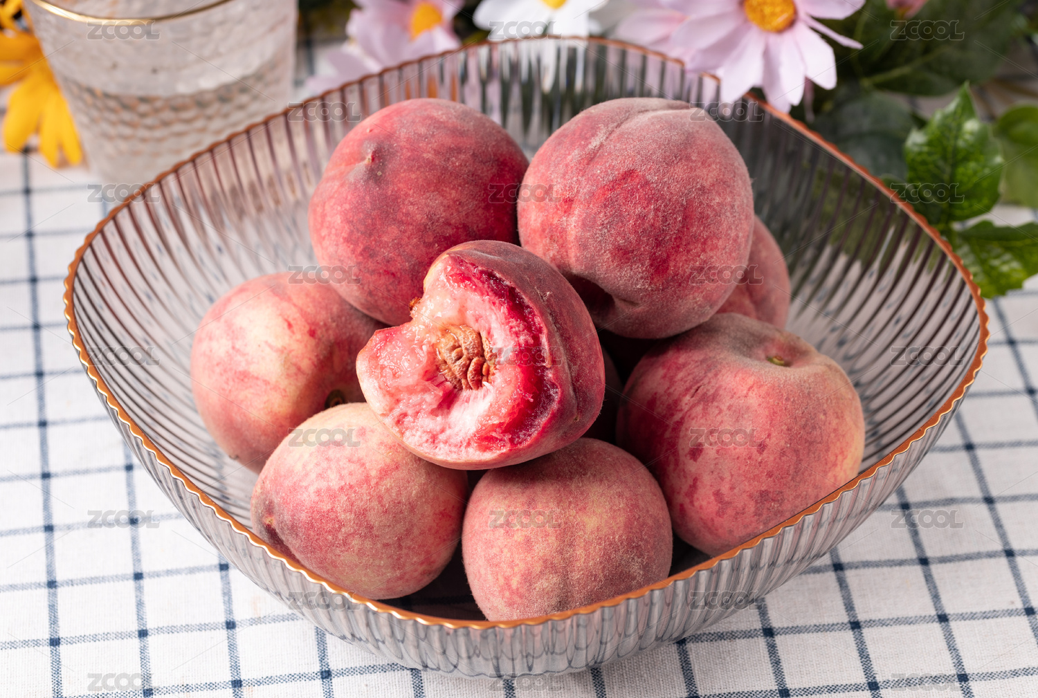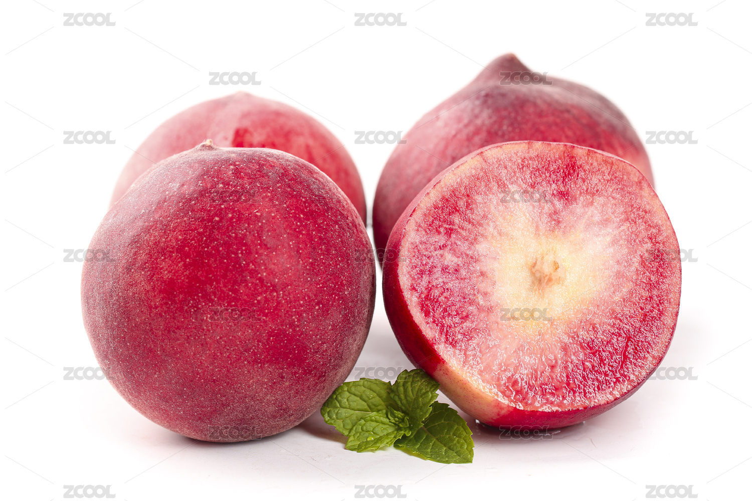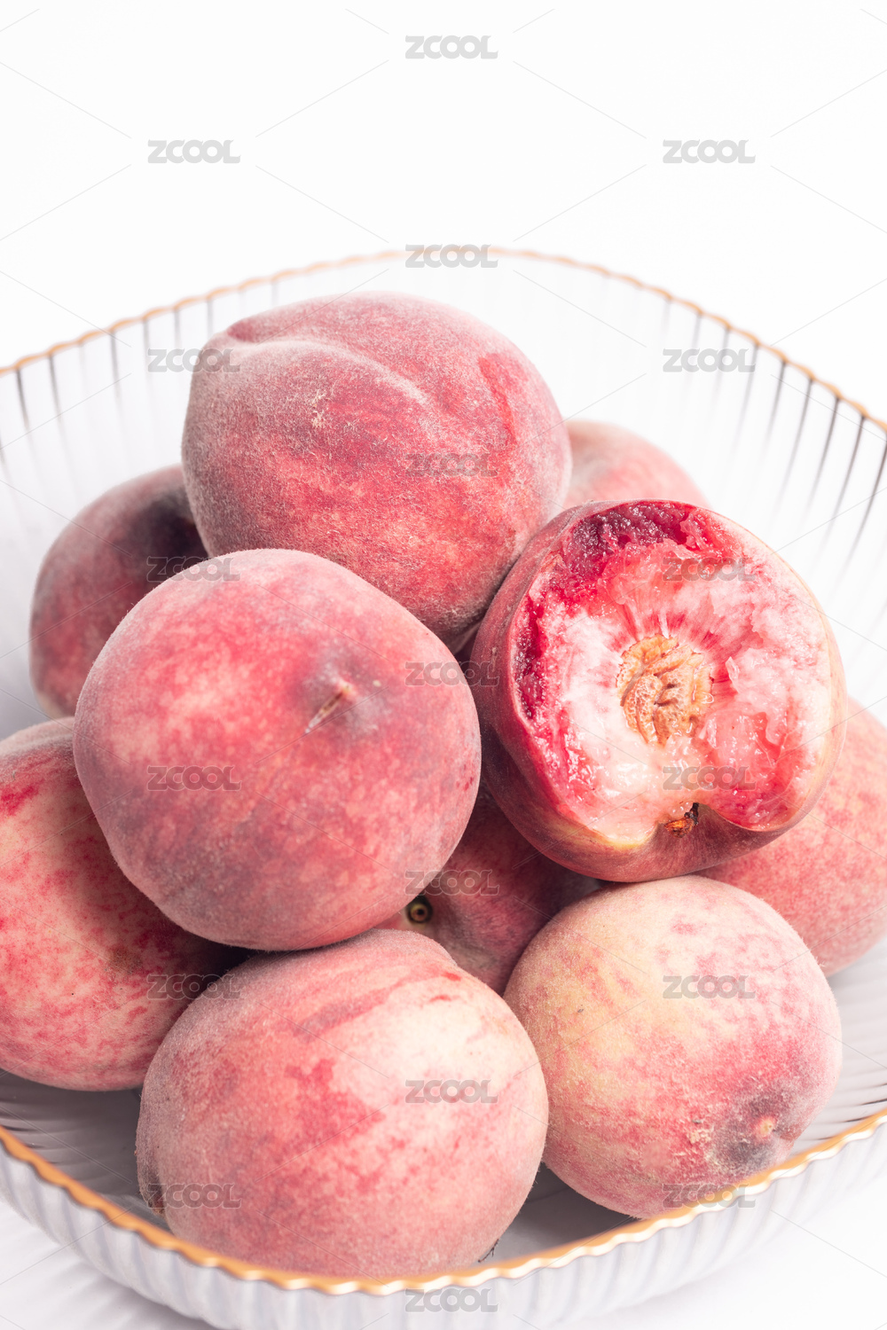 白底上放著切開(kāi)的紅肉桃子