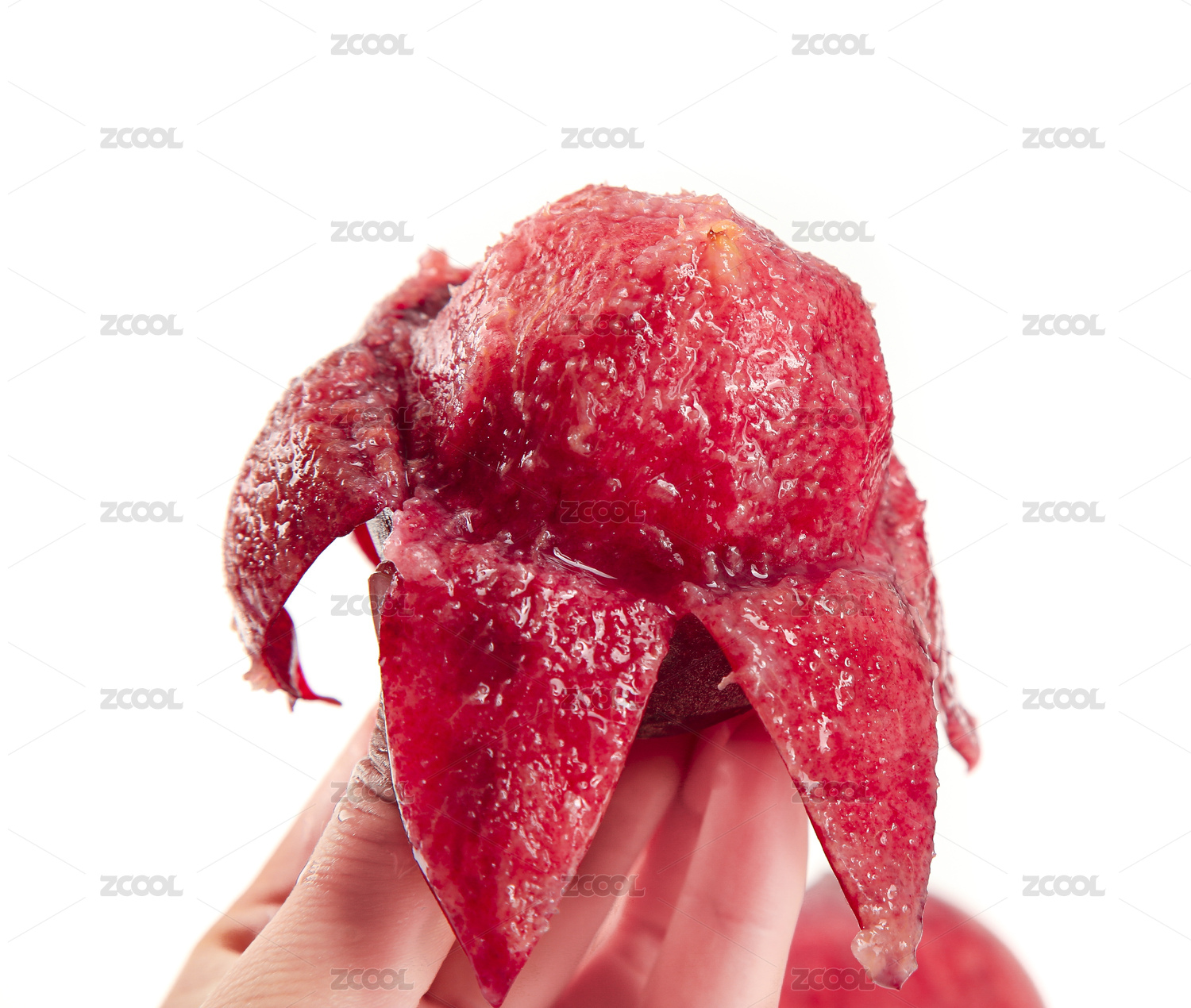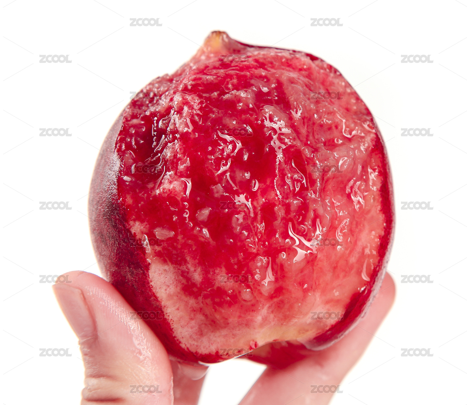 手上拿著一個(gè)撕開(kāi)皮的紅肉桃子