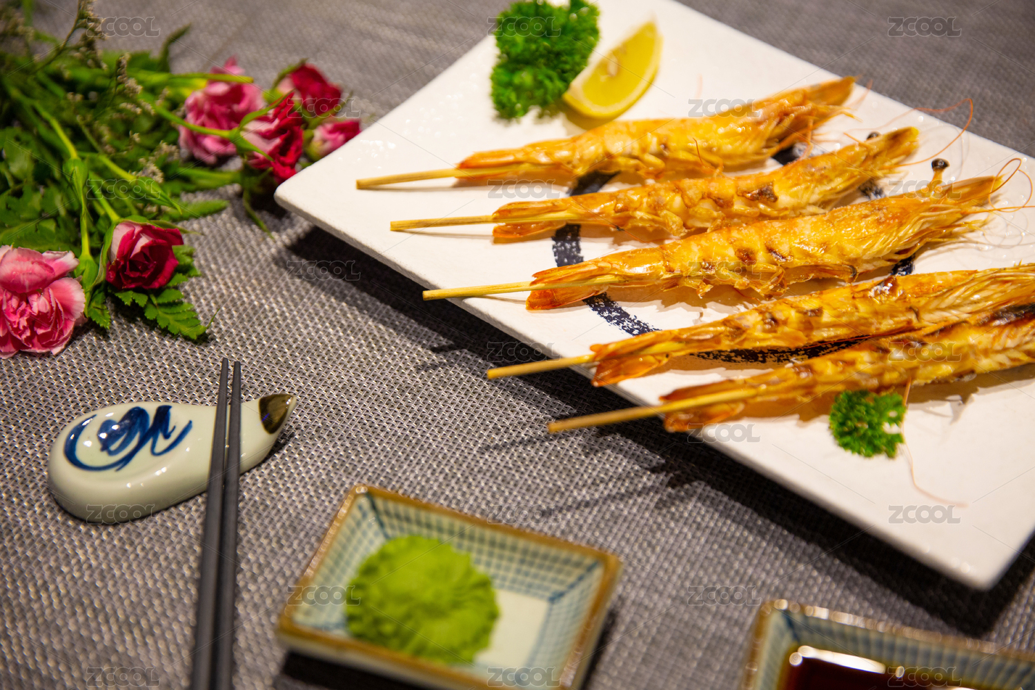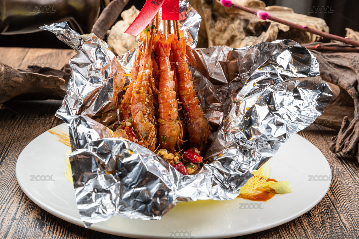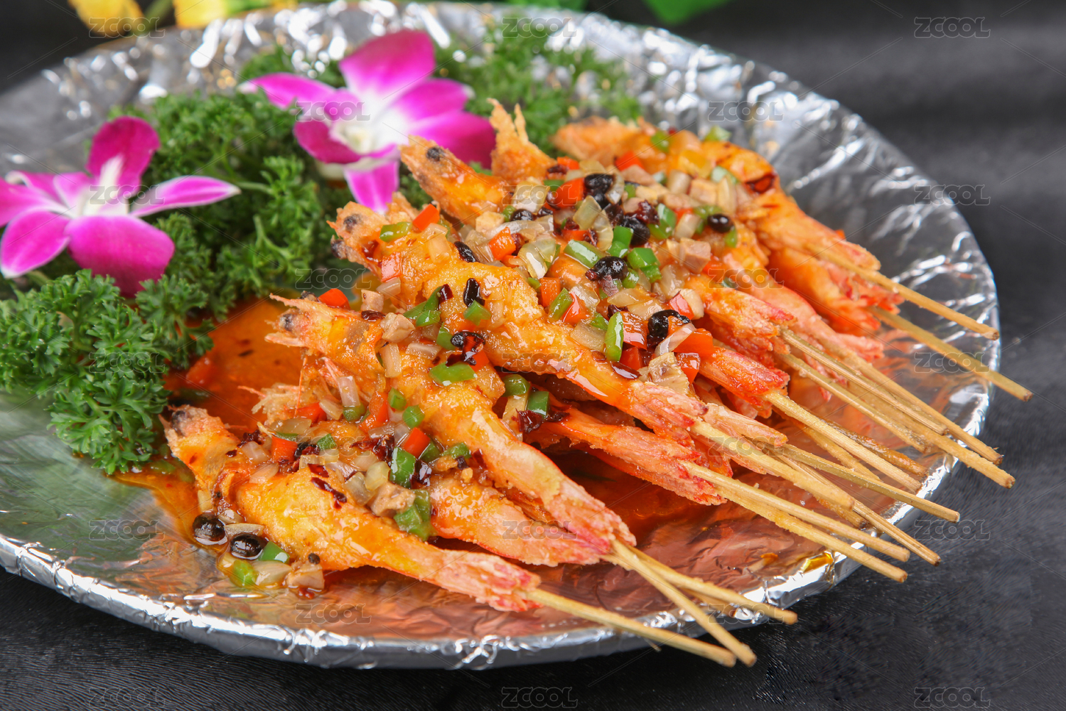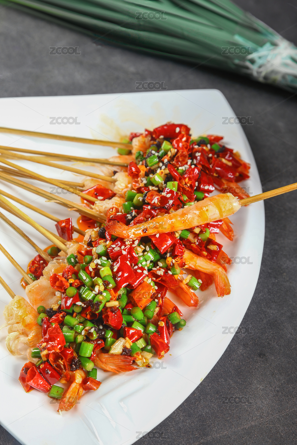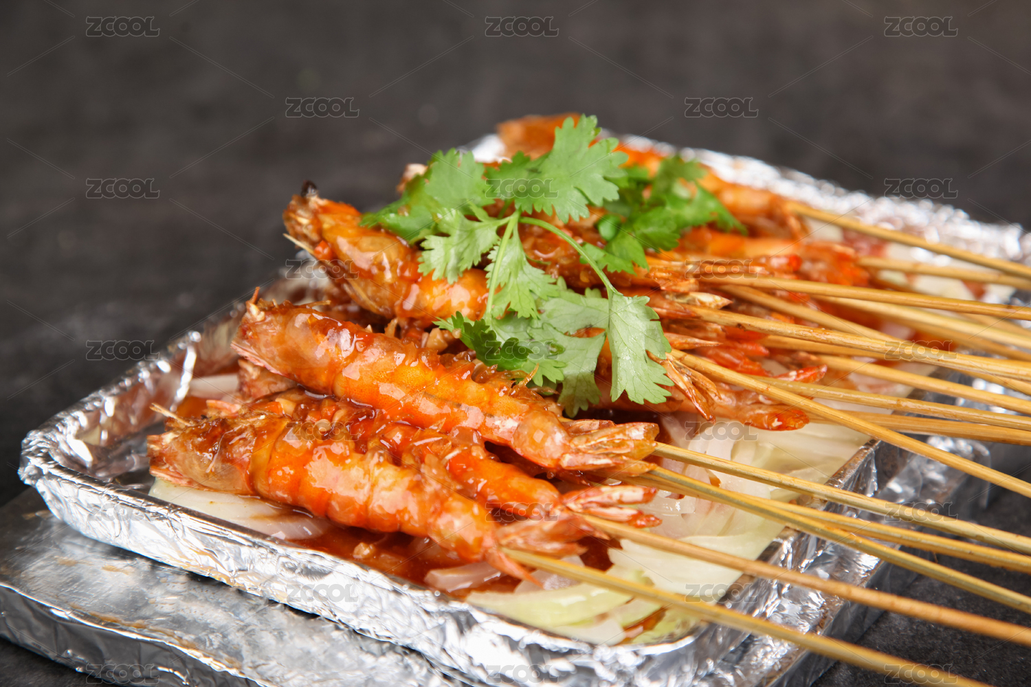 黑色背景燒烤竹簽串著的麻辣烤串串烤蝦