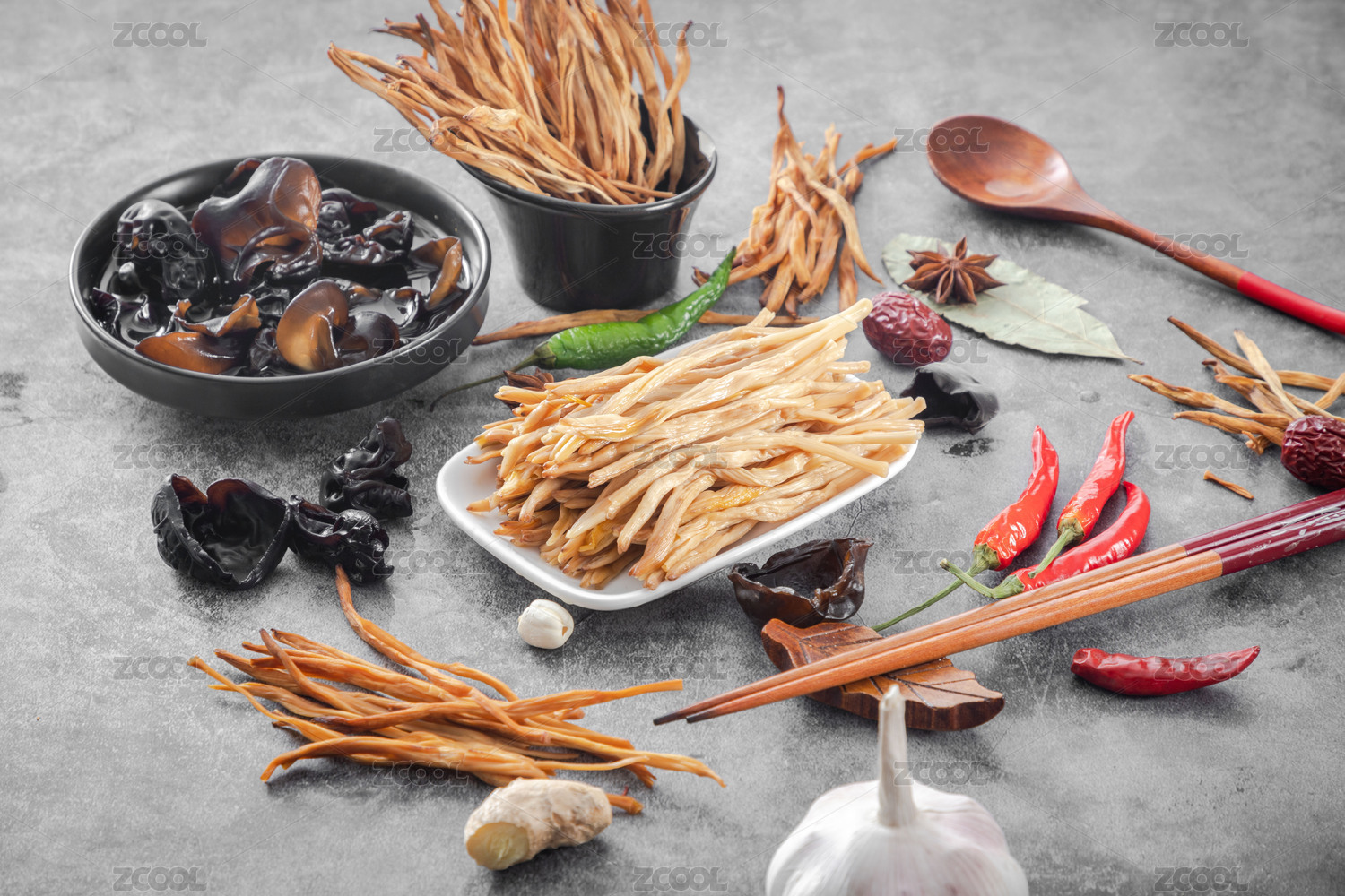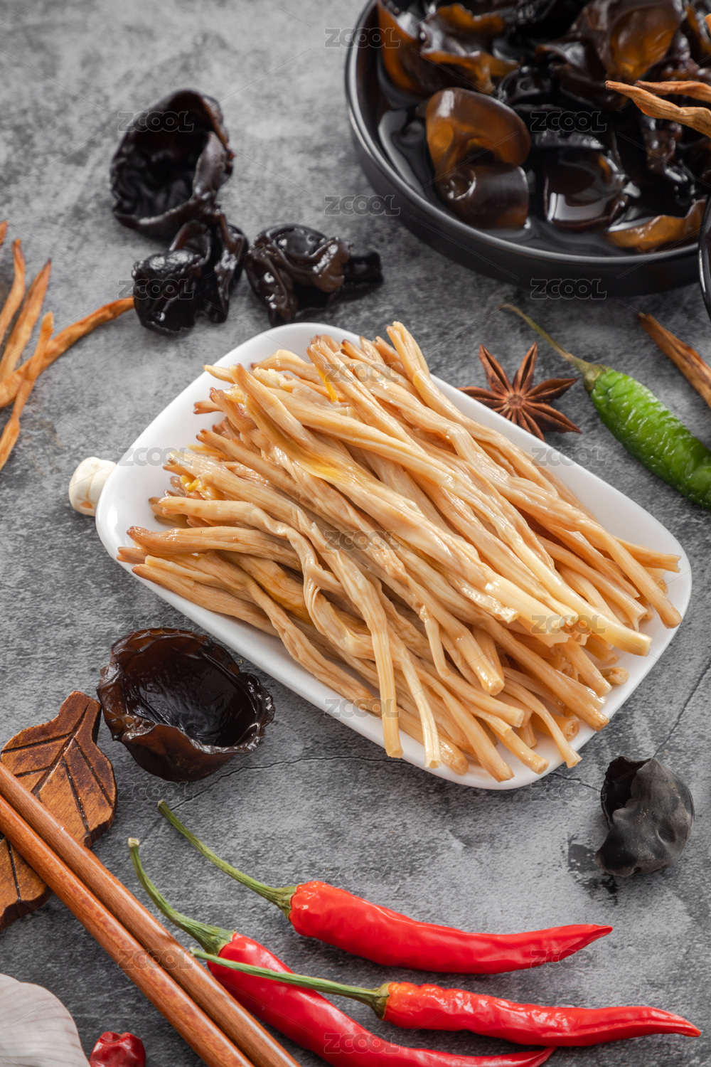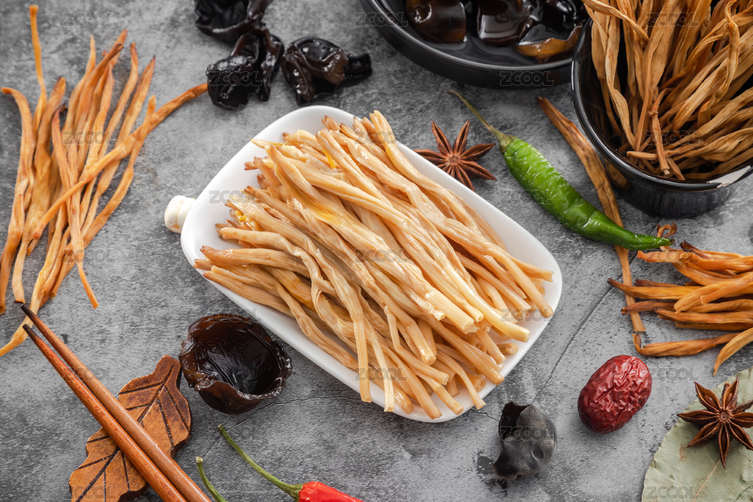 暗色桌面上放著一盤泡發(fā)黃花菜