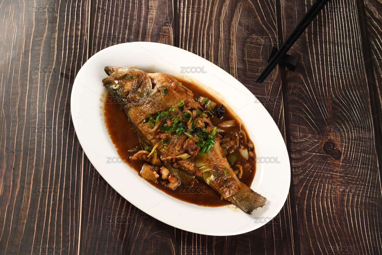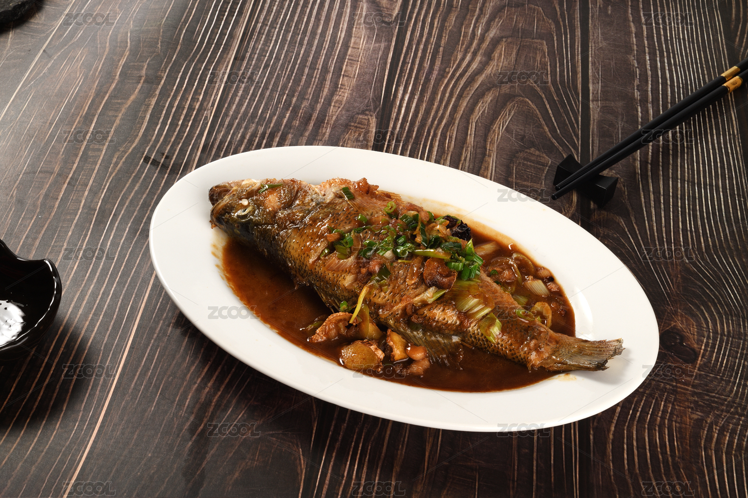 一盤美味的紅燒鱸魚放在桌面上