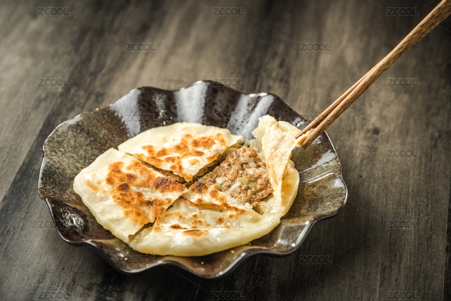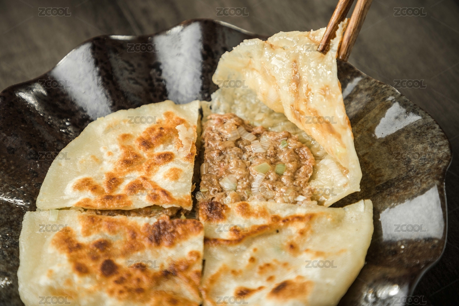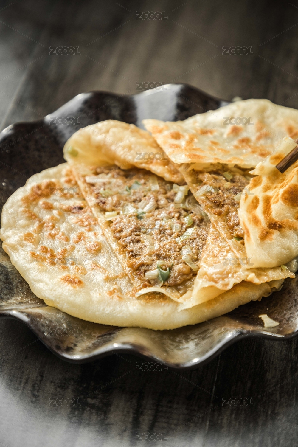 暗色木紋桌上放著一盤羊肉大蔥的餡餅
