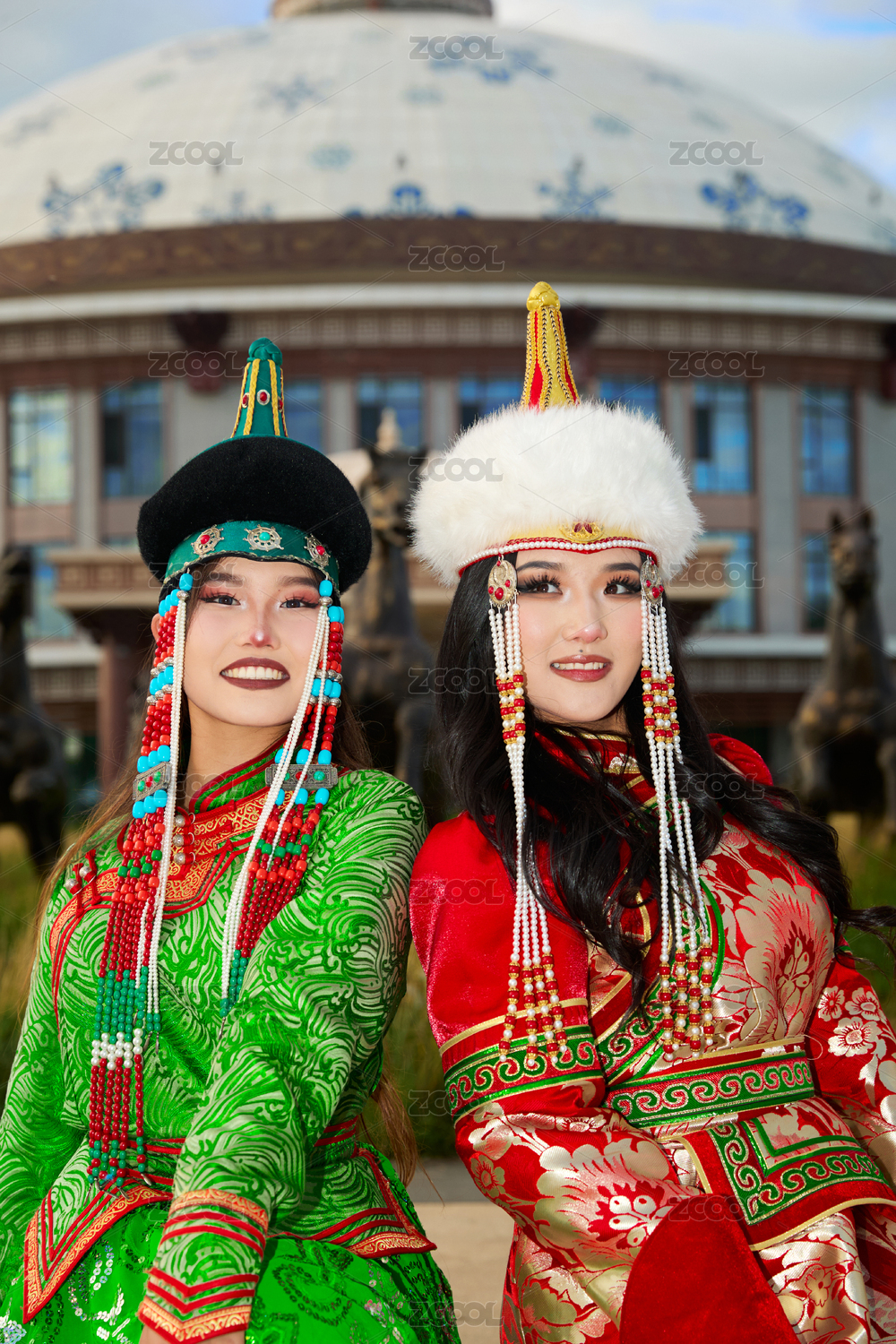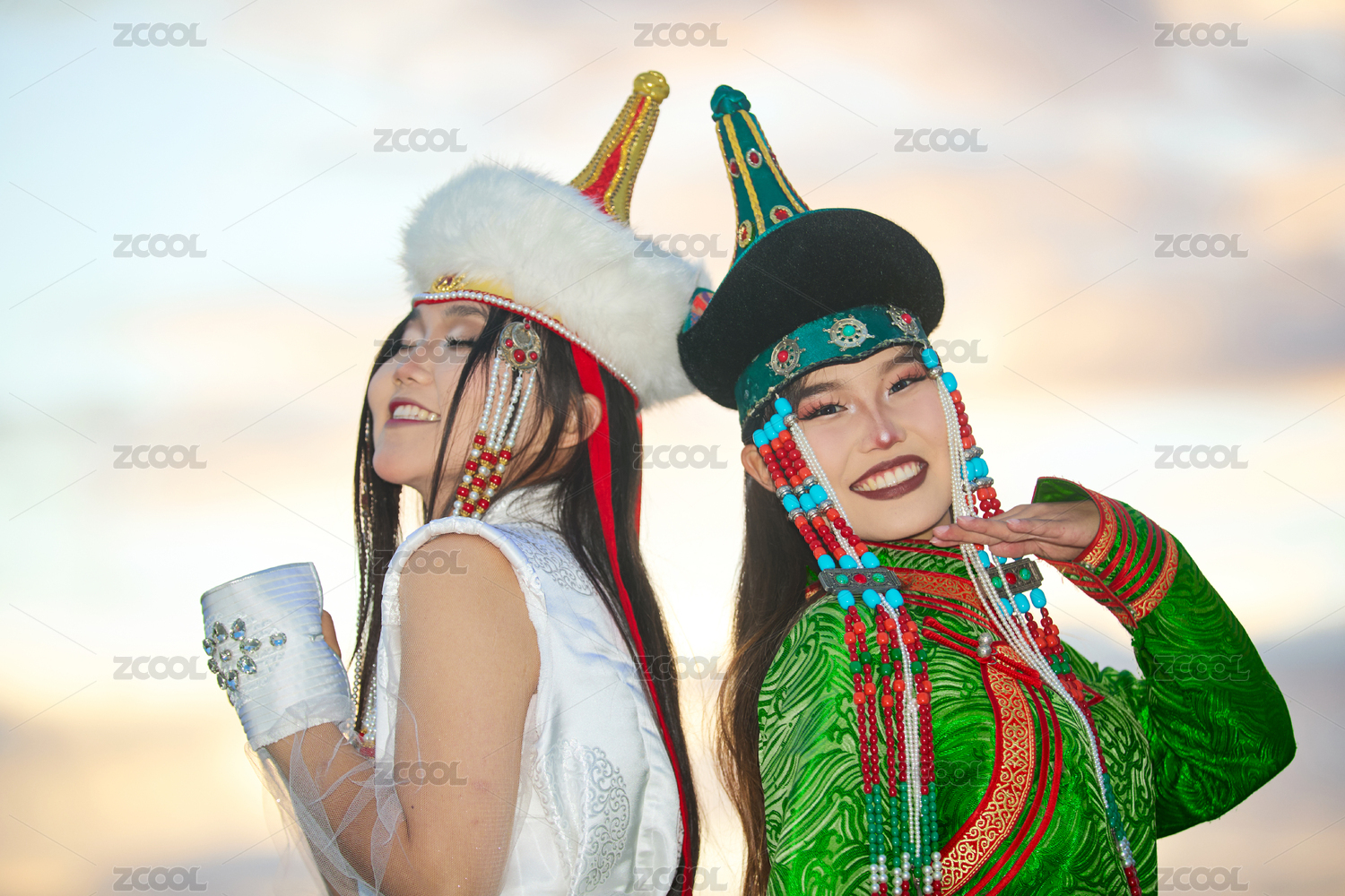 身穿蒙古族部落傳統(tǒng)服飾的兩位蒙古族姑娘