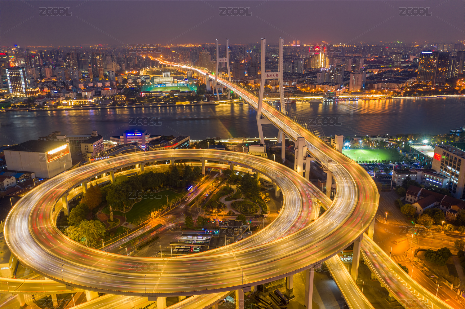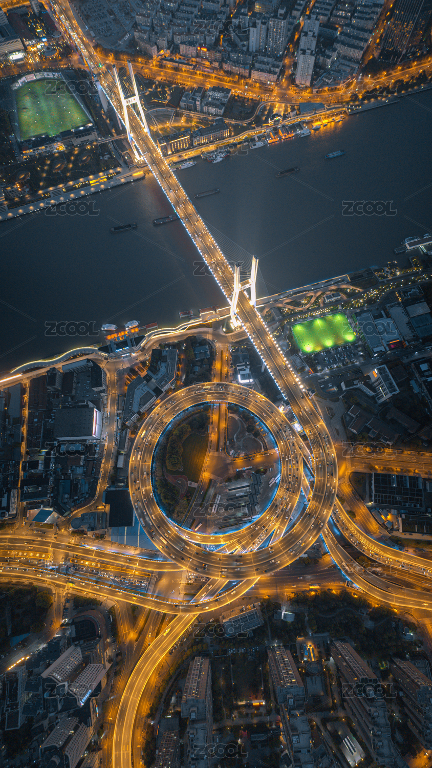 俯瞰夜色下的中國上海南浦大橋全景