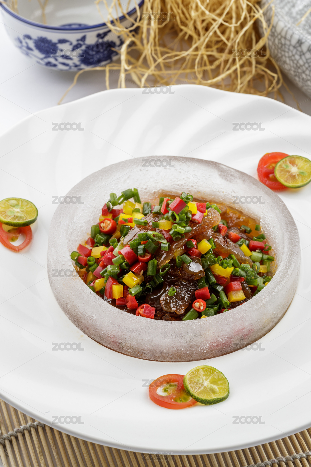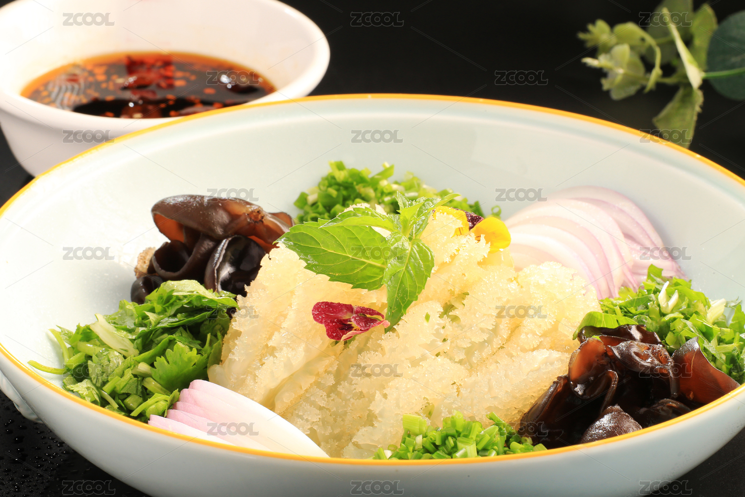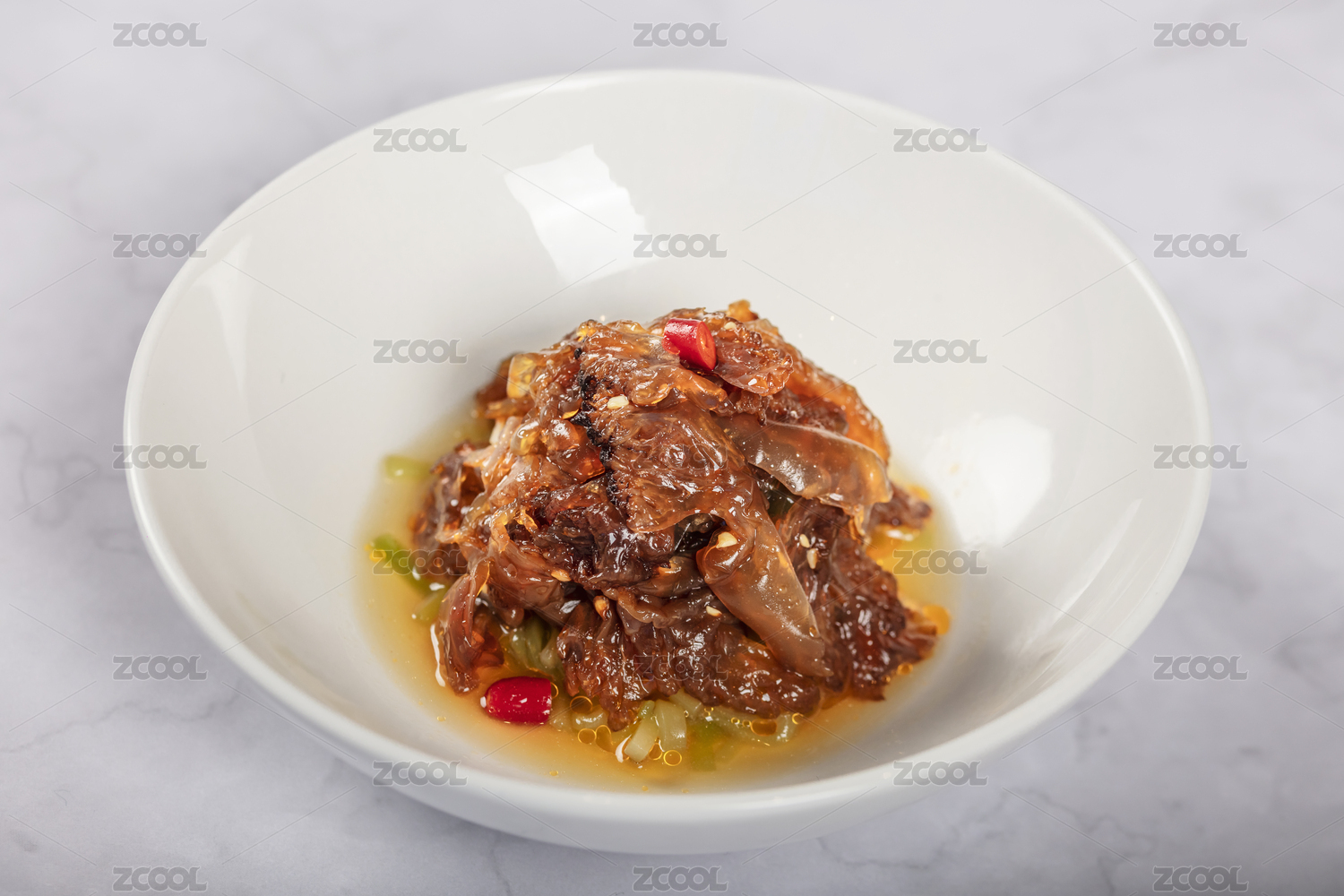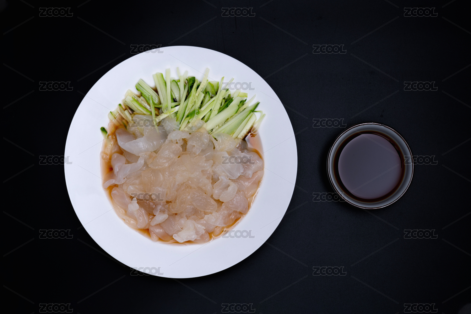 黑背景上白色瓷盤里的撈汁蟄頭,旁邊配著調(diào)味汁
