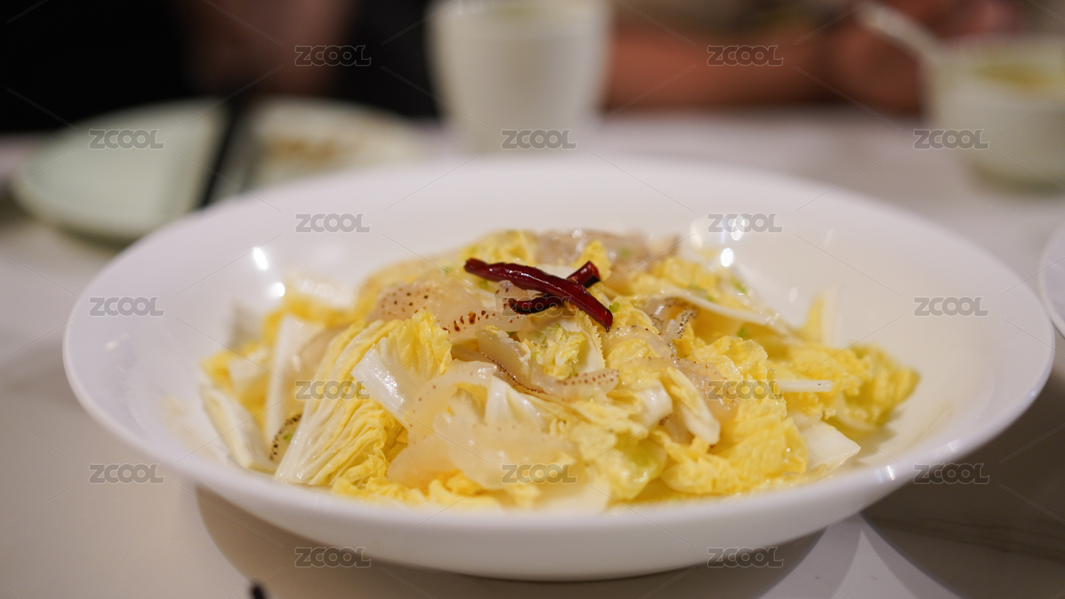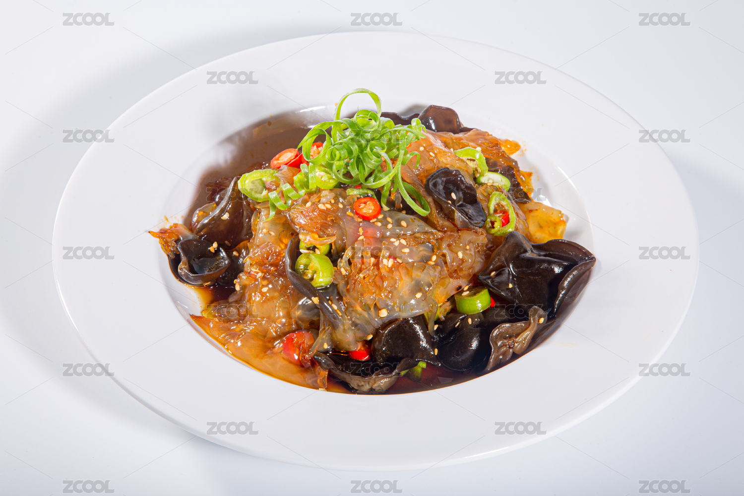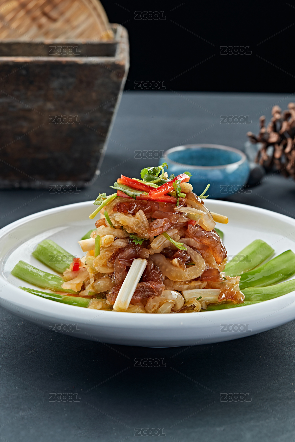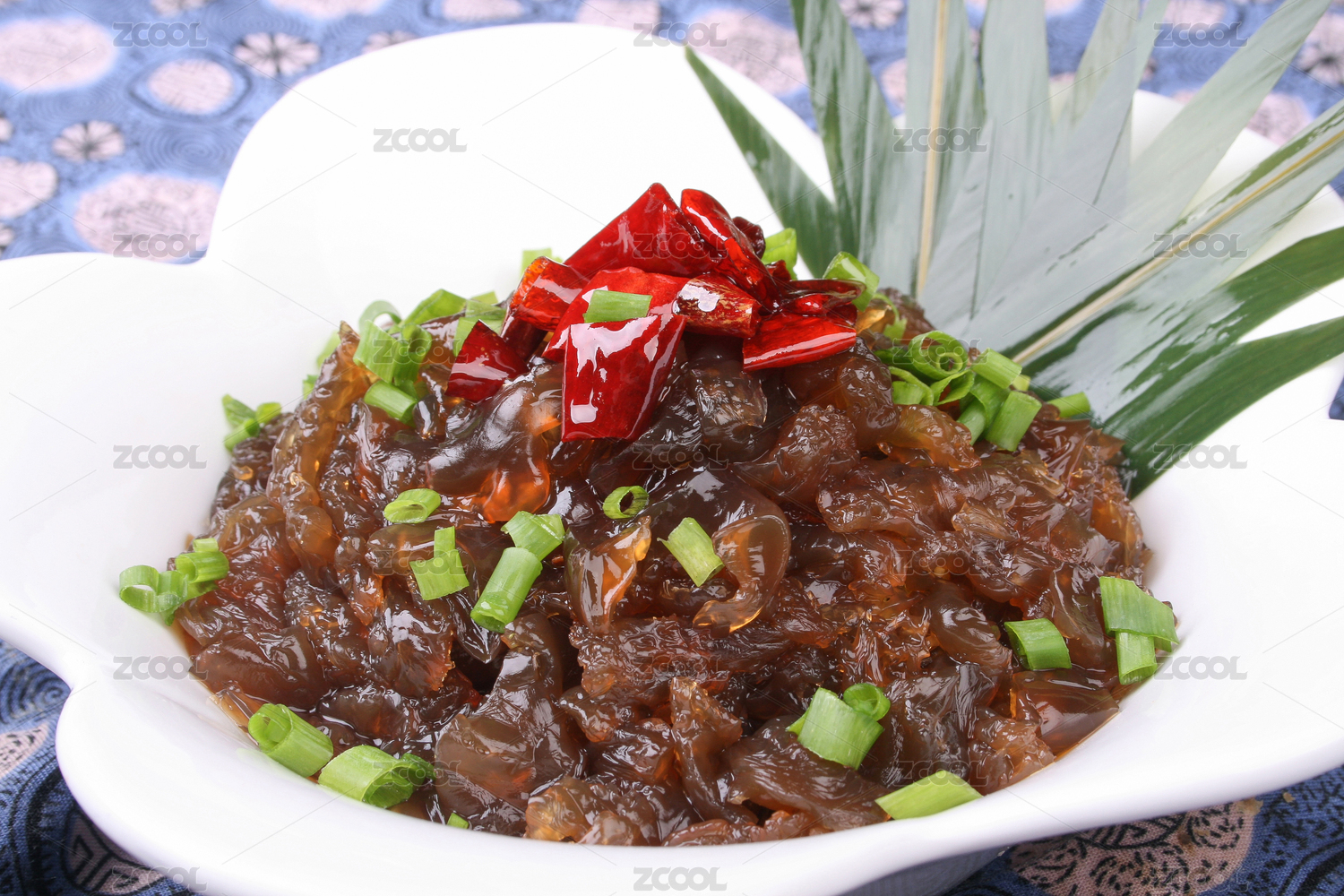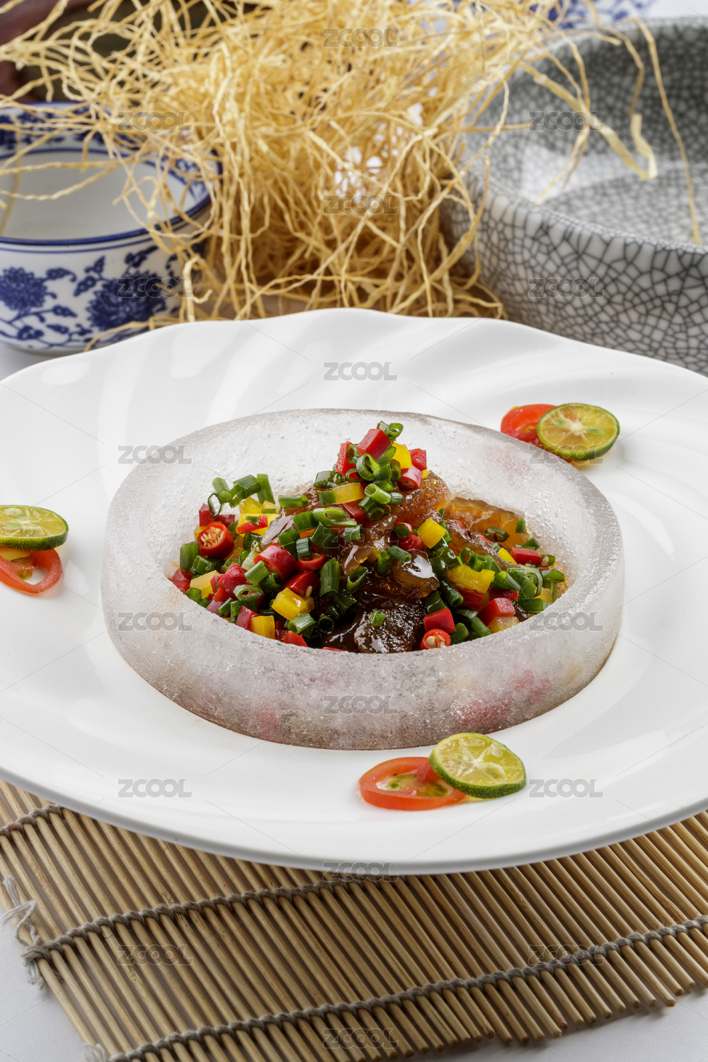 黑背景上白色瓷盤里的撈汁蟄頭,旁邊配著調(diào)味汁