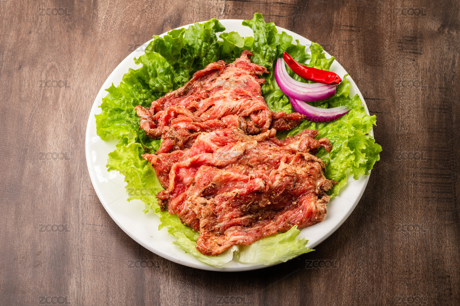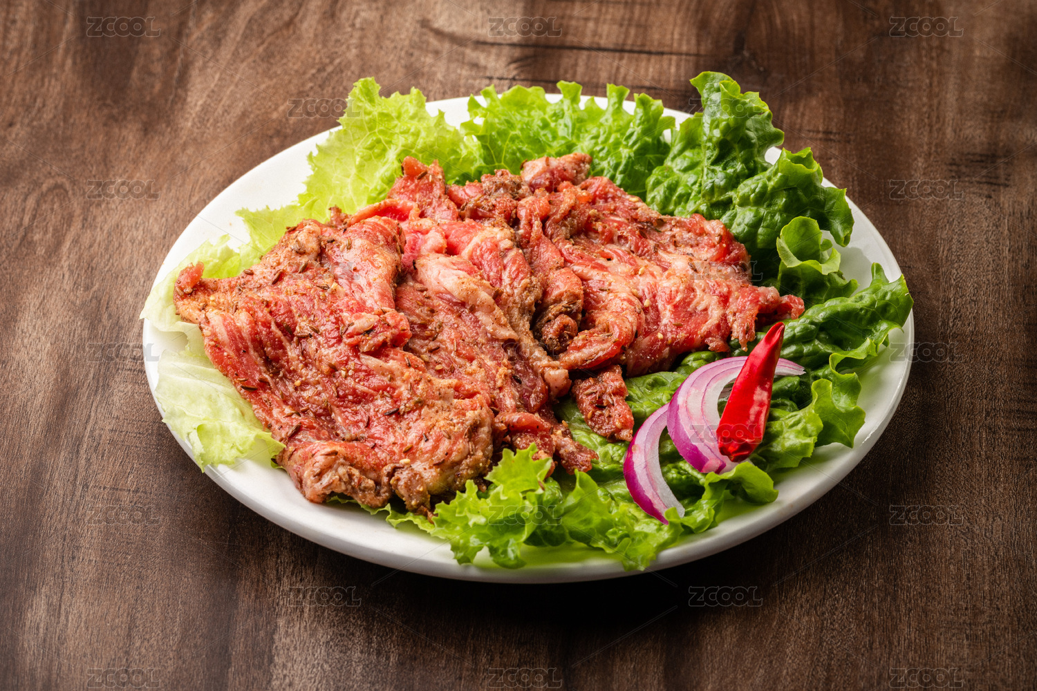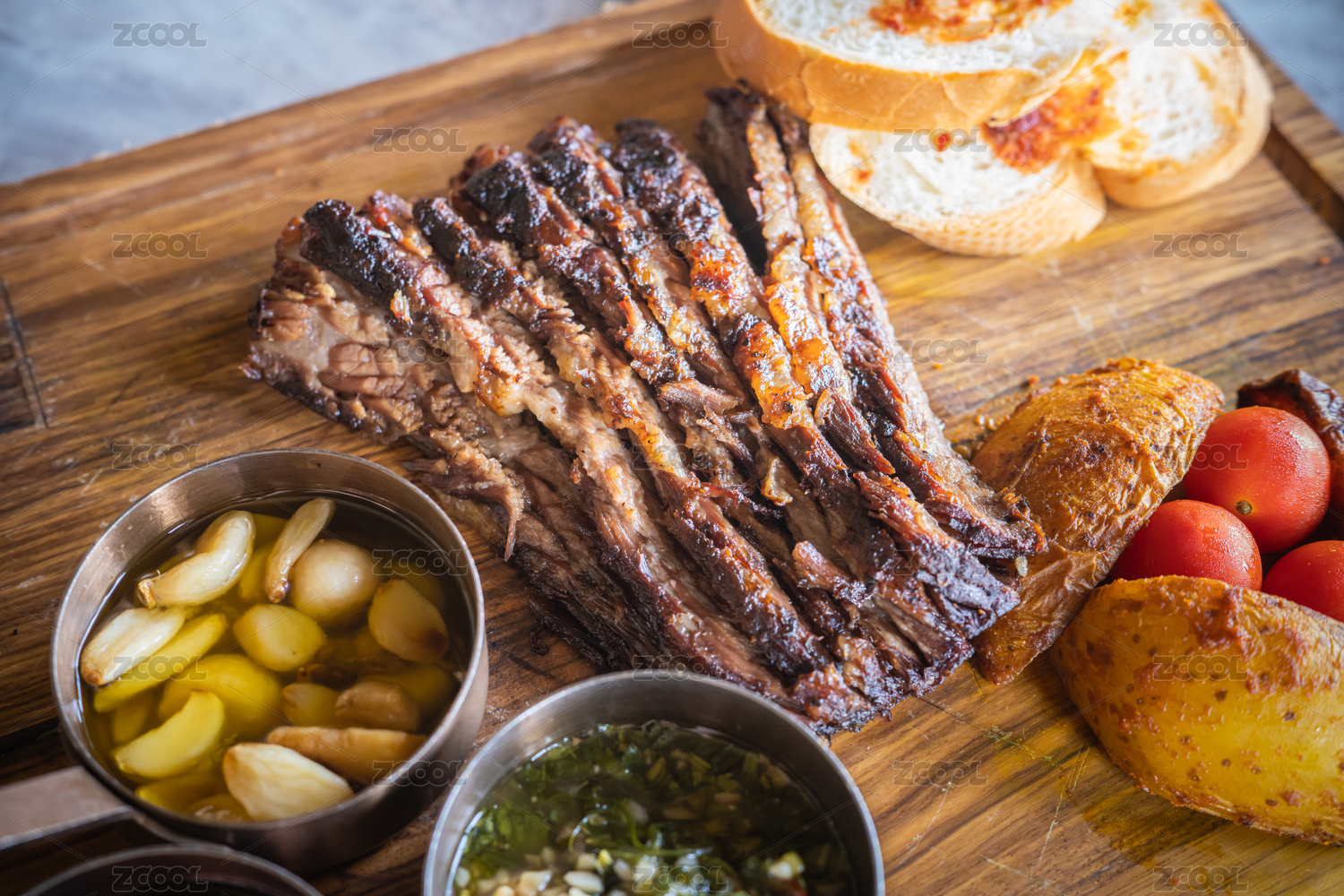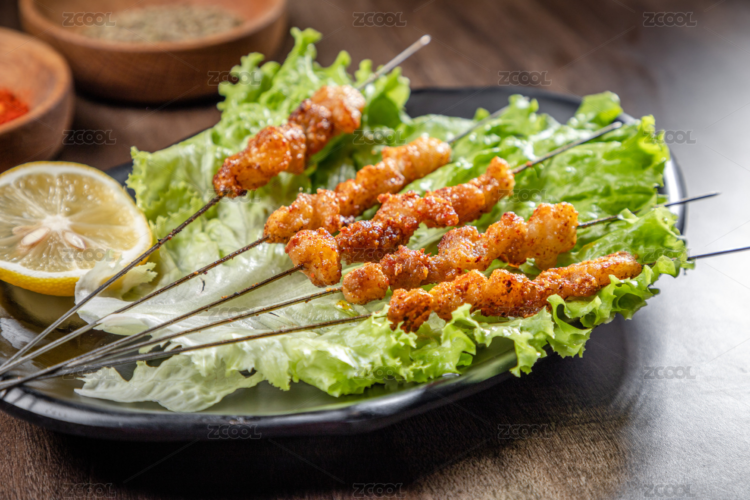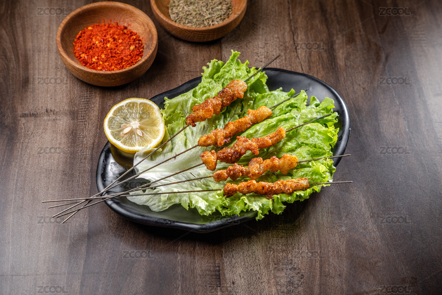棕色木紋桌上放著一盤牛胸口肉烤串