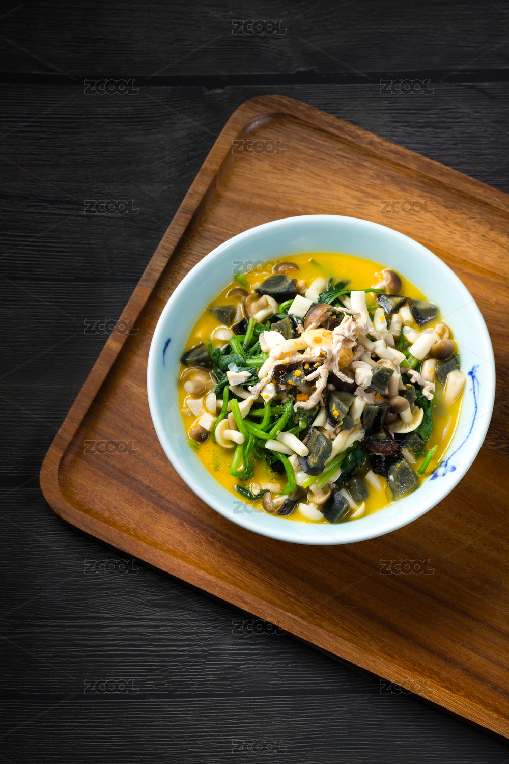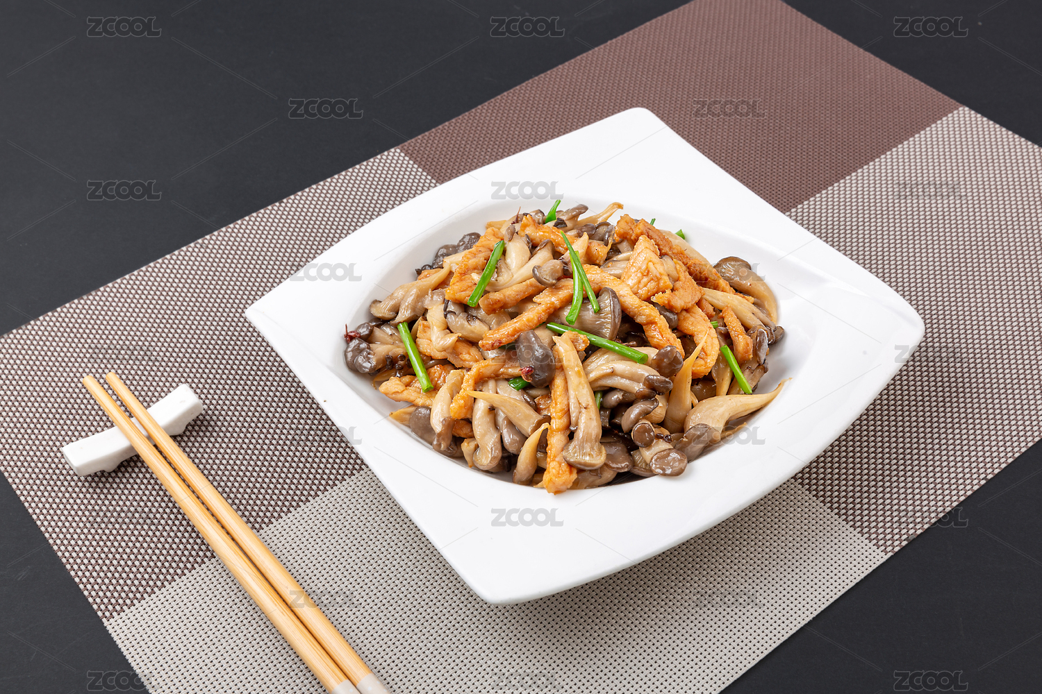 暗色調(diào)背景木盤上蘑菇肉絲