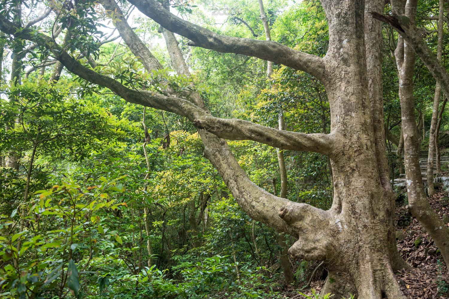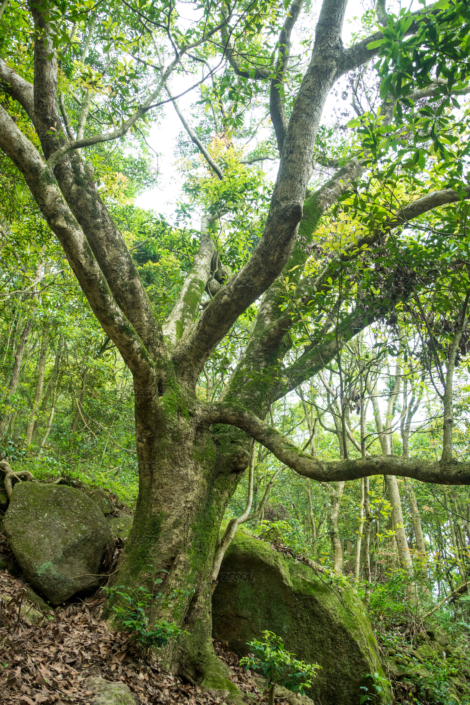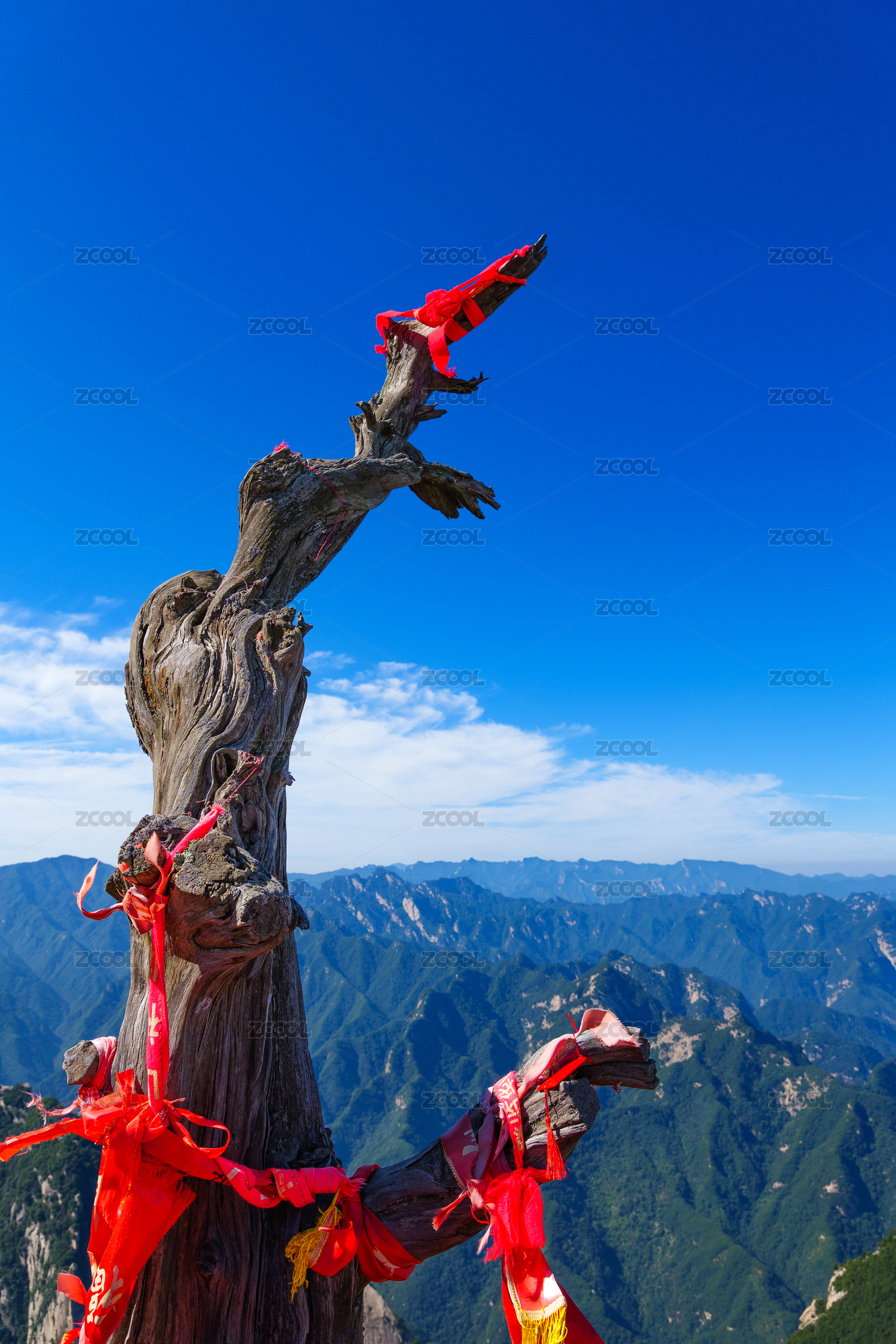 華山高聳陡峭的蒼綠色山體與干枯的粗壯樹干