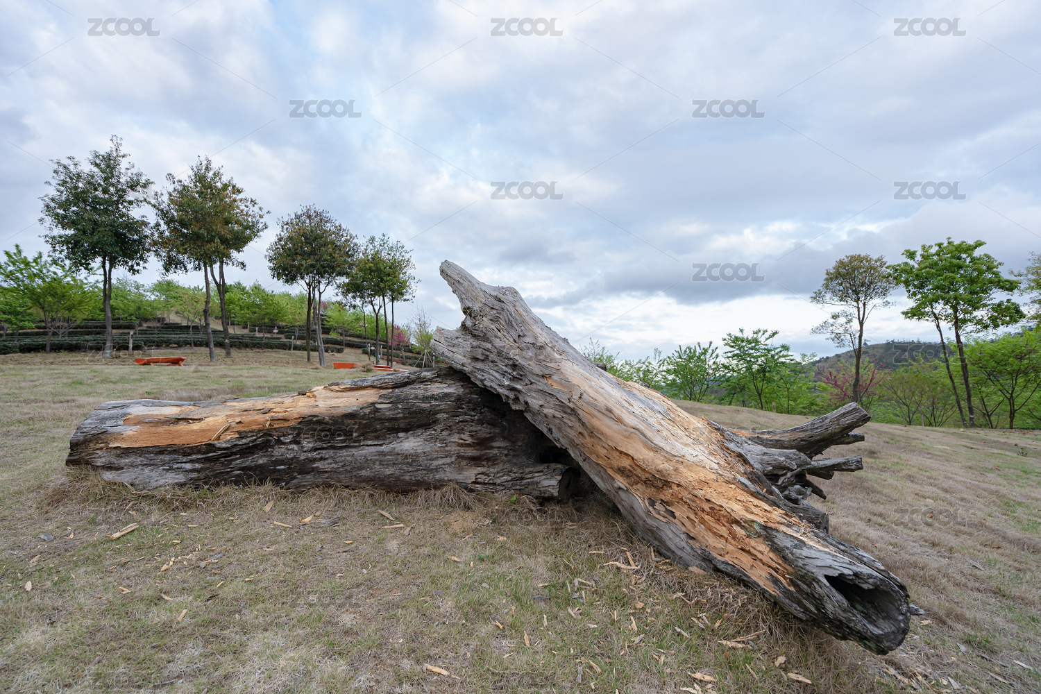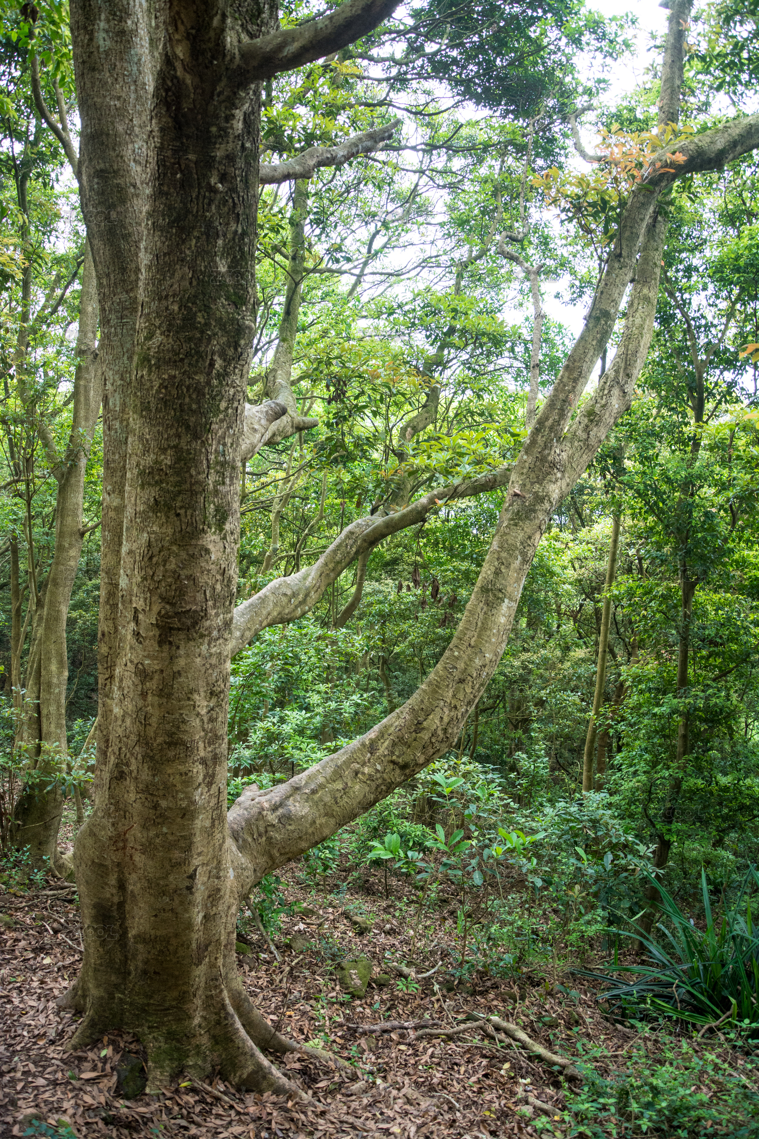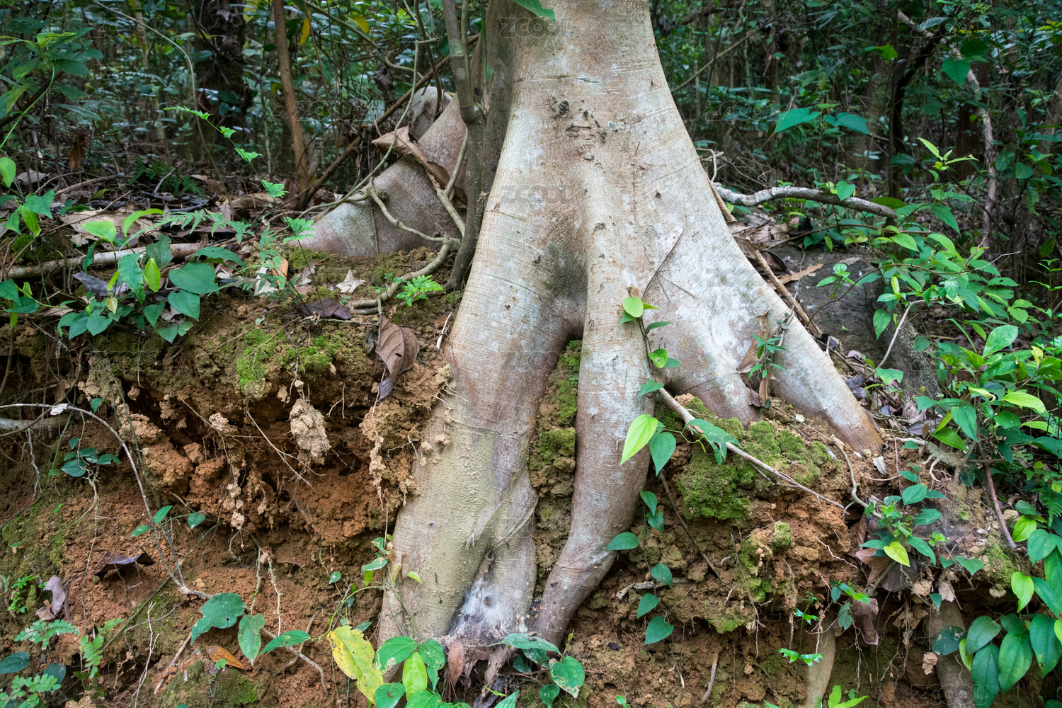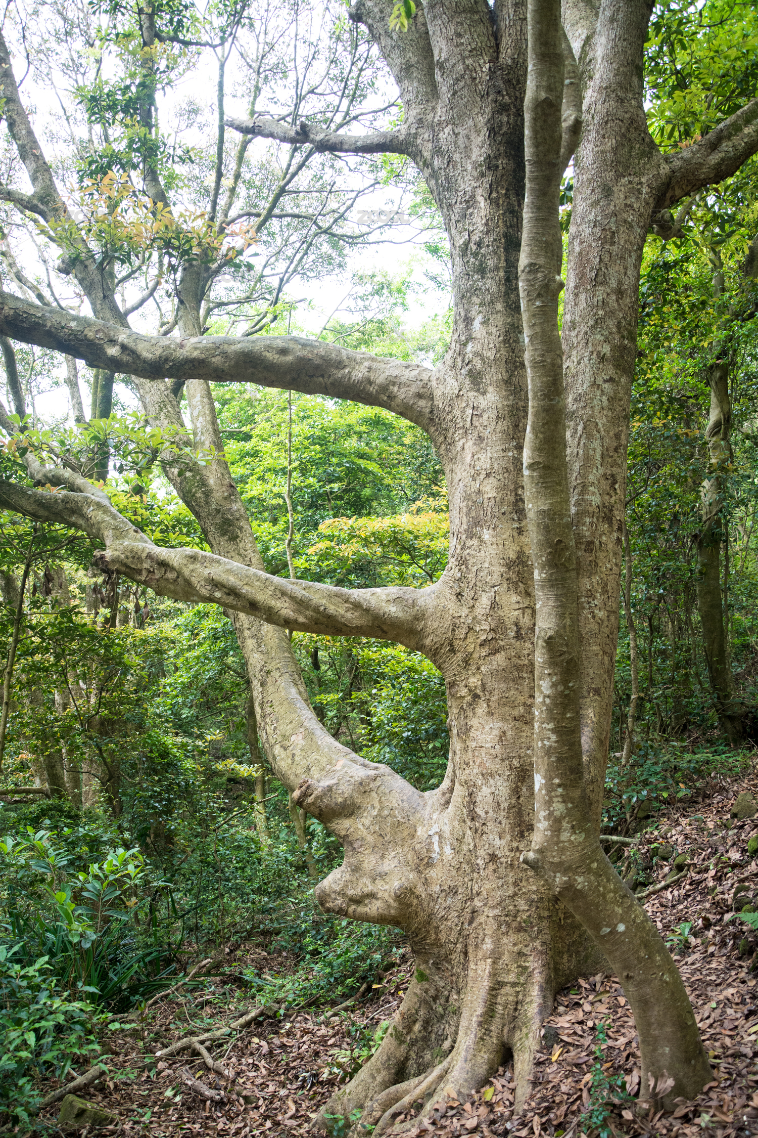 華山高聳陡峭的蒼綠色山體與干枯的粗壯樹干
