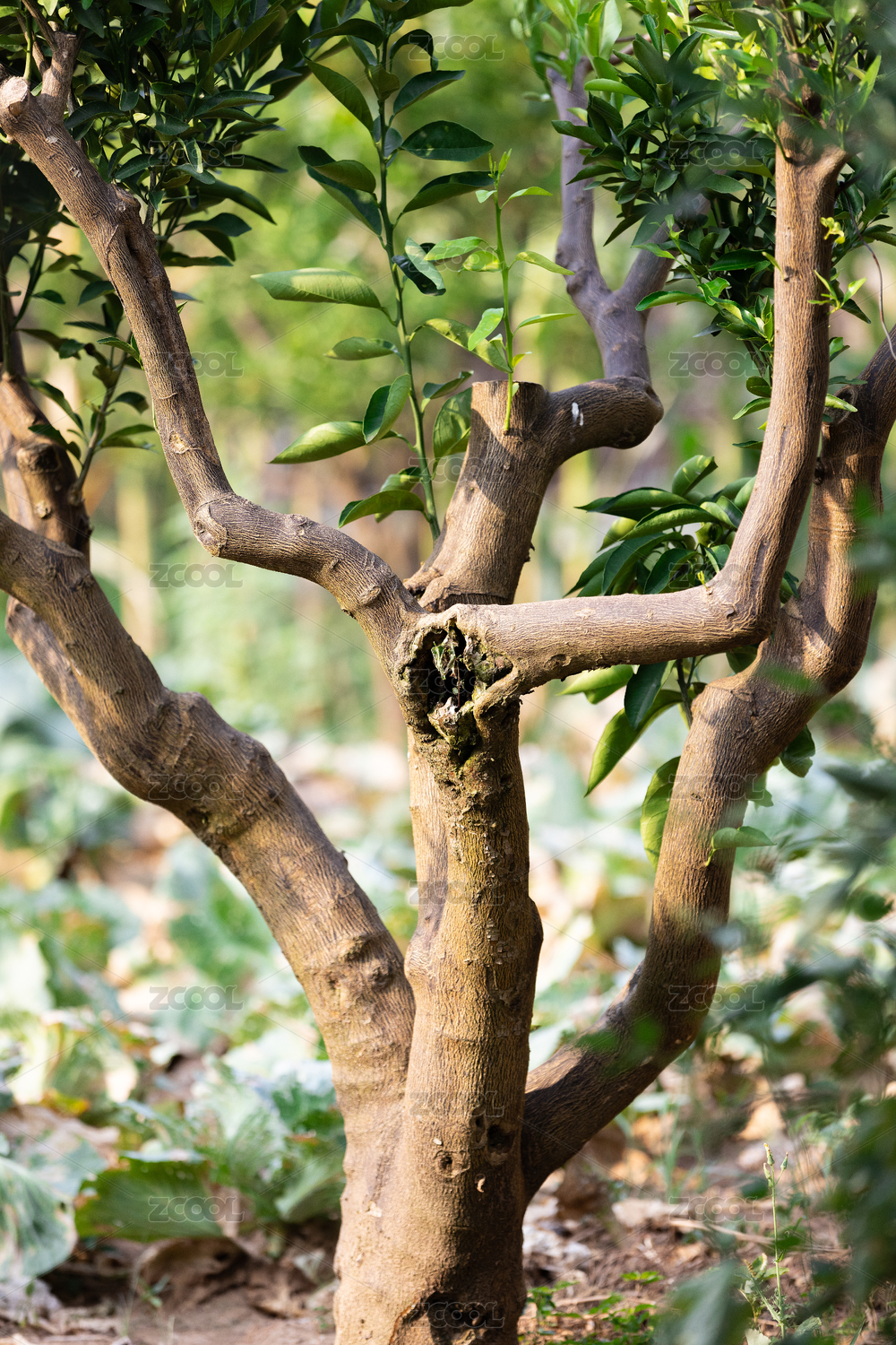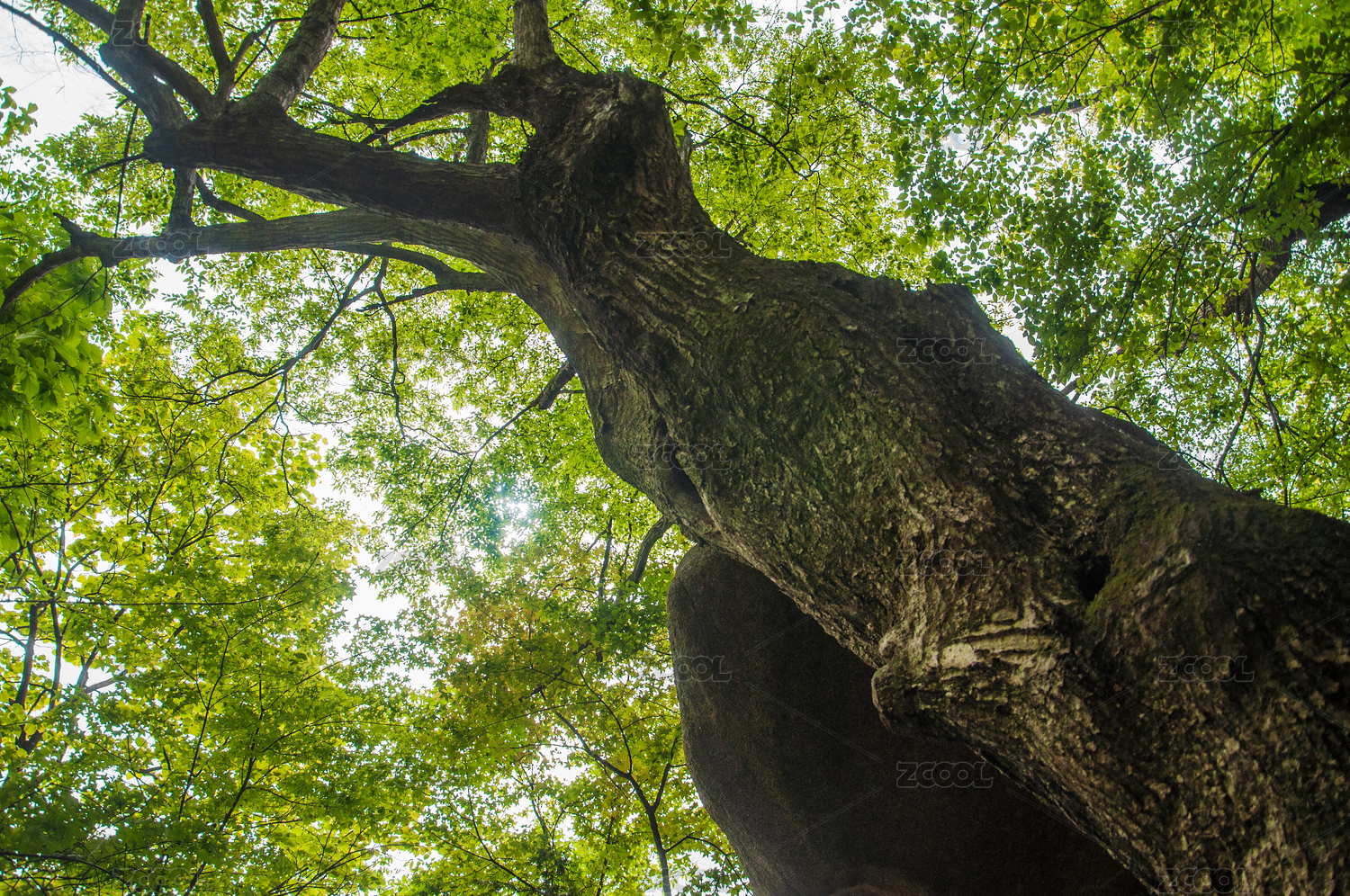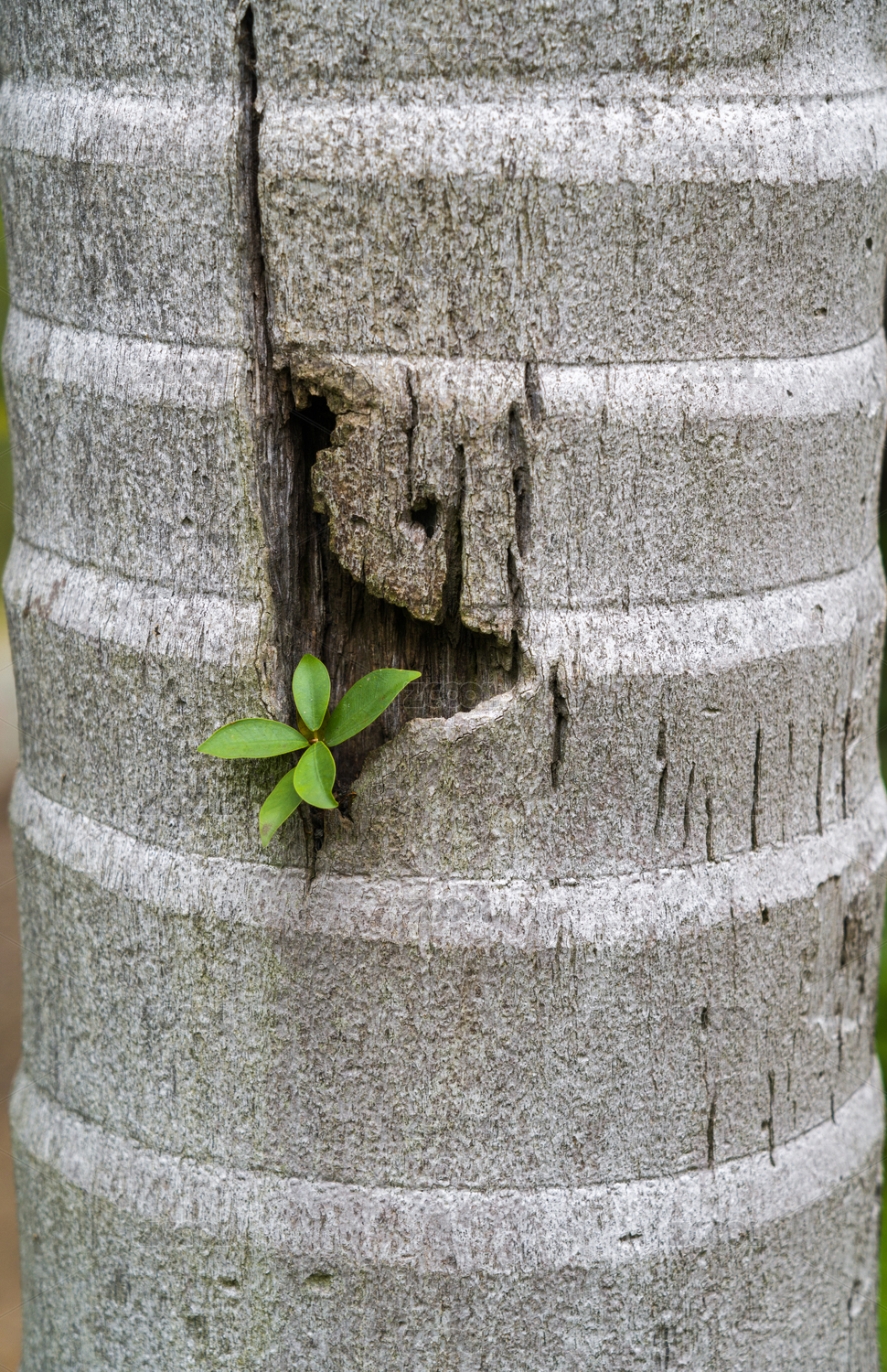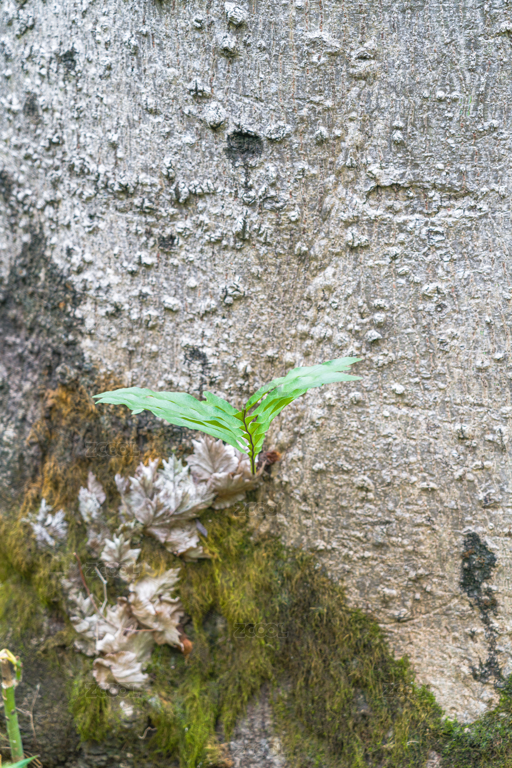 粗壯的老樹干上長出的嫩葉新芽特寫