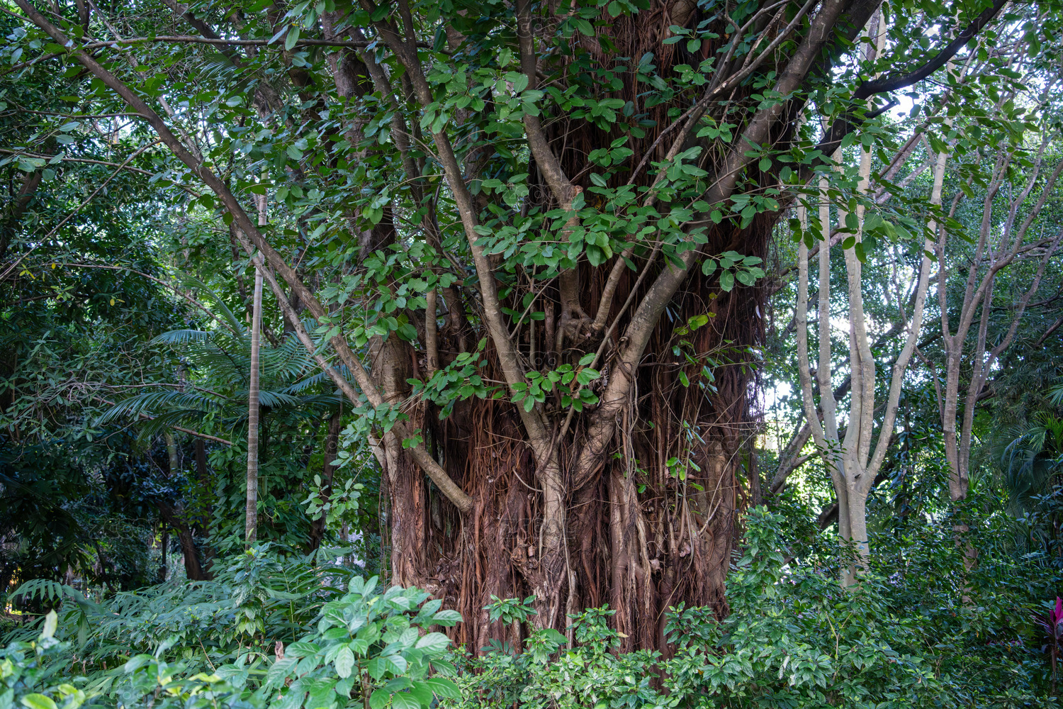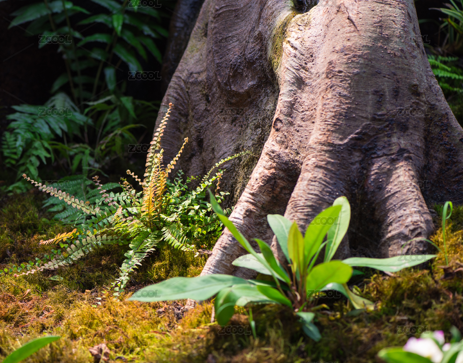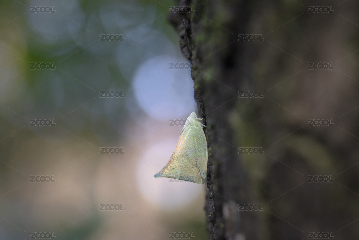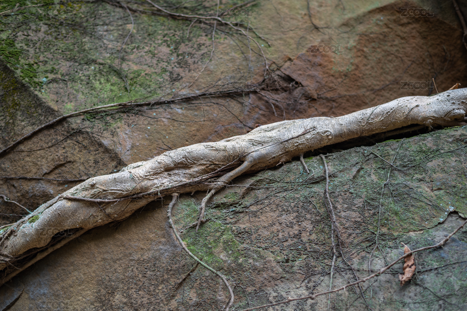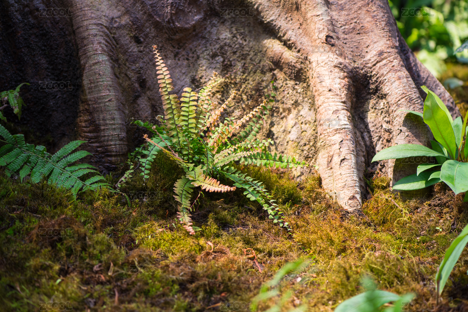 粗壯的老樹干上長出的嫩葉新芽特寫