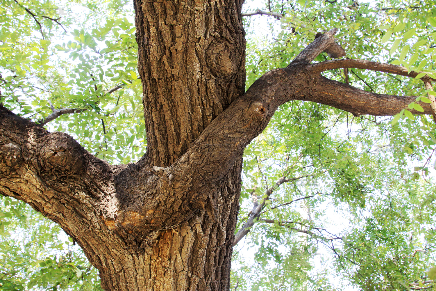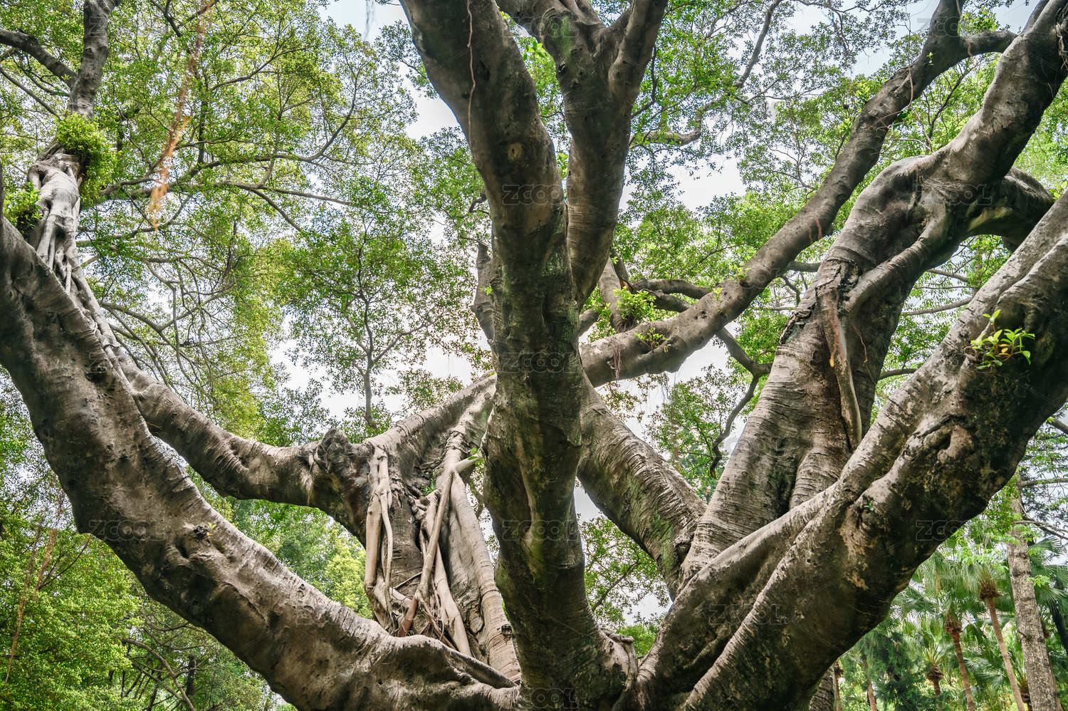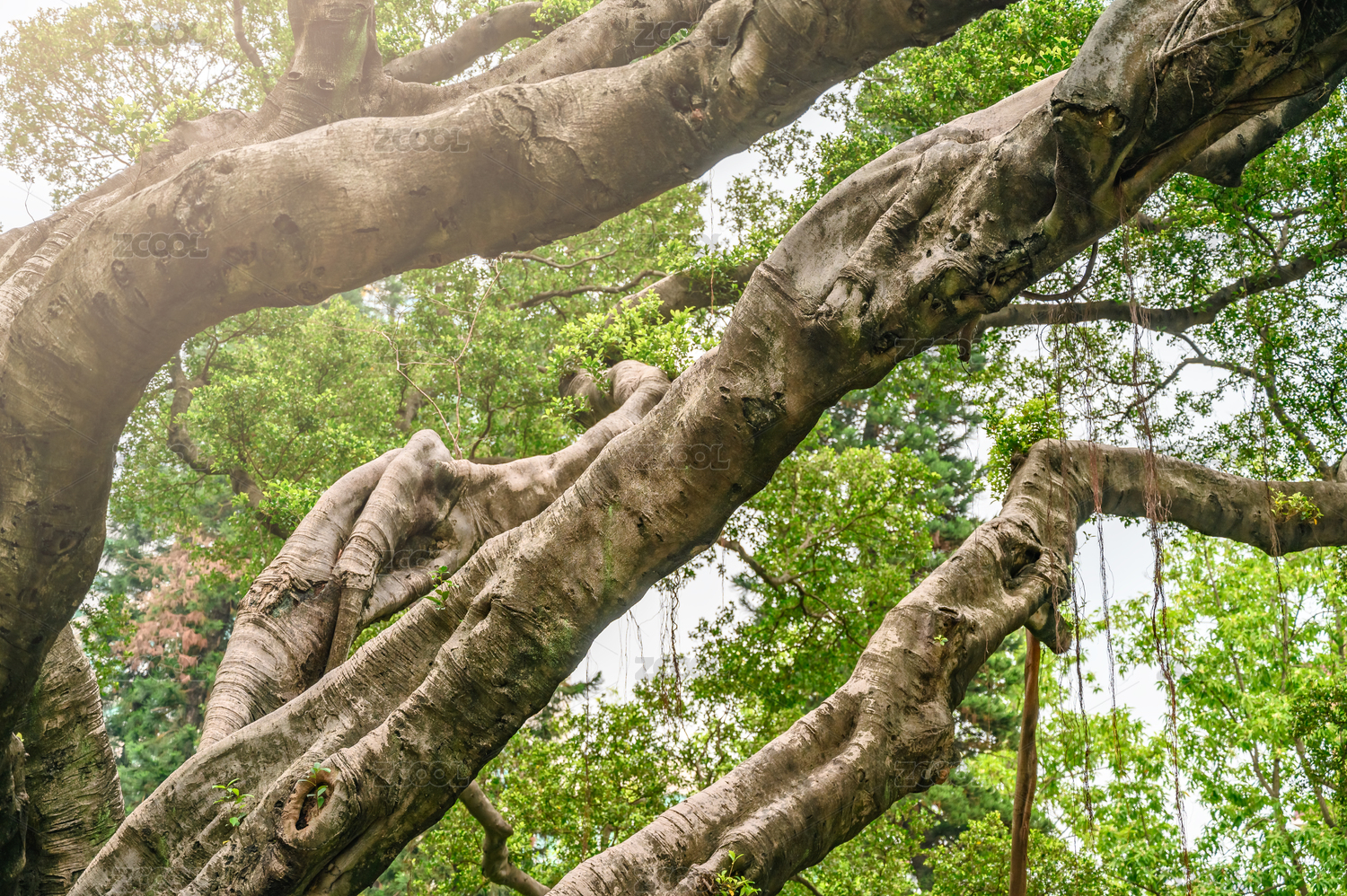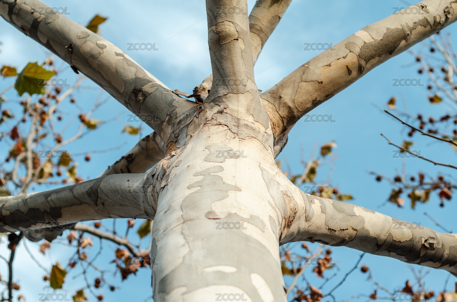仰拍梧桐樹,粗壯的樹干和稀疏的樹葉