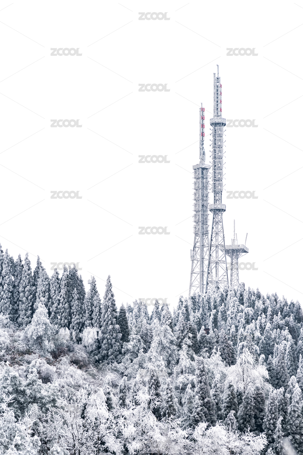 冰雪覆蓋的森林與冰凍的信號發(fā)射塔