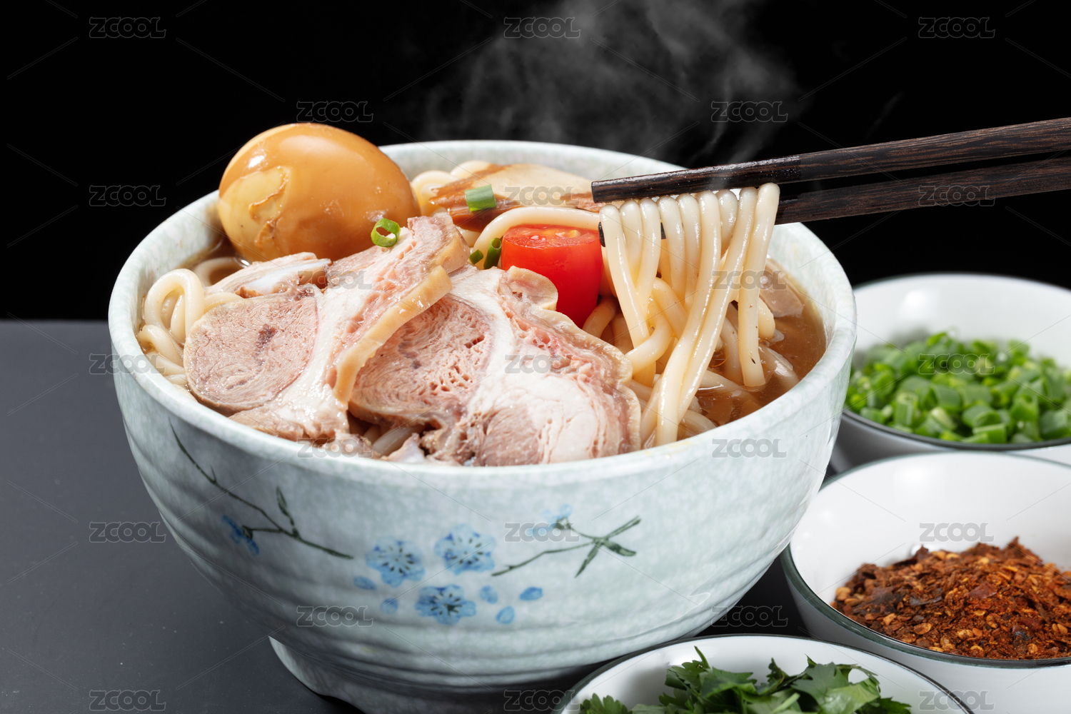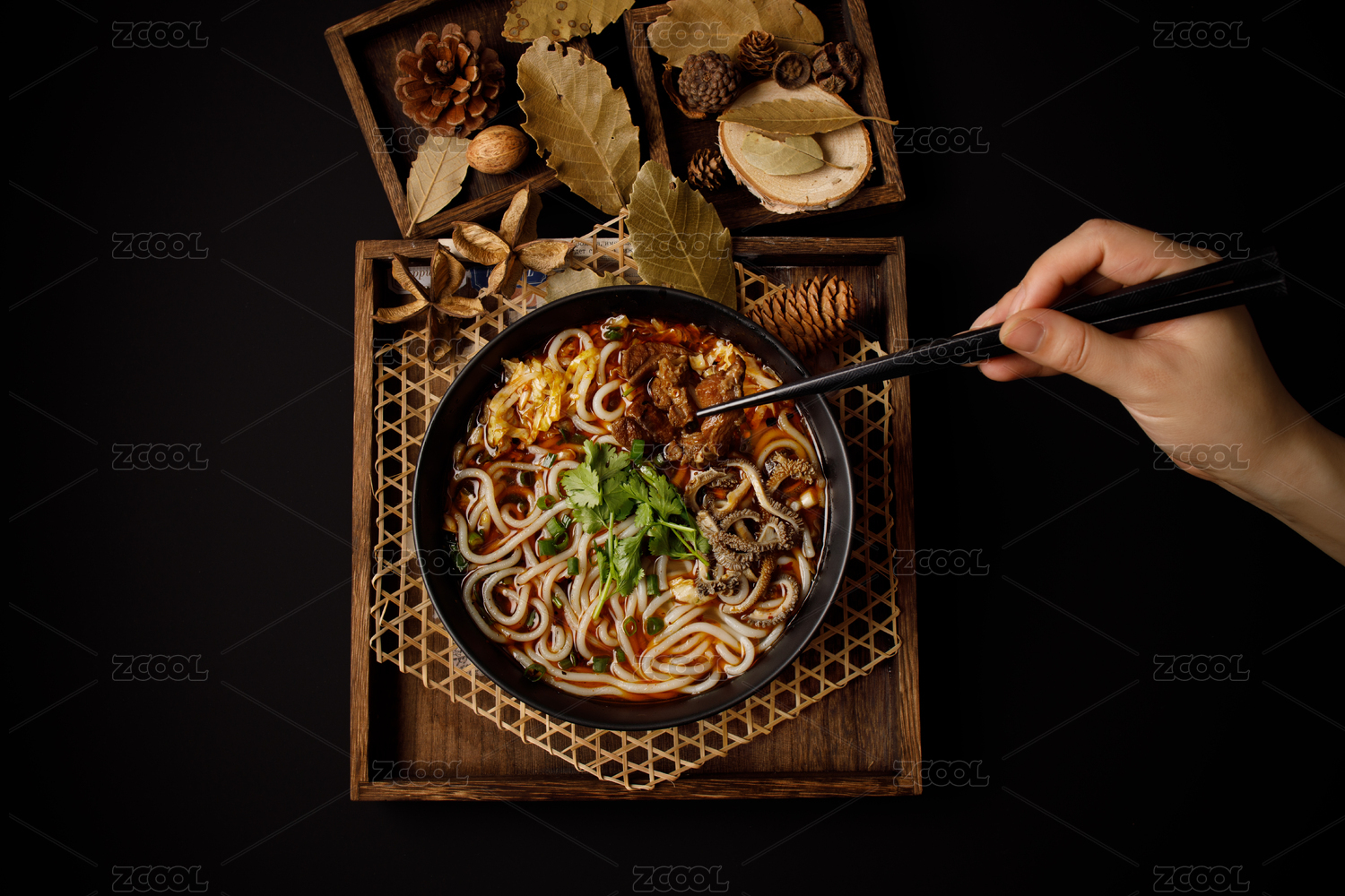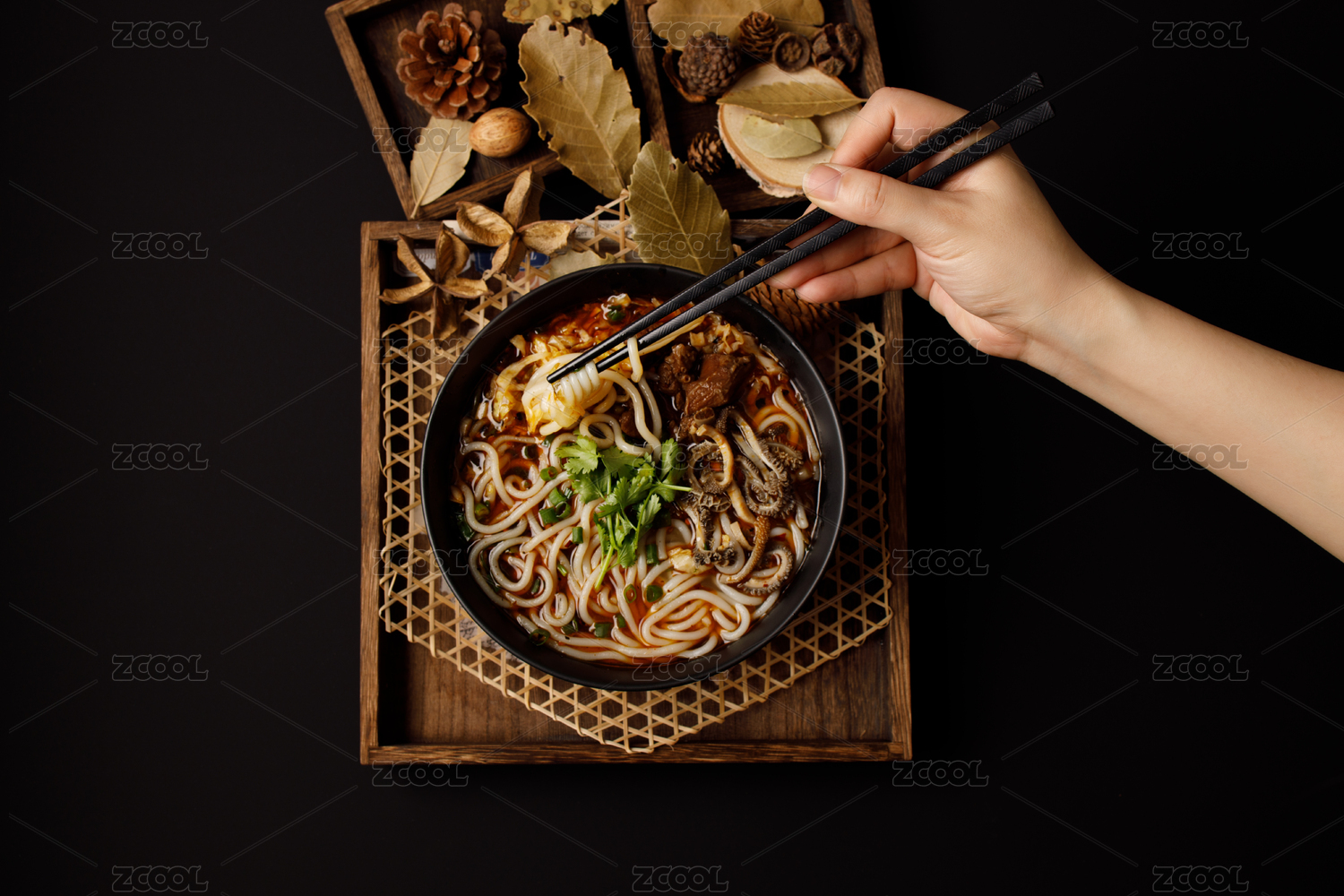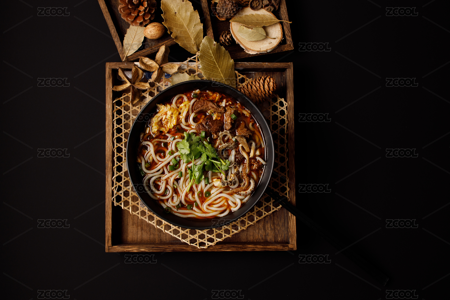 黑色背景木質(zhì)托盤上的一碗羊肉米粉