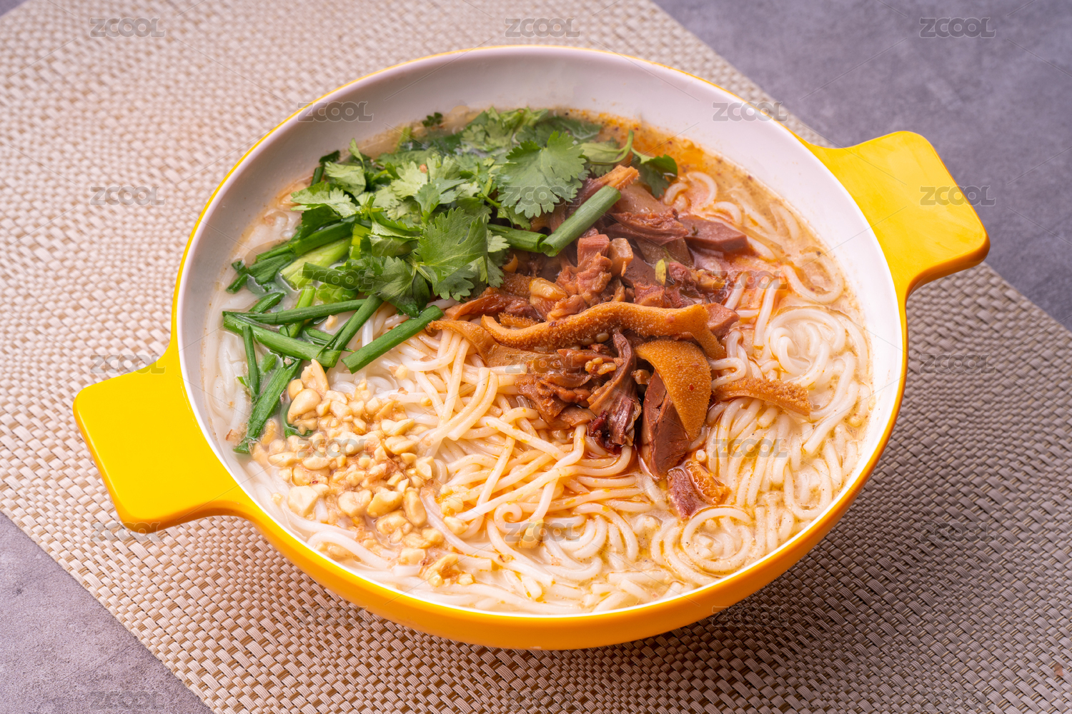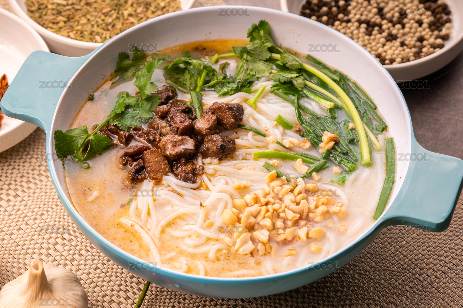 羊肉米線放在藍色碗里