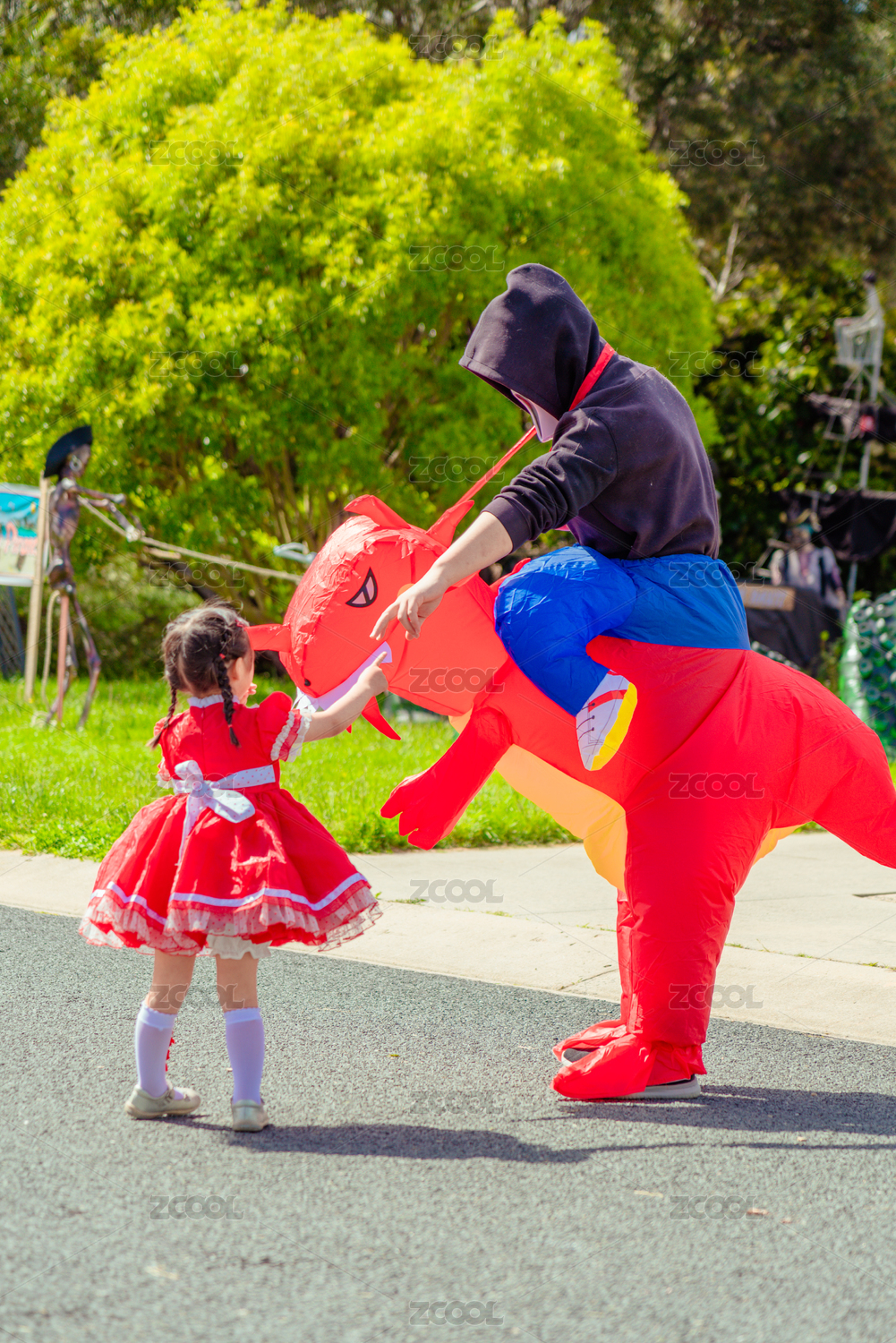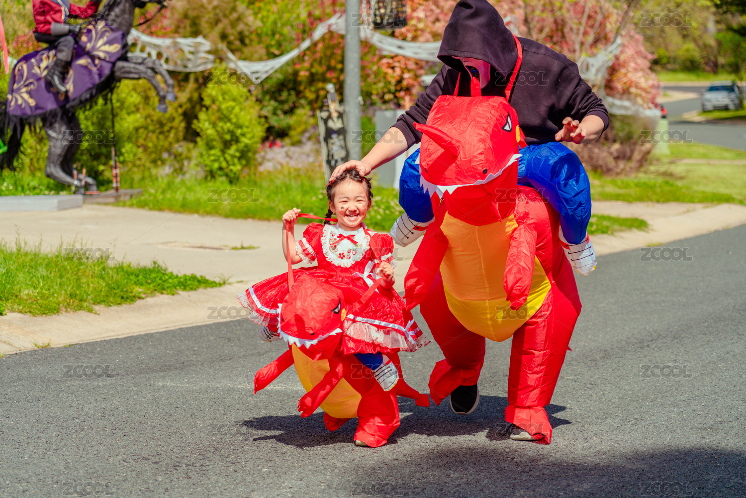 萬圣節(jié)與爸爸一起騎恐龍的紅裙子女孩