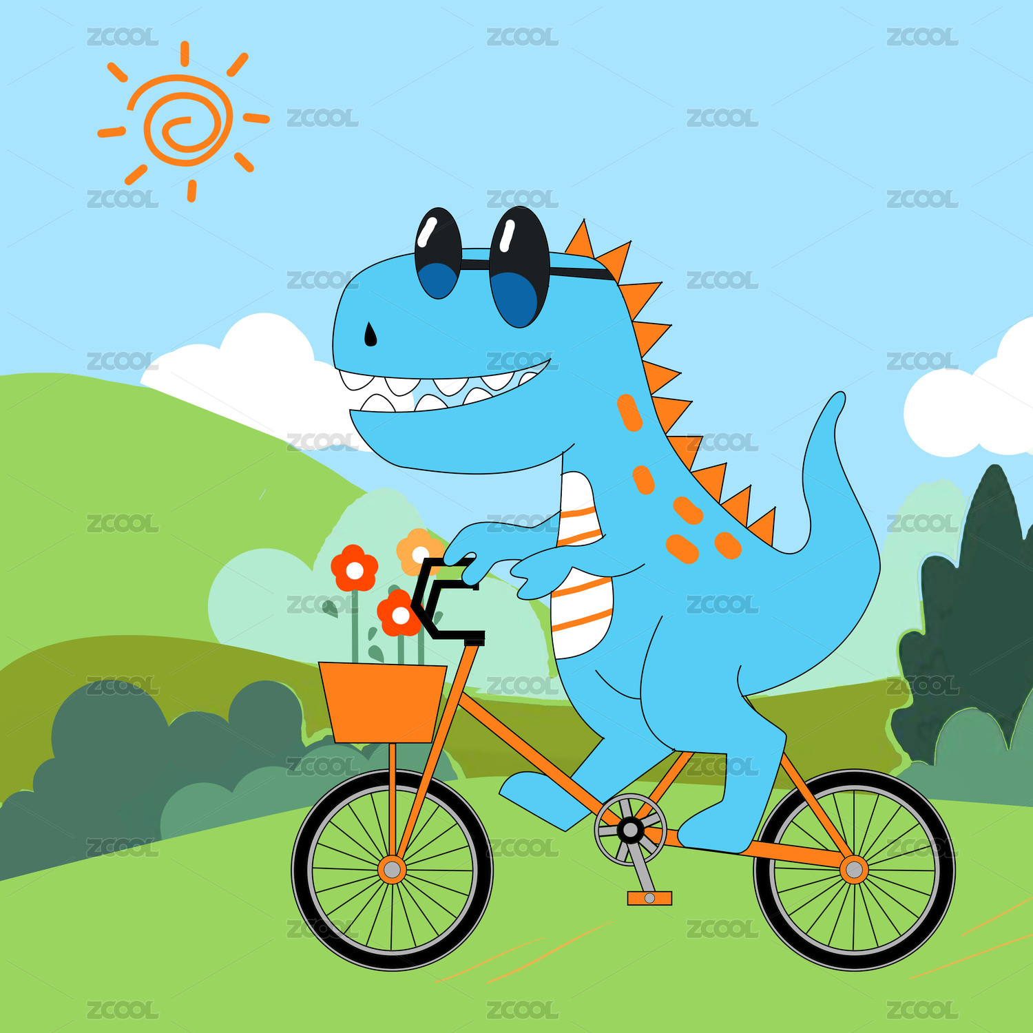 騎紅色自行車戴墨鏡的卡通長脖子恐龍