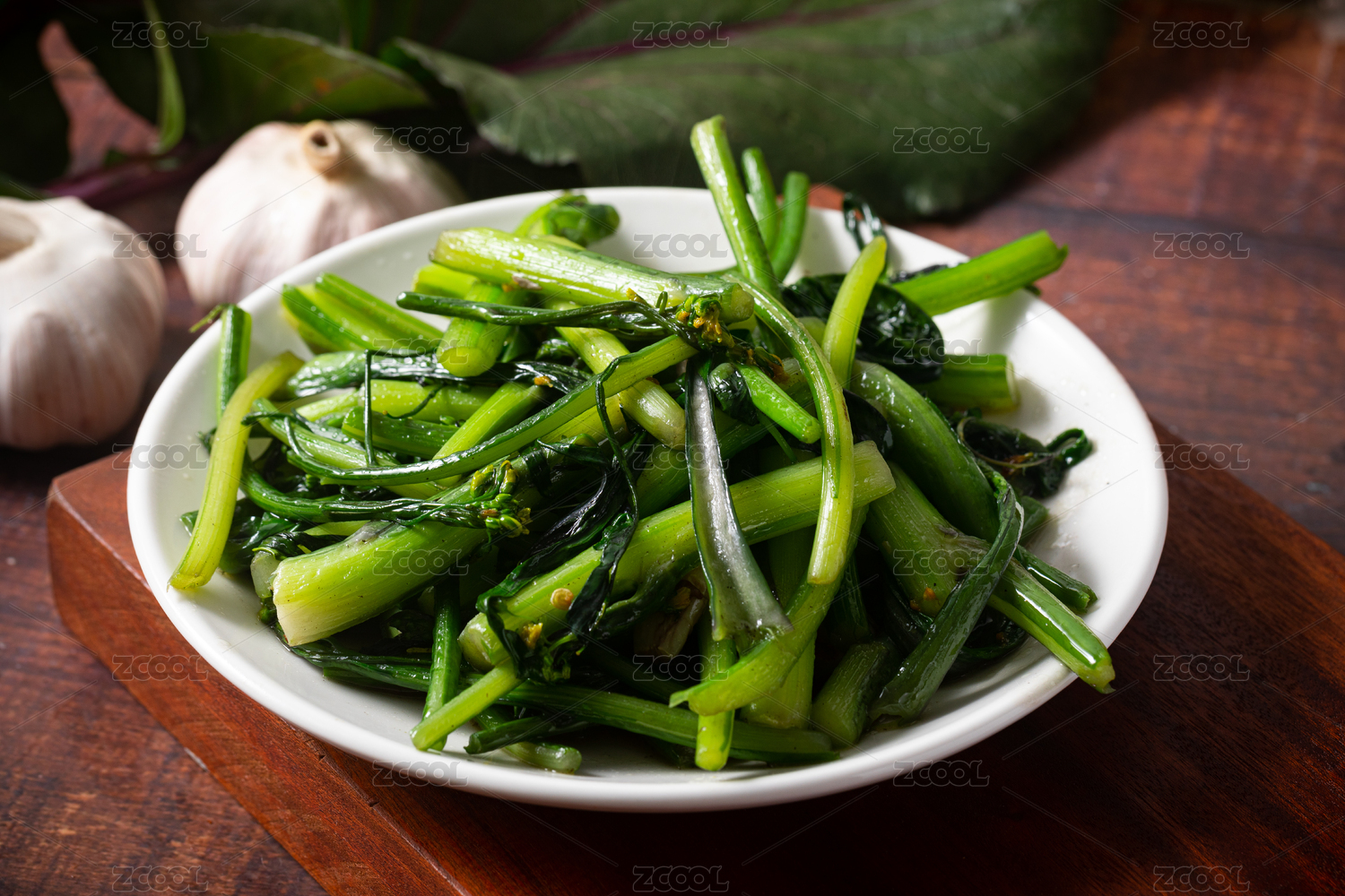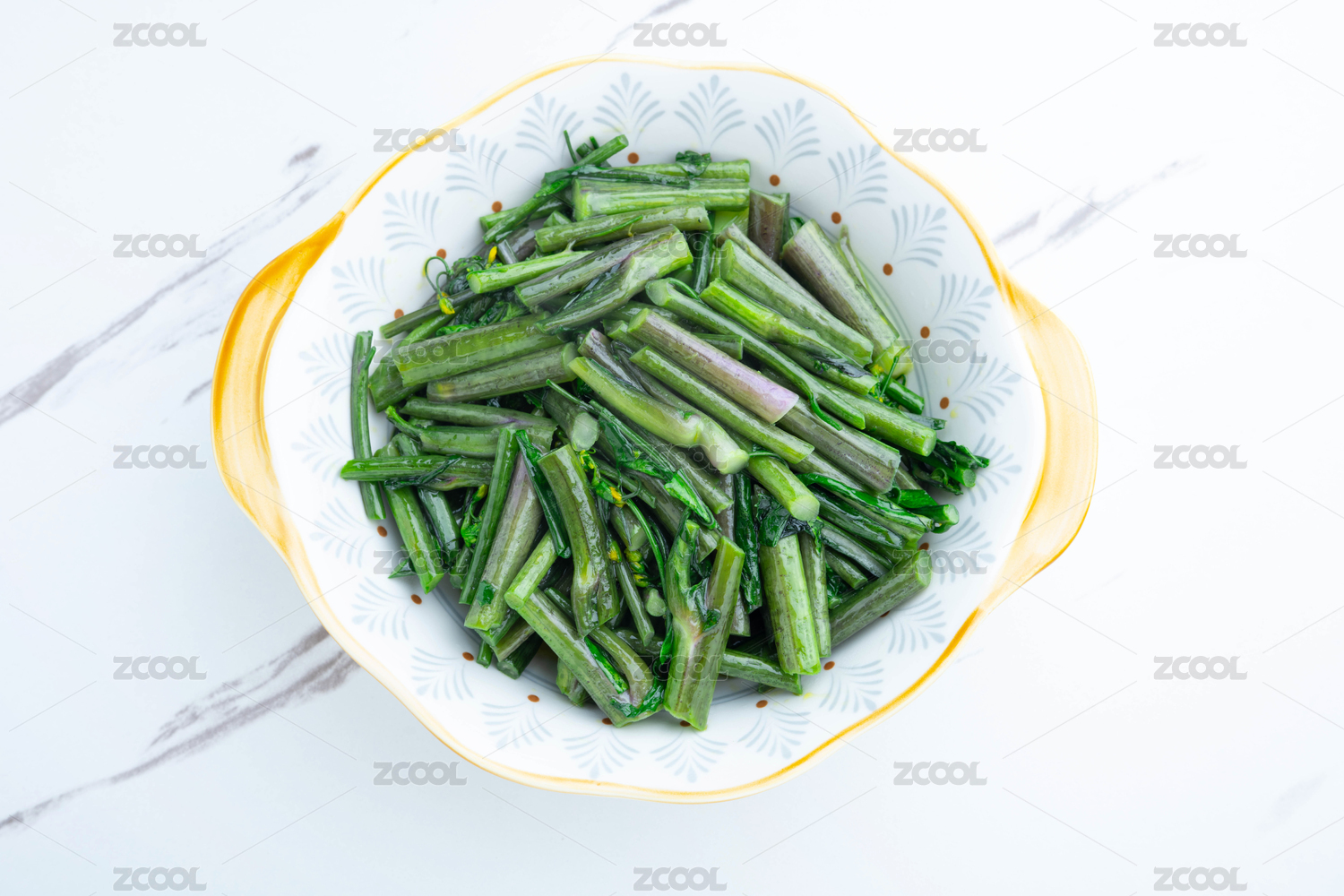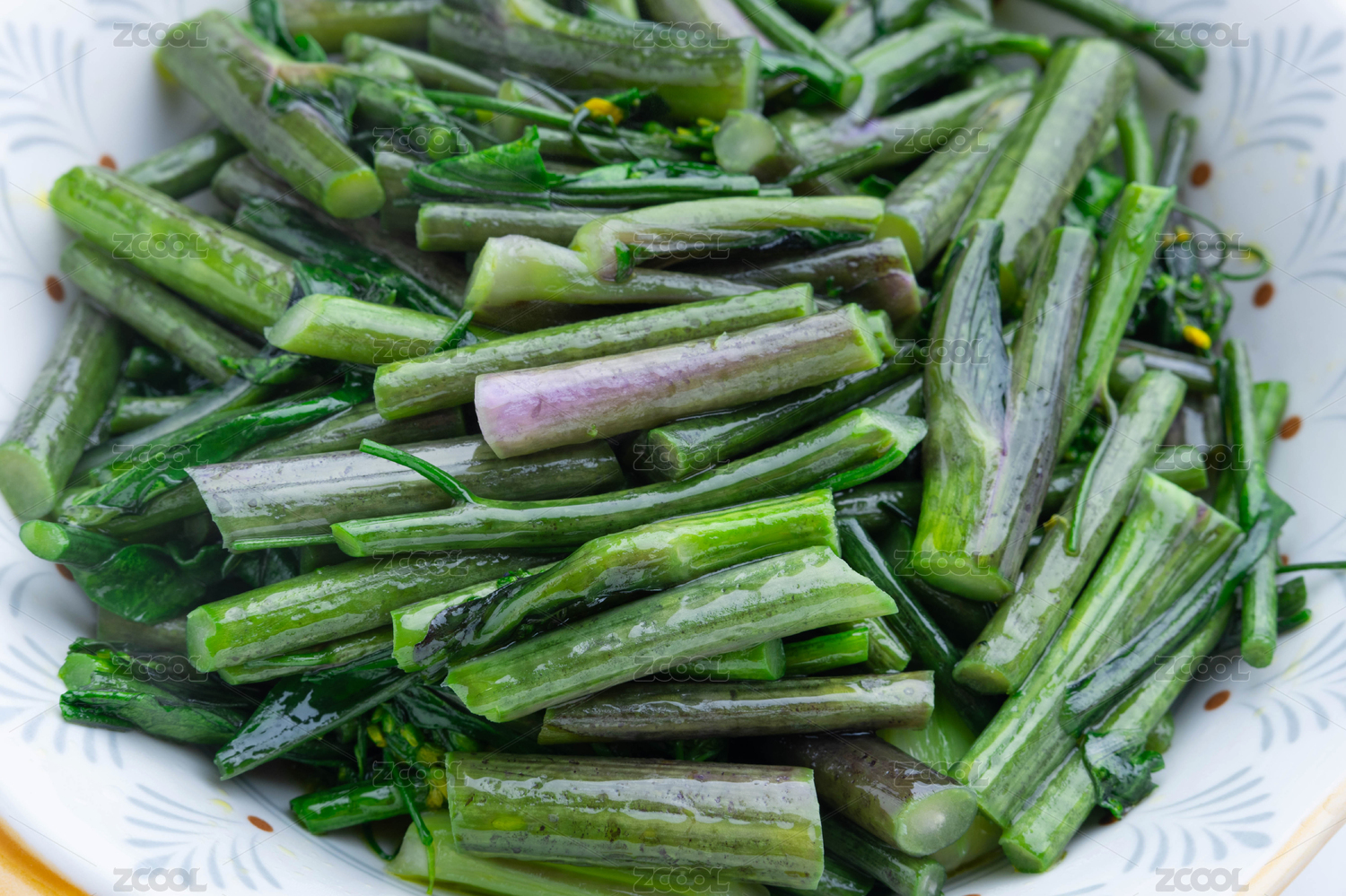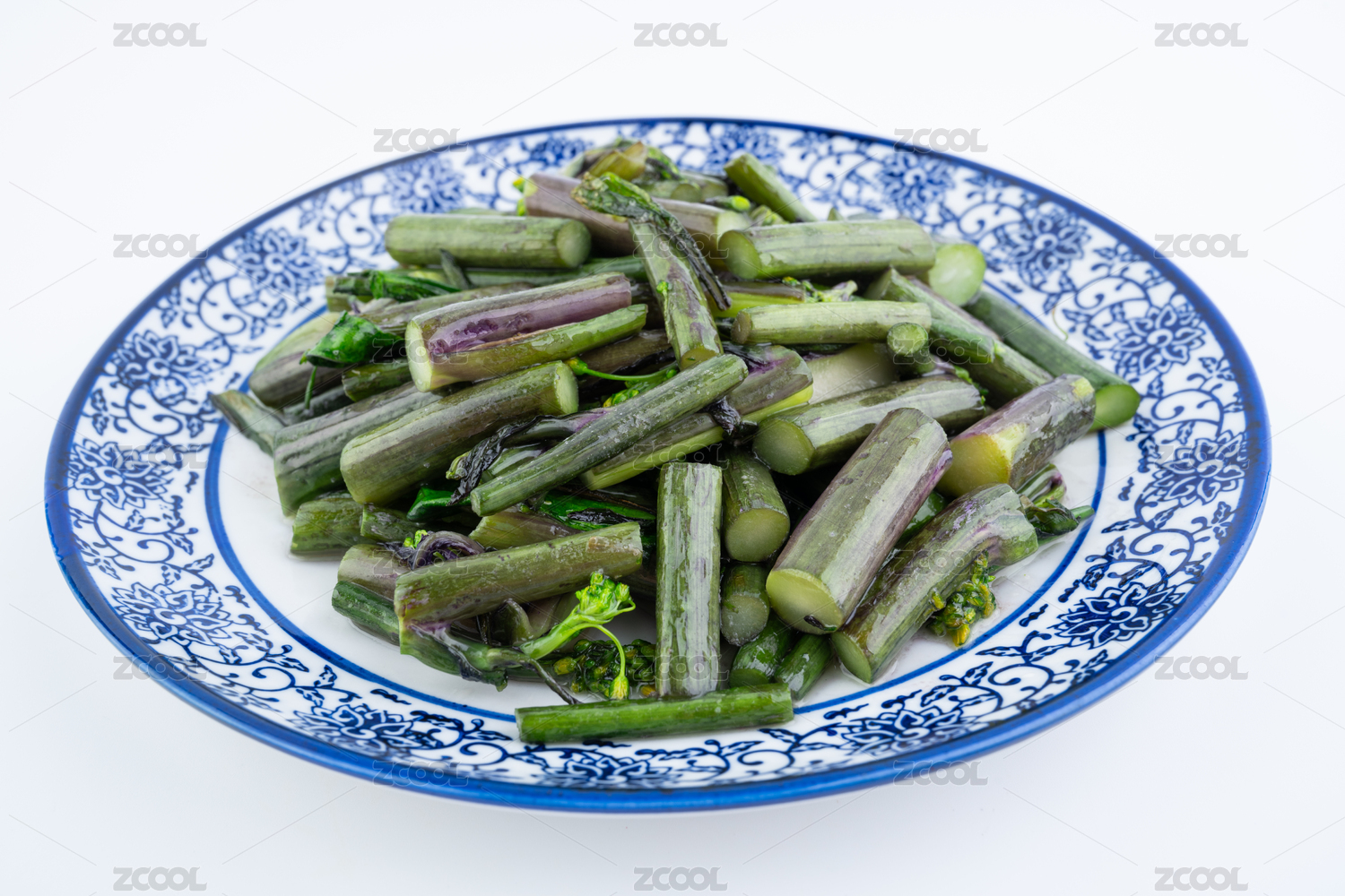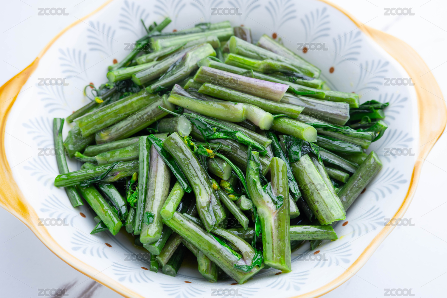 廚房瓷磚臺(tái)面上一碟中國(guó)家常菜炒紅菜苔