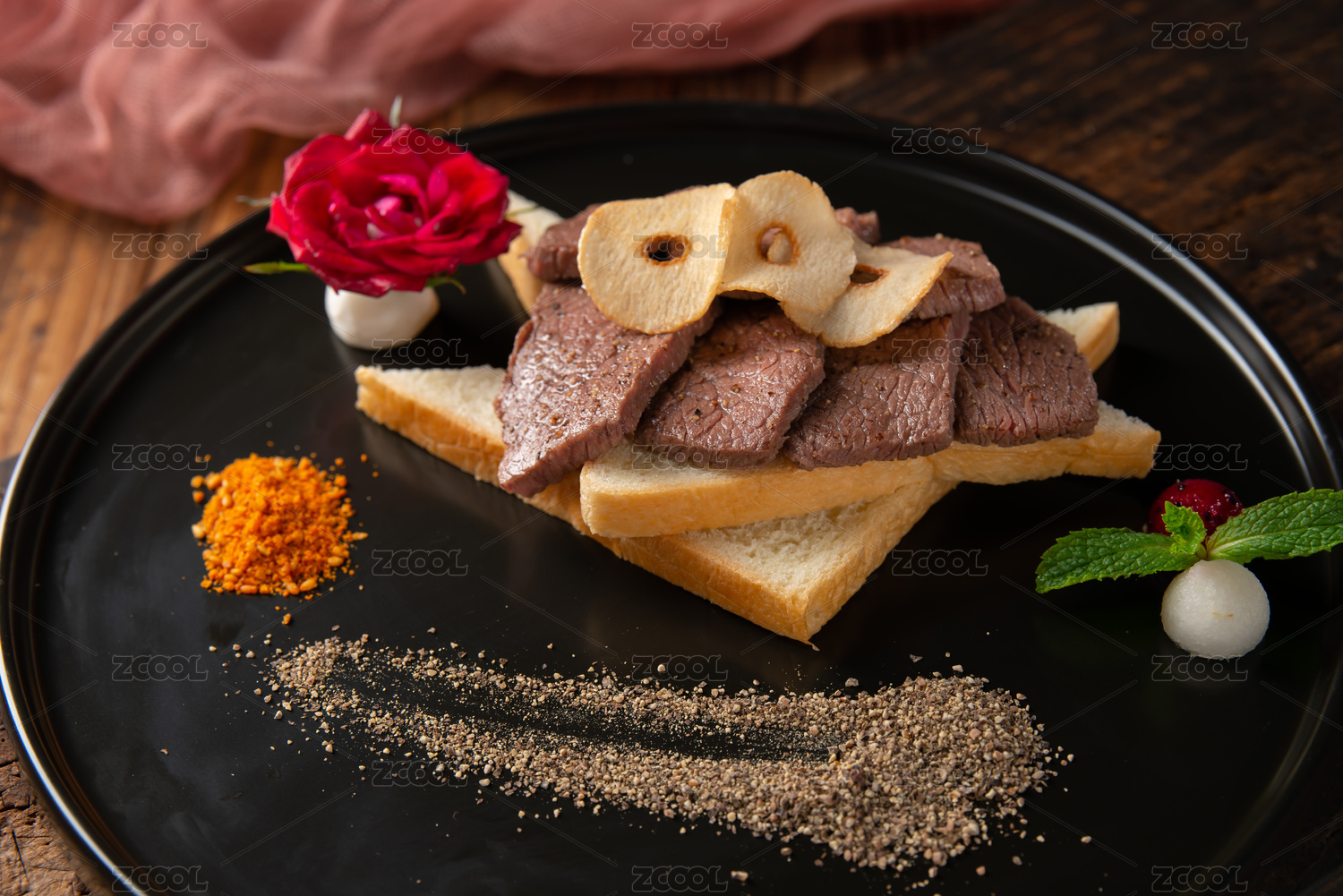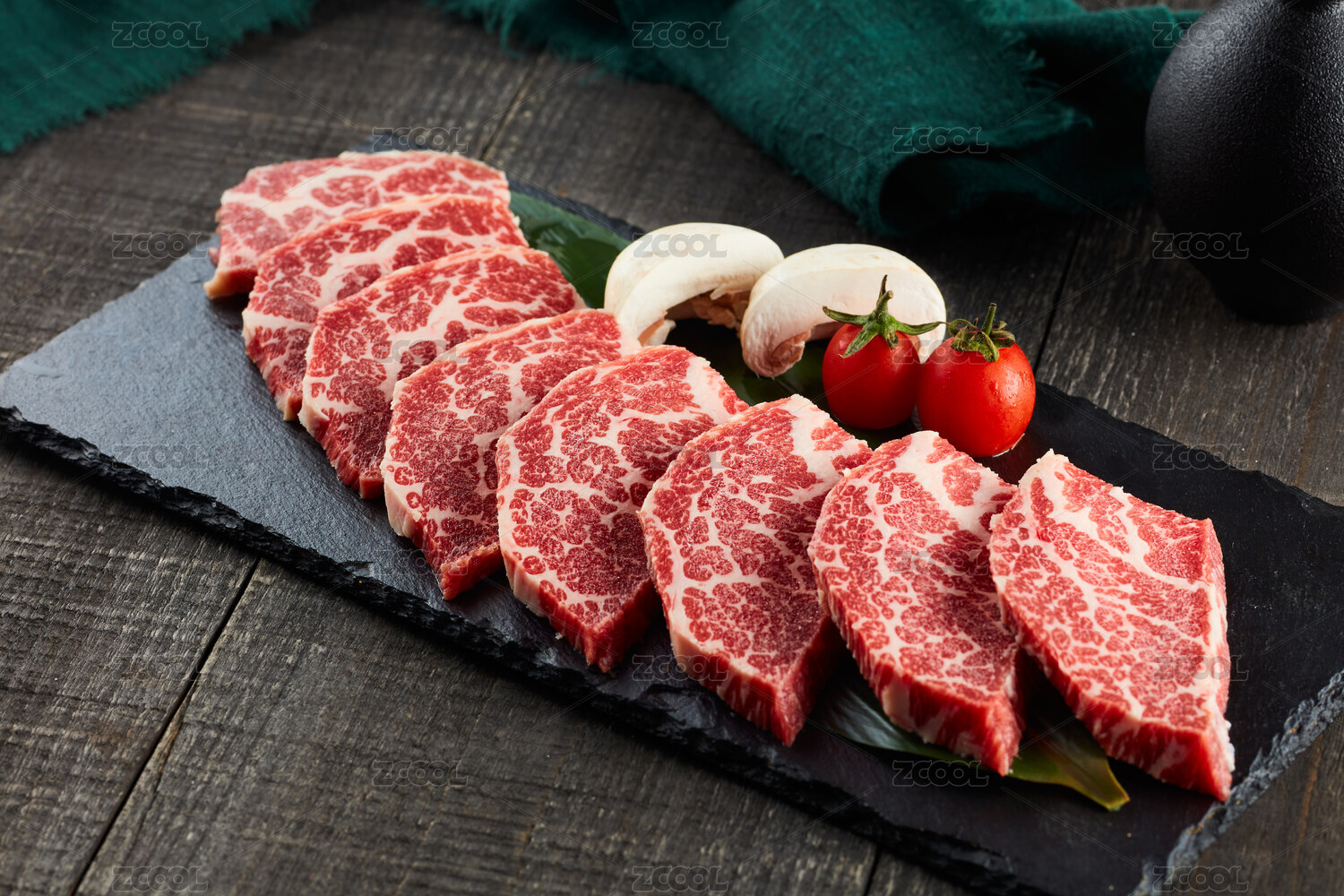 黑色盤子中的新鮮雪花牛小排