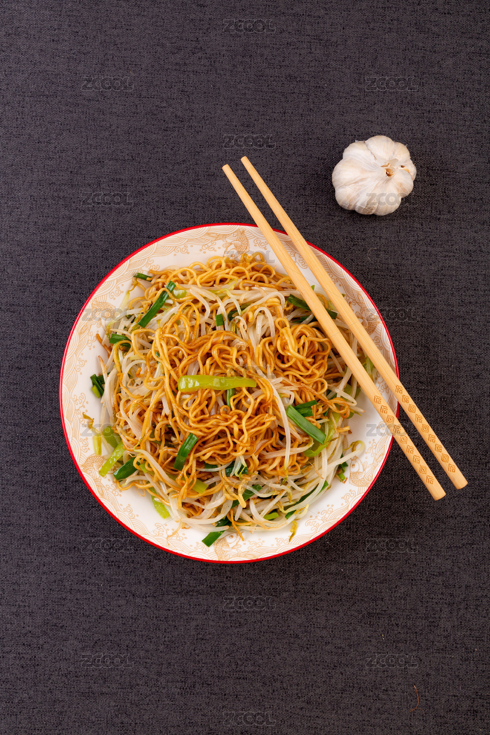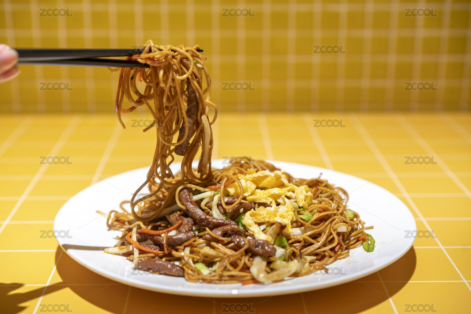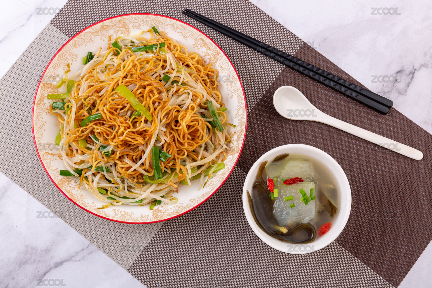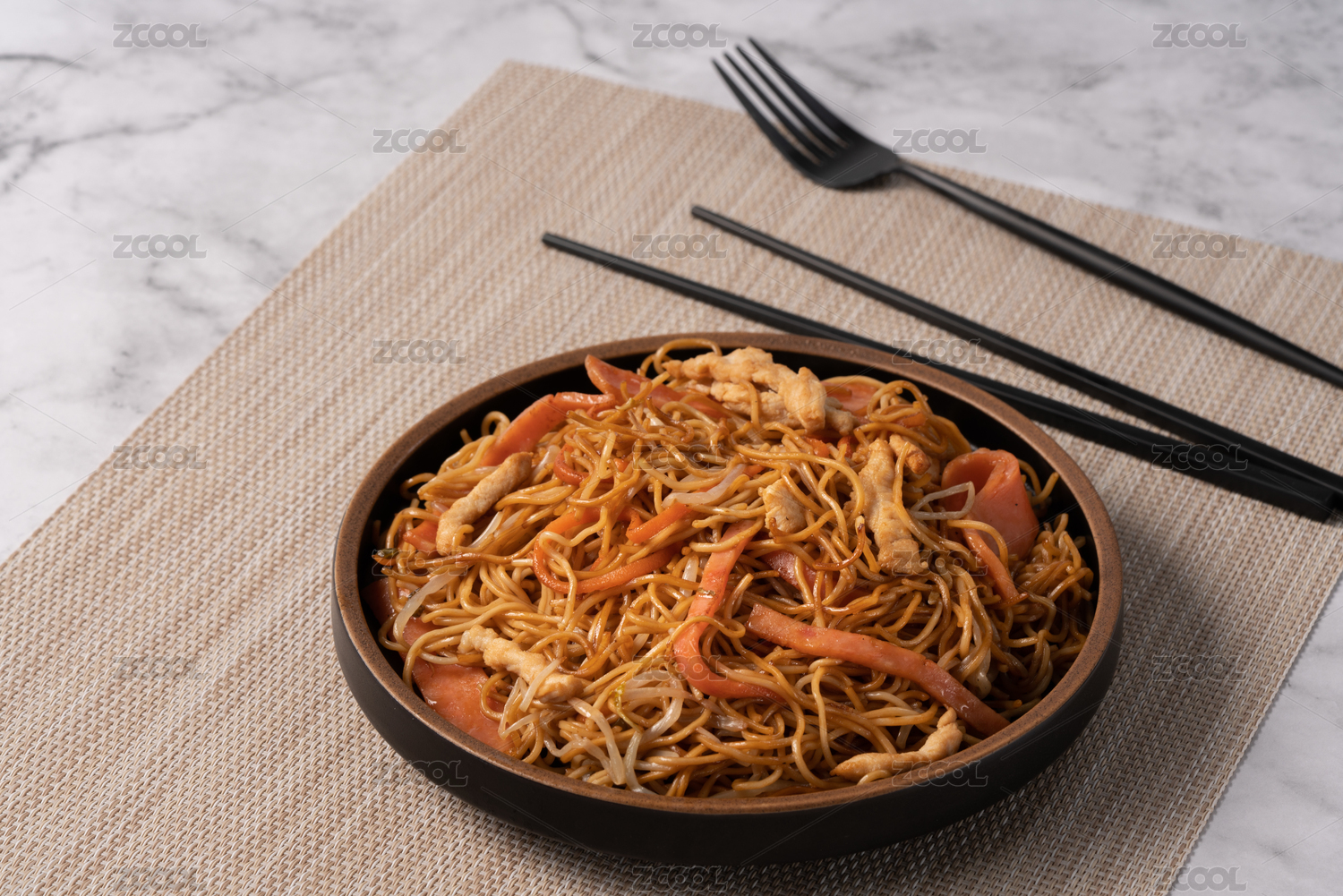 大理石桌面上的三絲炒面和旁邊的筷子,叉子