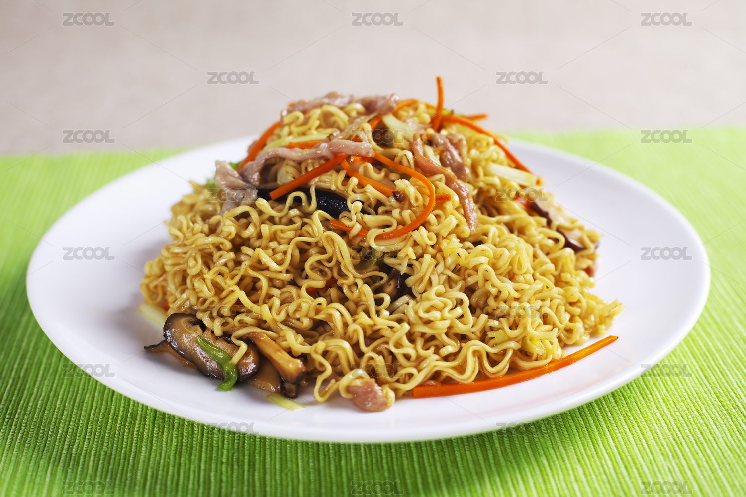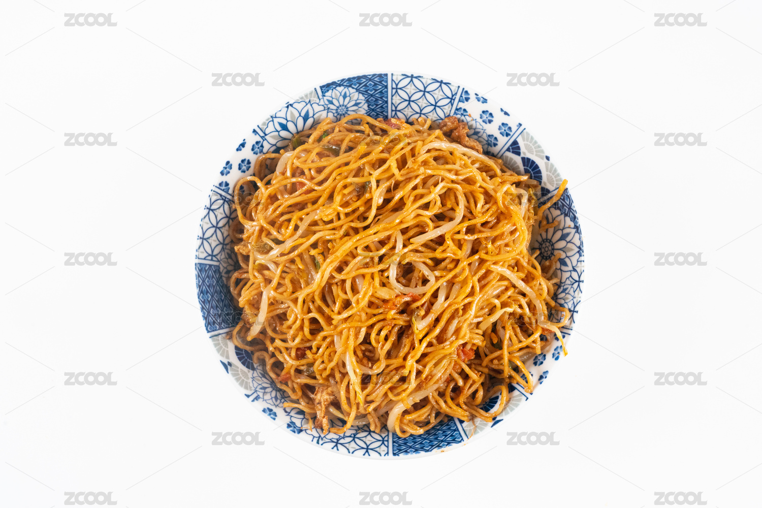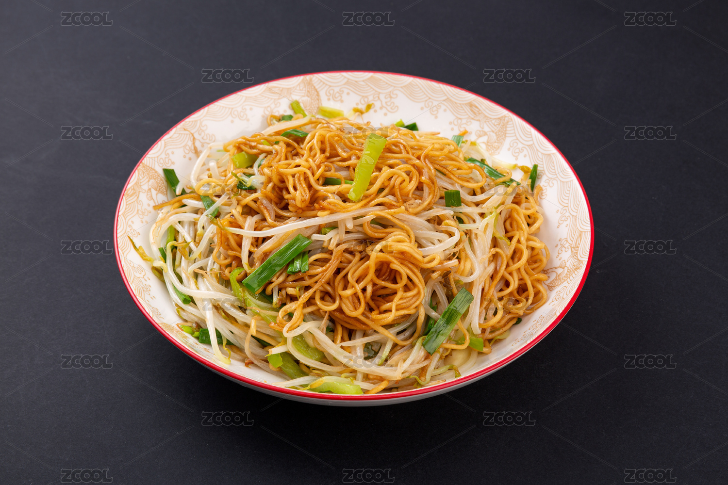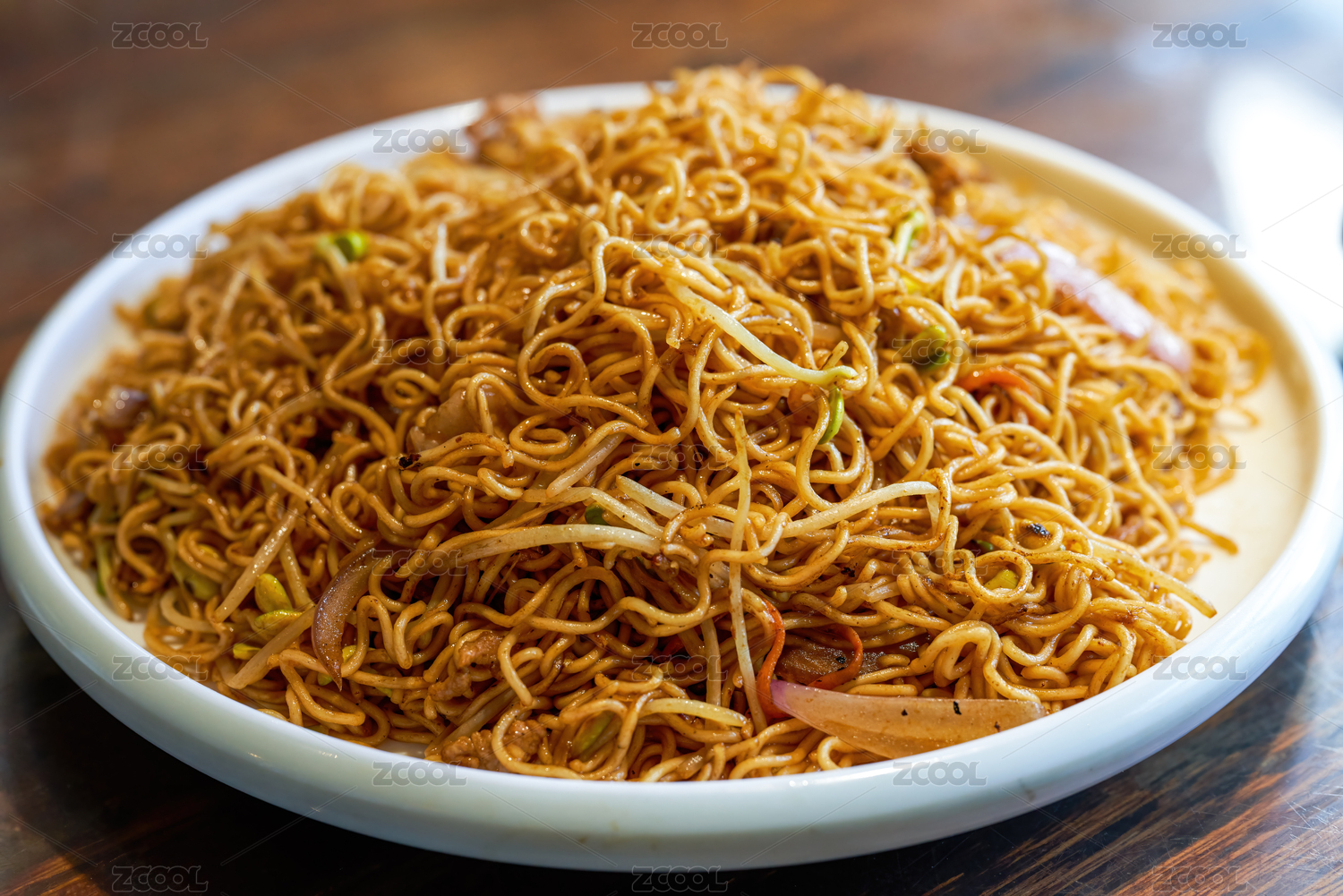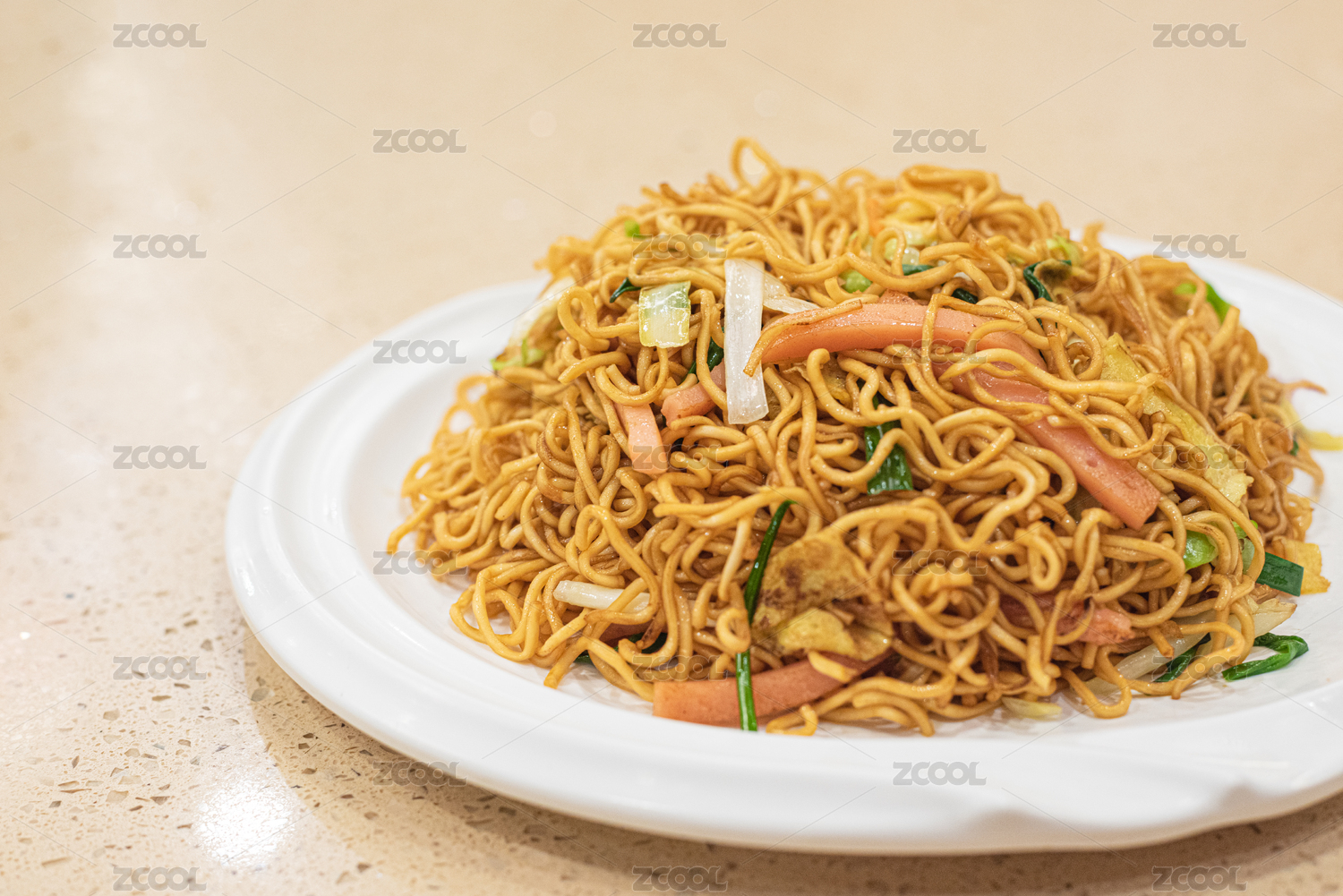 大理石桌面上的三絲炒面和旁邊的筷子,叉子