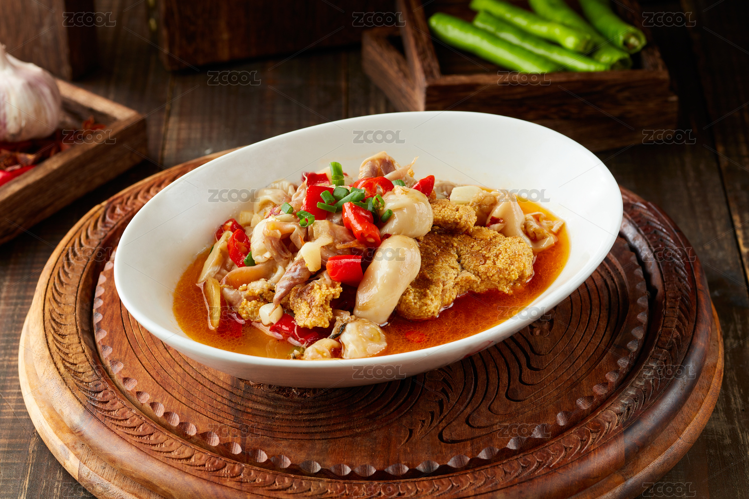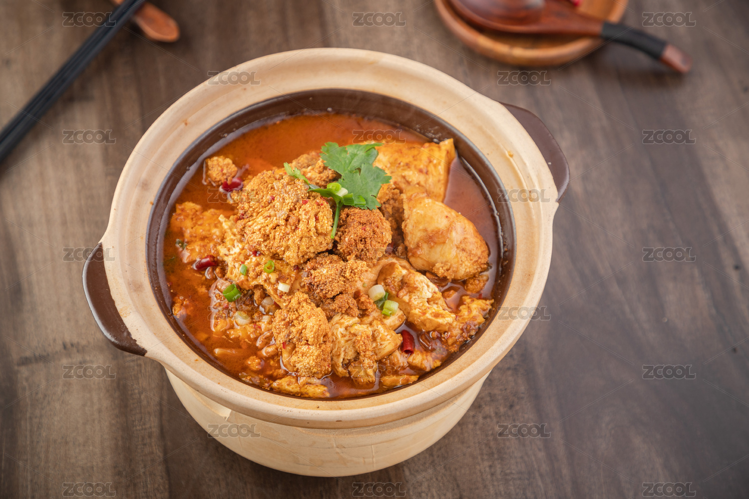 棕色問(wèn)桌上放著一盤(pán)砂鍋魚(yú)雜