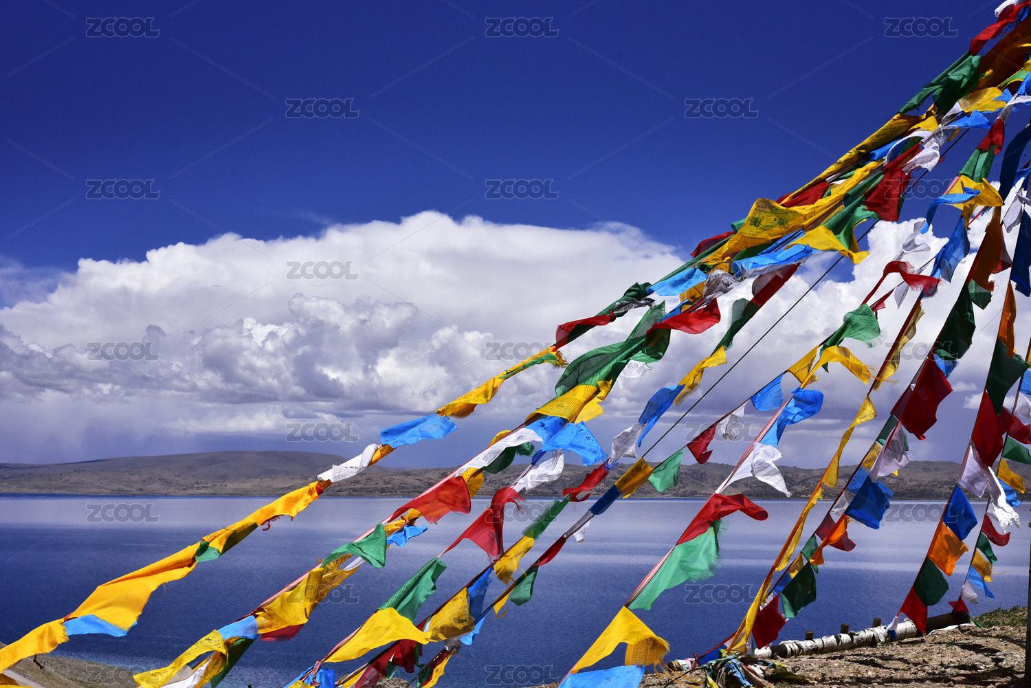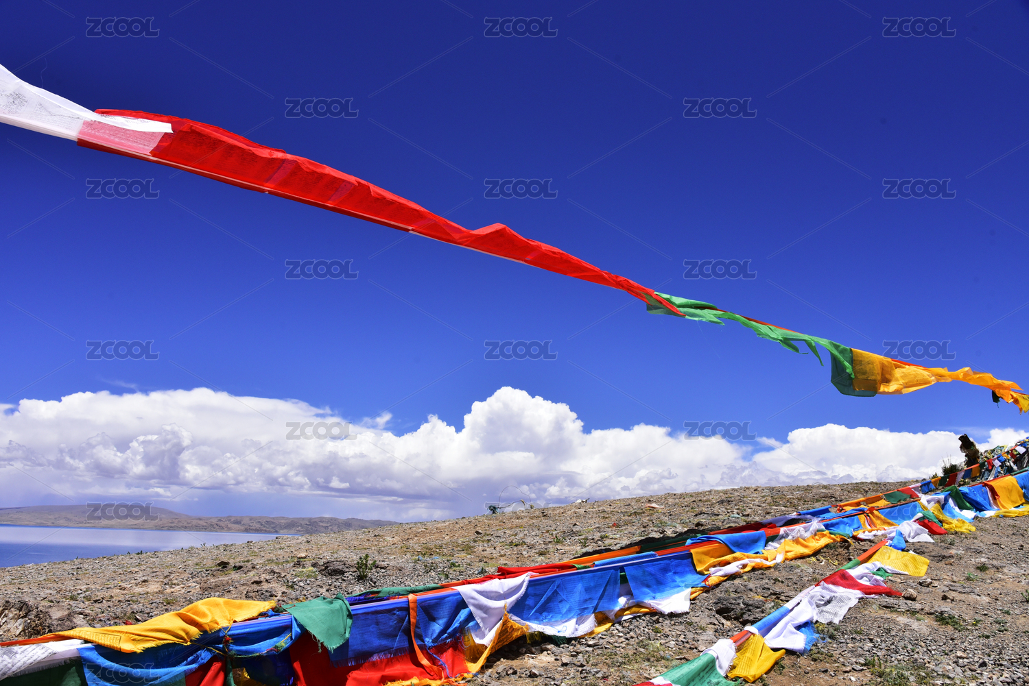 中國(guó)西藏圣湖納木錯(cuò)景區(qū)的五彩經(jīng)幡