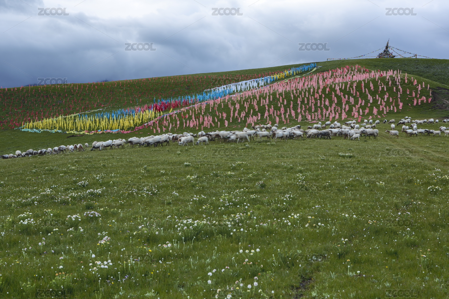 中國(guó)四川阿壩若爾蓋草原藍(lán)天白云五彩經(jīng)幡草原風(fēng)光