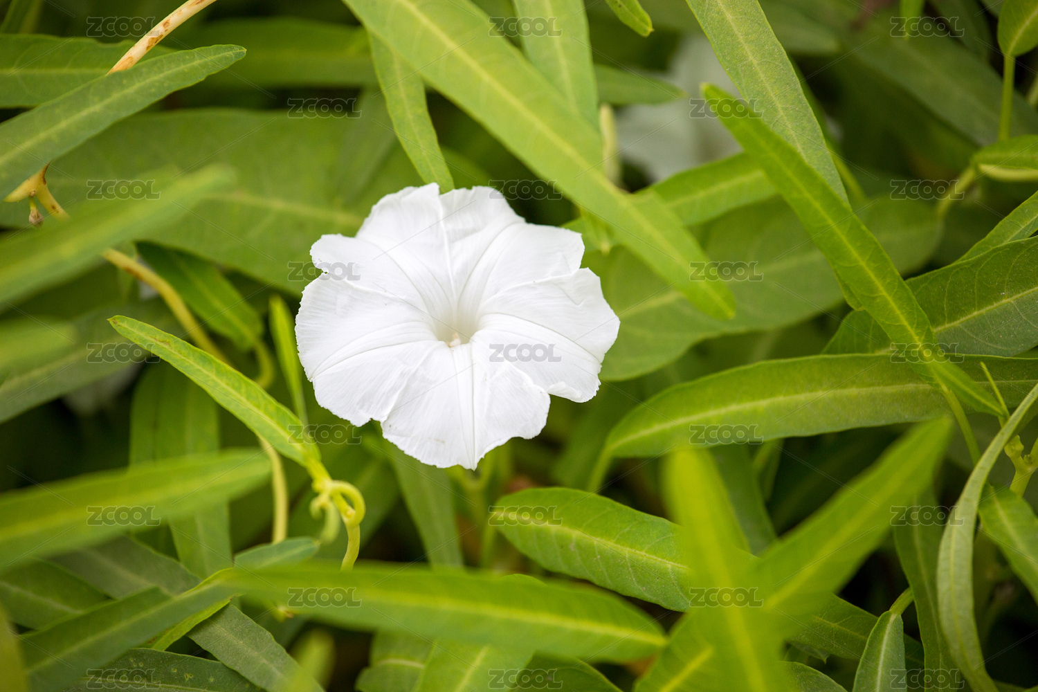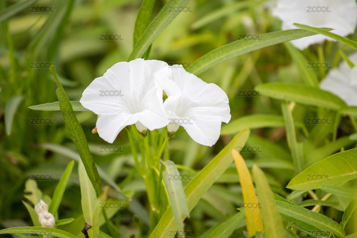 晴朗白晝田地上生長旺盛的通菜開出白色的花