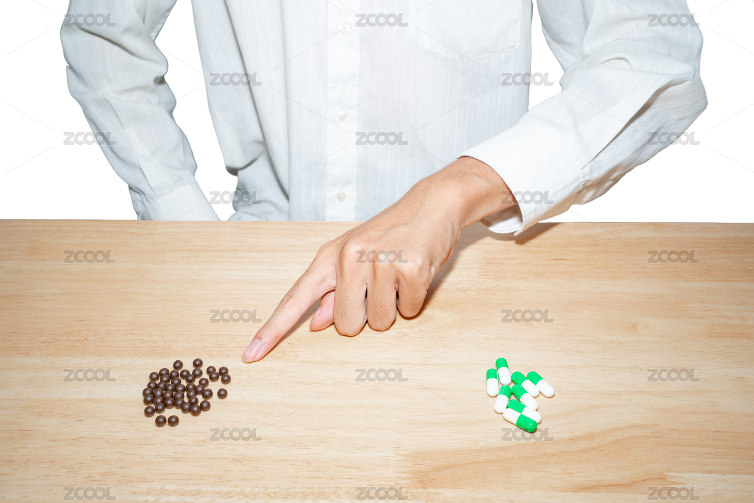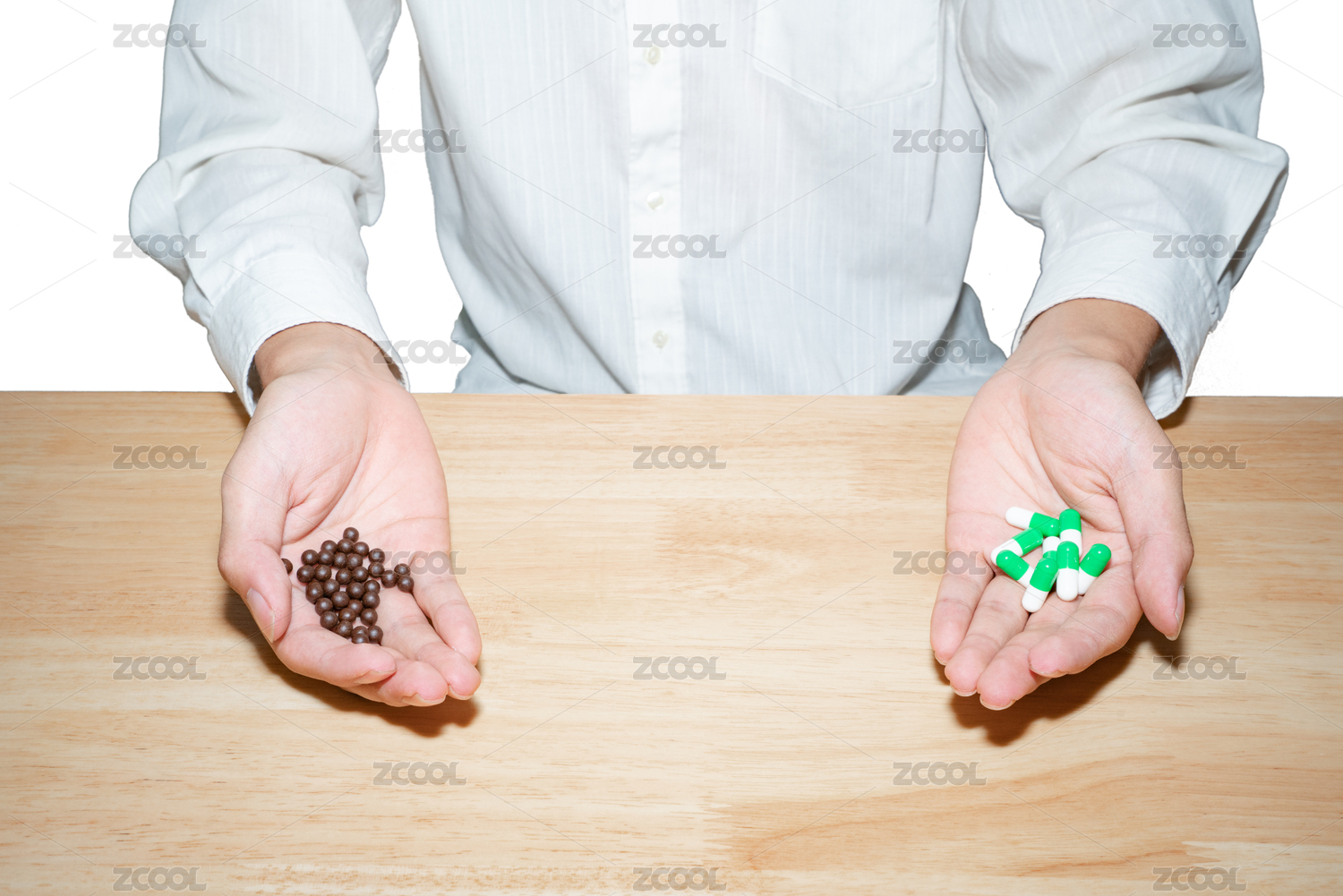 一個人在中醫(yī)西醫(yī)中藥西藥之間進行選擇手指著吃藥治病治療抑郁壓抑焦慮感冒流感概念