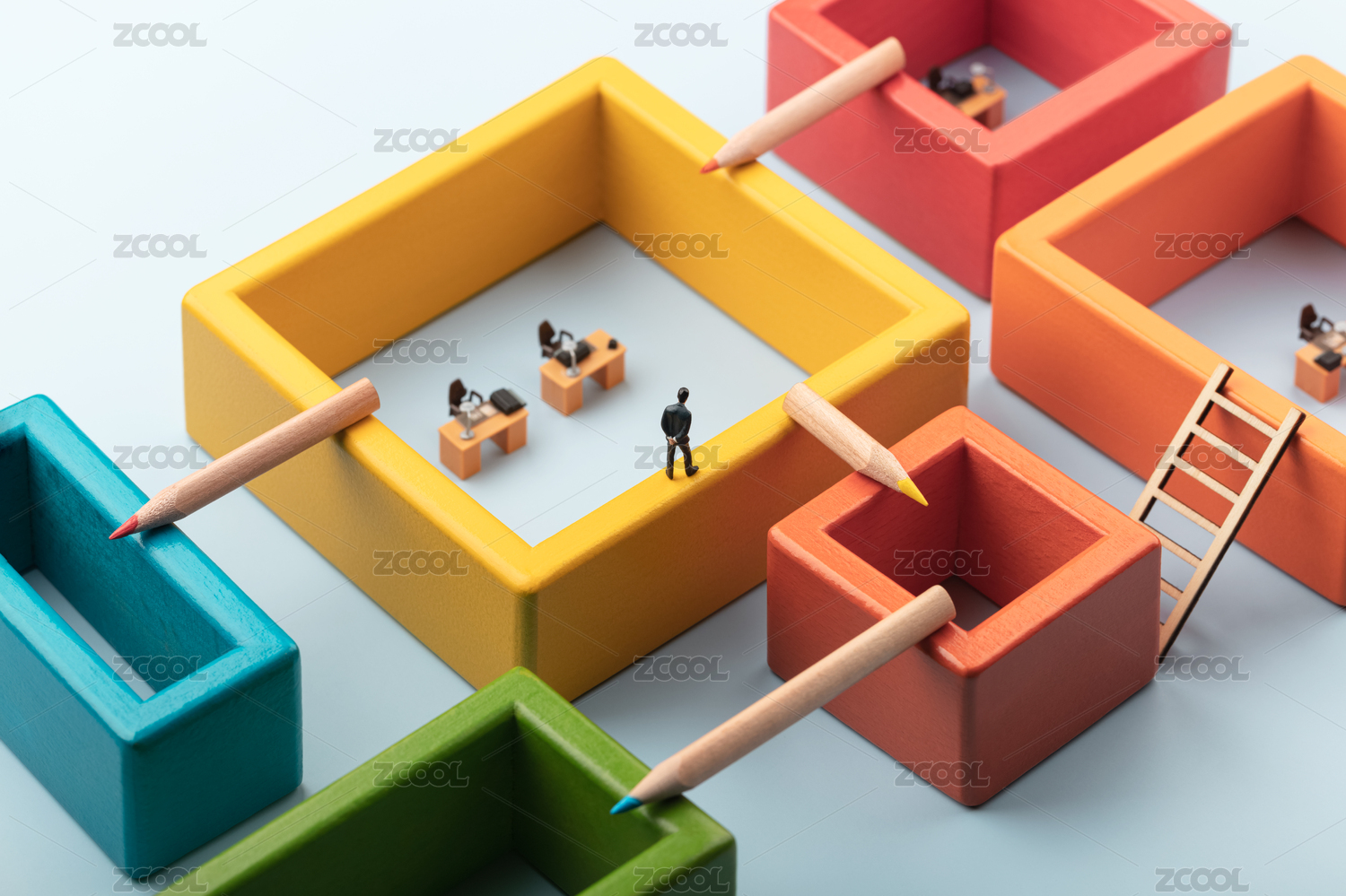 商務(wù)人士站在背景是拼圖的鉛筆上思考微縮創(chuàng)