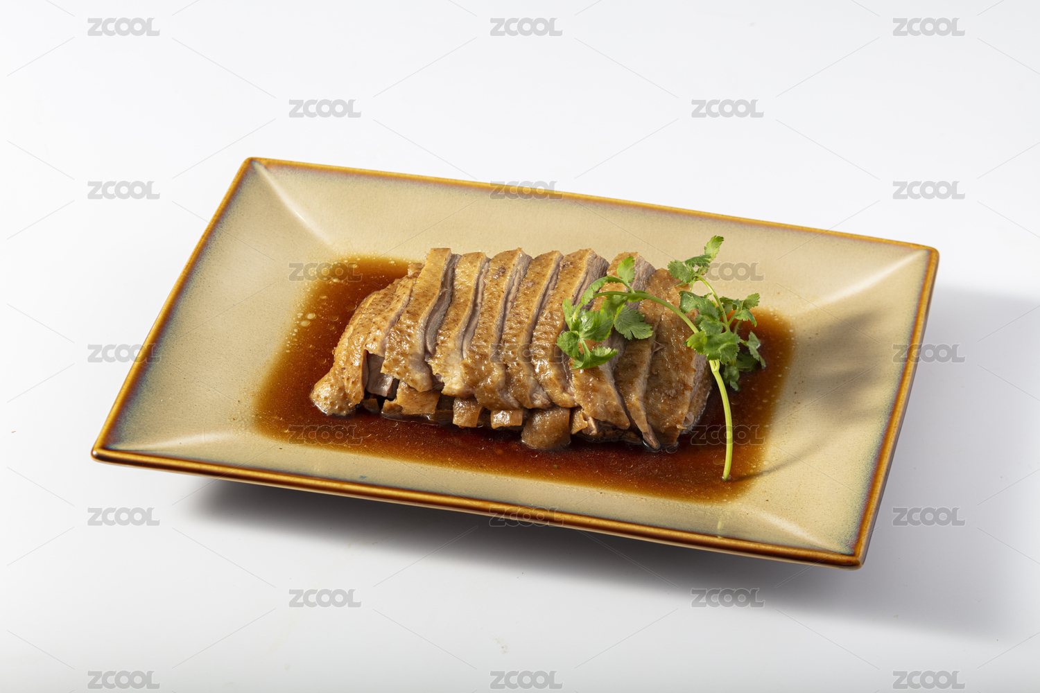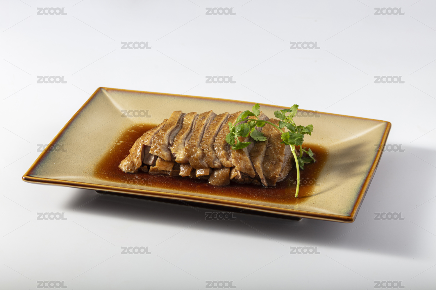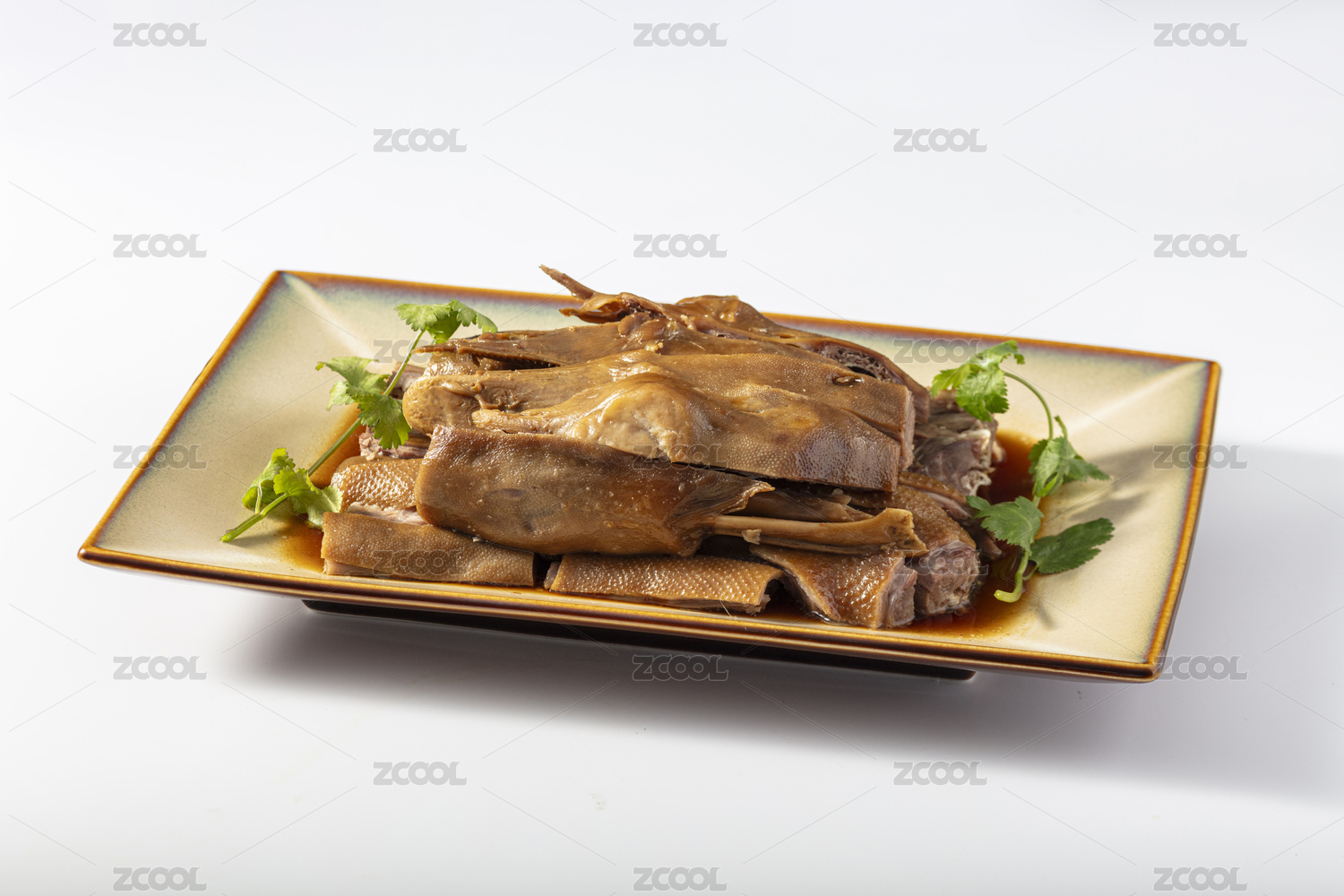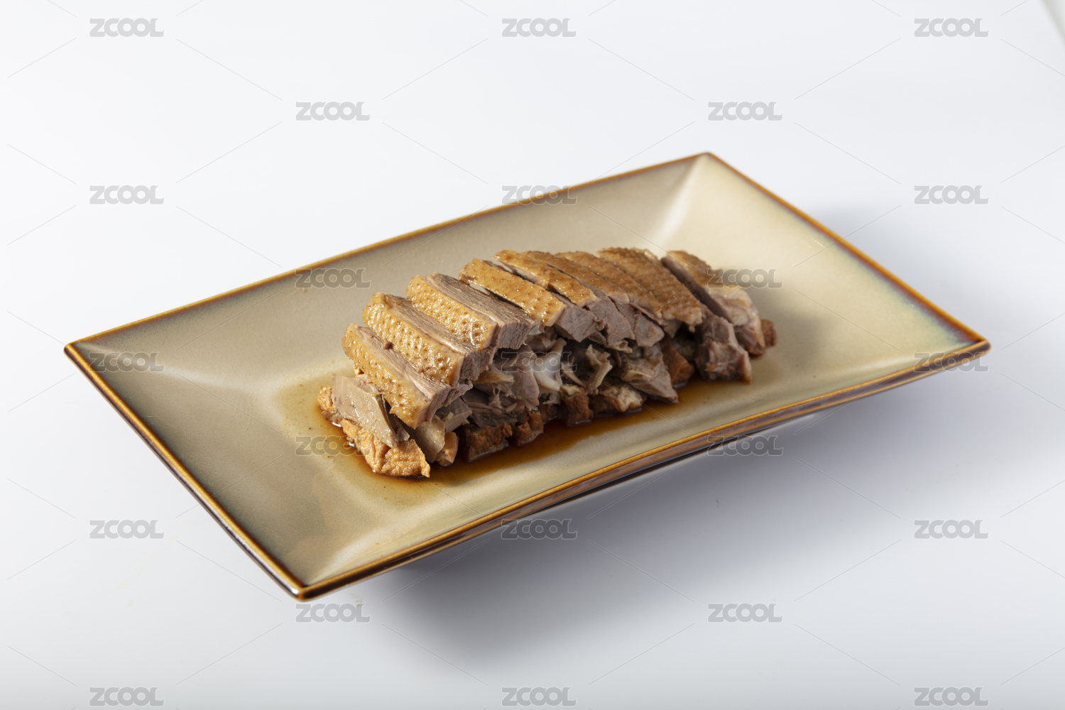 裝在綠色陶瓷盤子里面的板鴨鹵鴨子