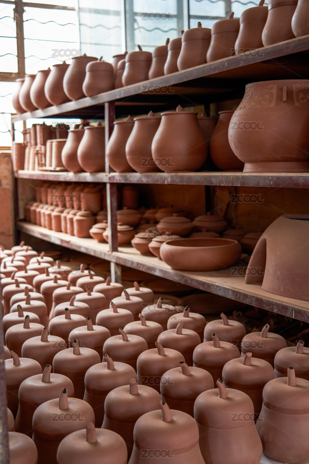 中國傳統(tǒng)陶器工廠里碼放整齊的陶土胚和模具