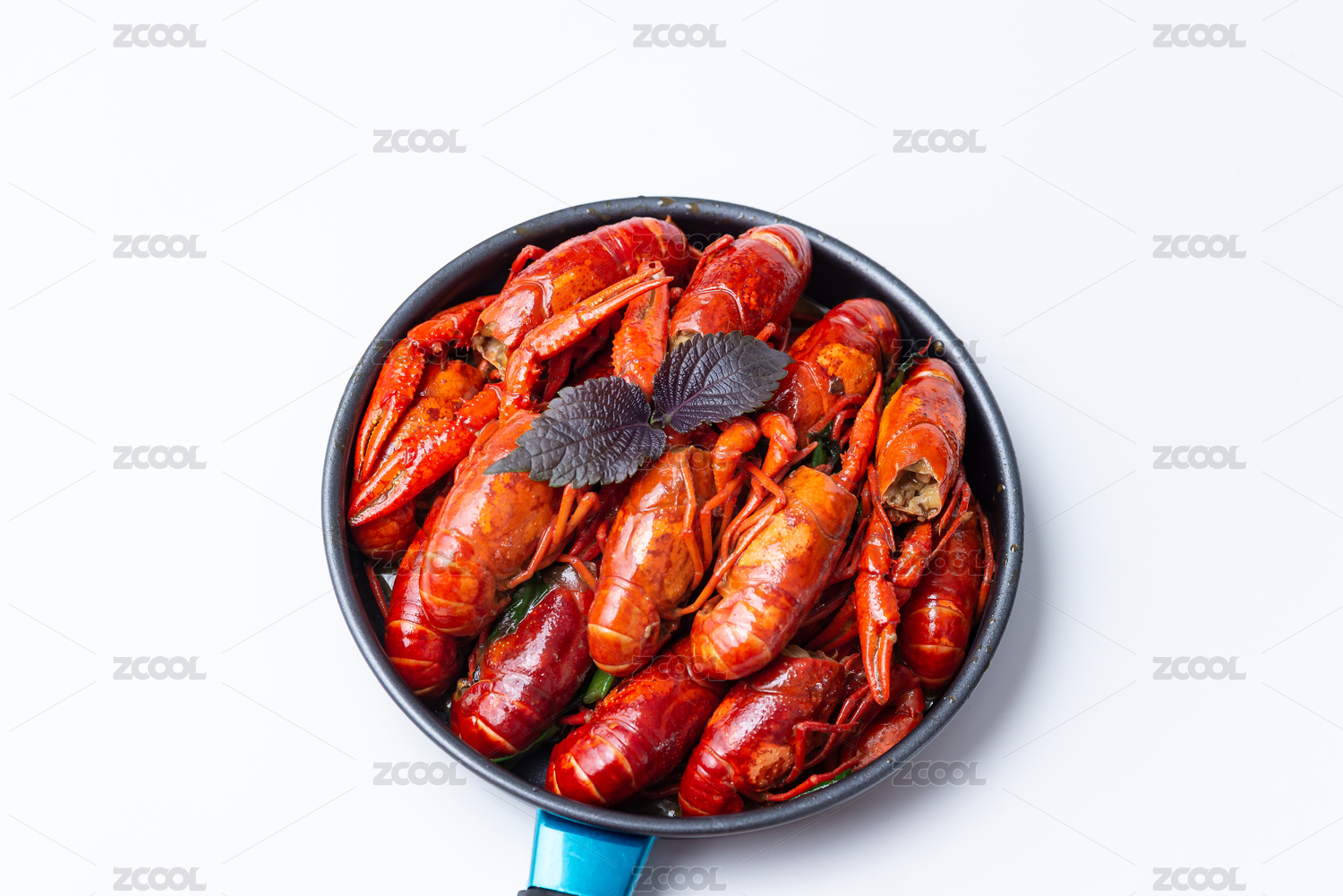 白底上擺放的一盤碼放整齊麻辣小龍蝦