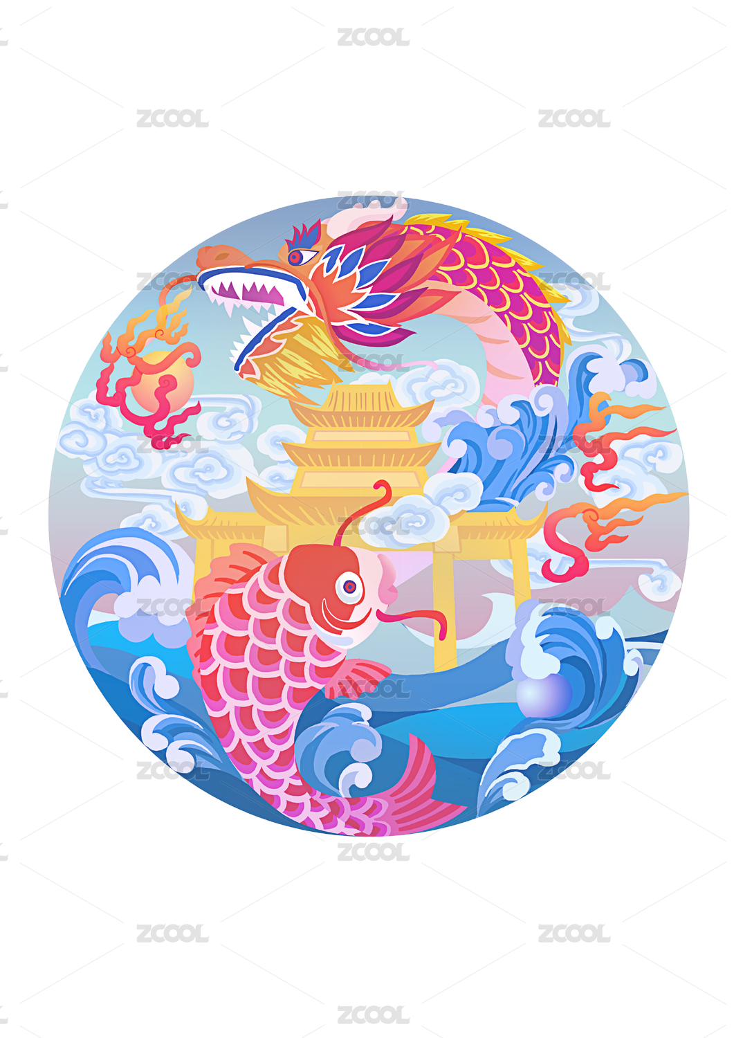 錦鯉躍龍門的中國(guó)風(fēng)插畫