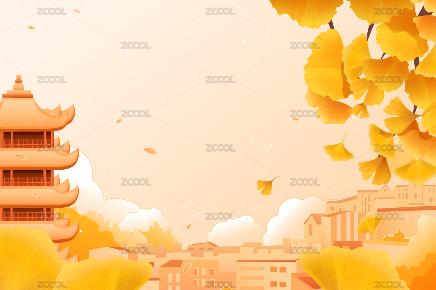 秋季銀杏古城背景矢量插畫