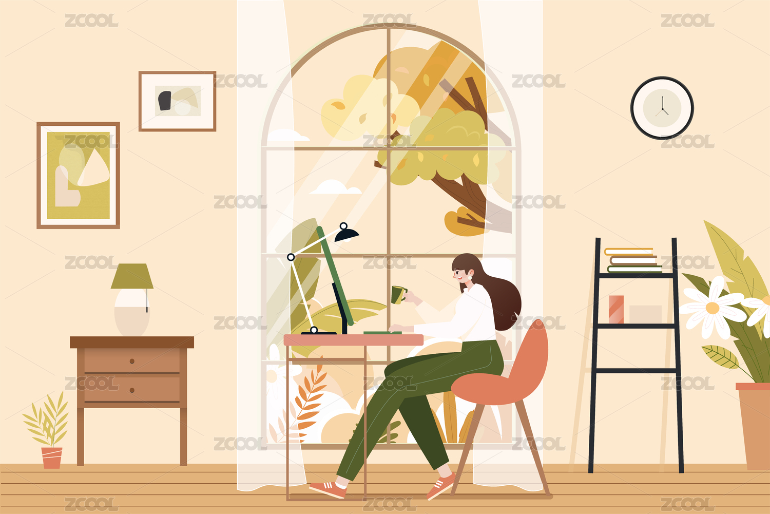 秋季臥室辦公插畫